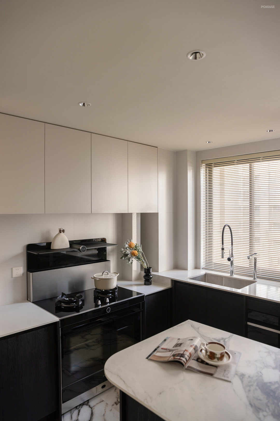 厨房和餐厅面积都不大,开放式餐岛厨一体设计消除空间隔阂,营造空间的围合感