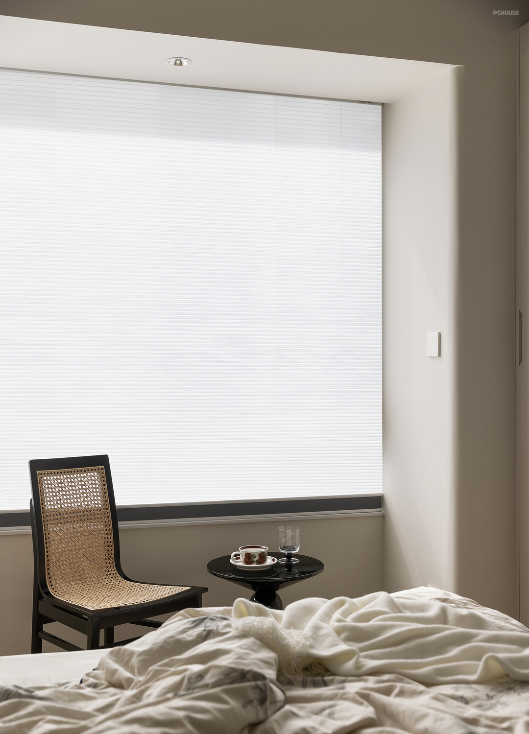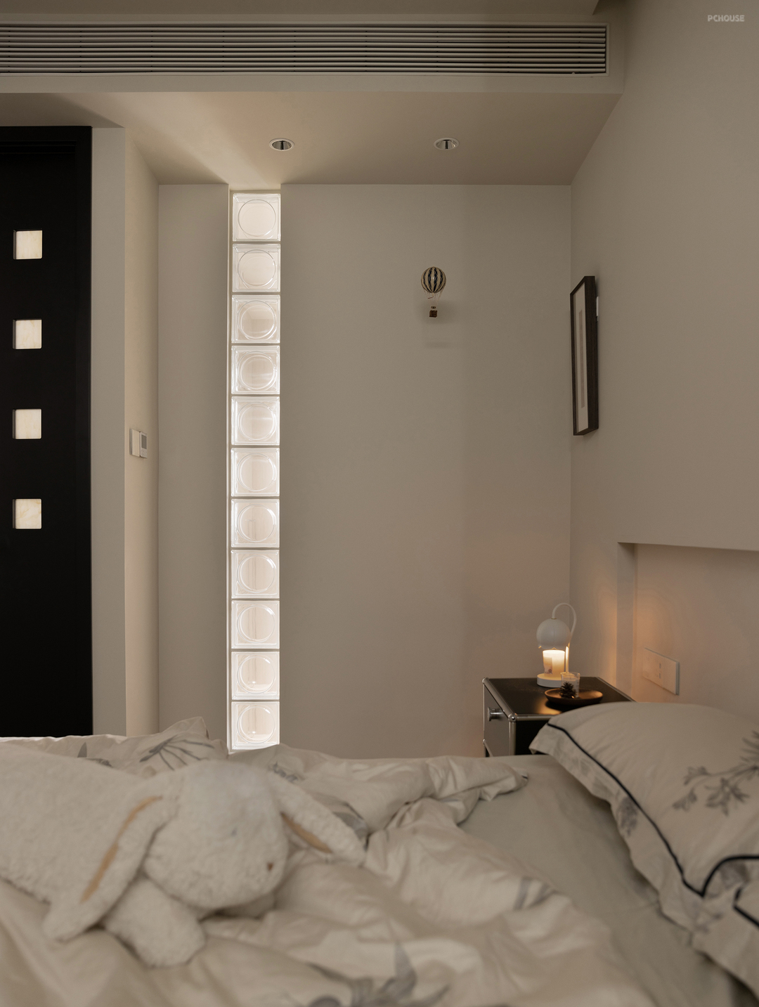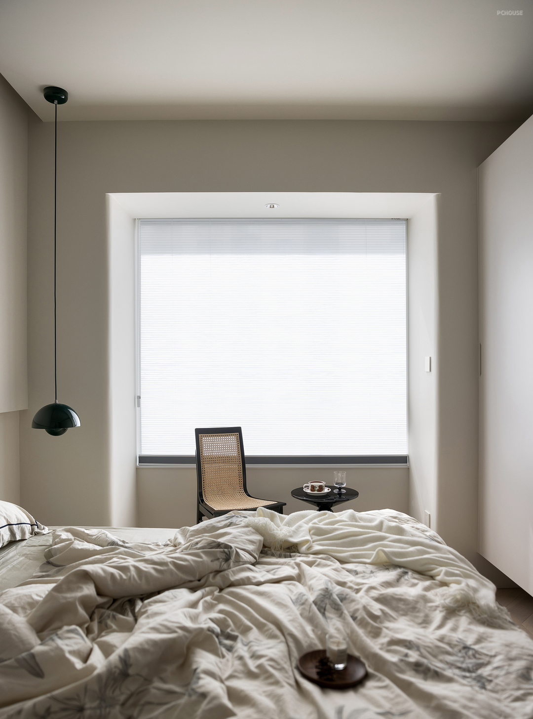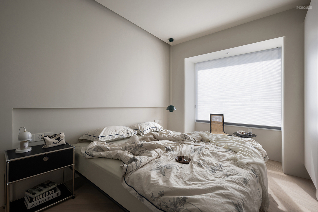 房间拥有充足的自然光,在卧室里没有特意购买床头靠背,浅色调暗纹床品令整个空间更显宁静。
