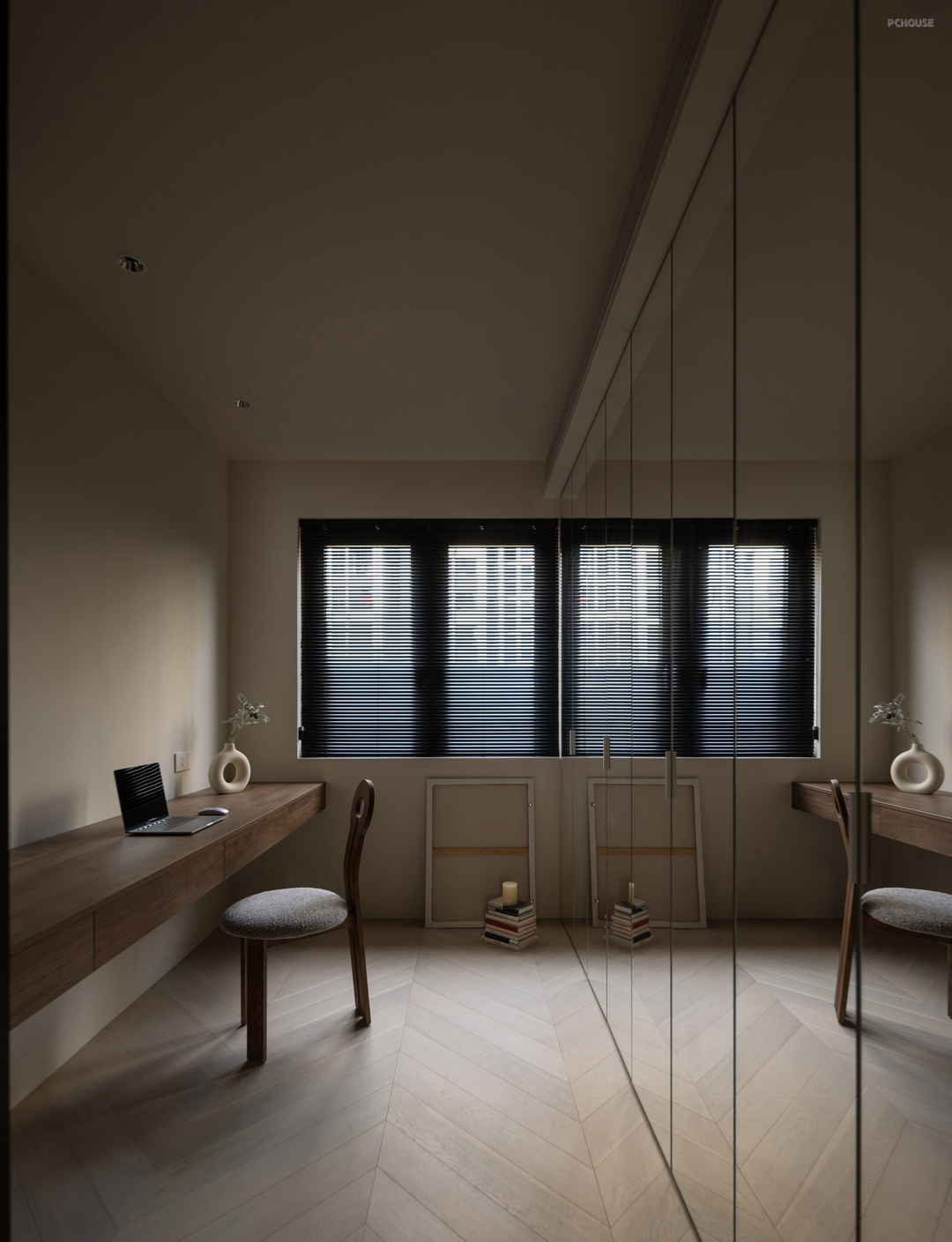 书房兼具衣帽间功能,折叠玻璃门和金属挂衣区组合,利用5扇开合有度的折叠玻璃门和金属挂衣区的组合设计,为空间赋予更加自由的功能变化,一开一合间,都是对空间功能的精细划分。书房门对卧室门,对称与开放的美学,具有某种特殊的吸引力.