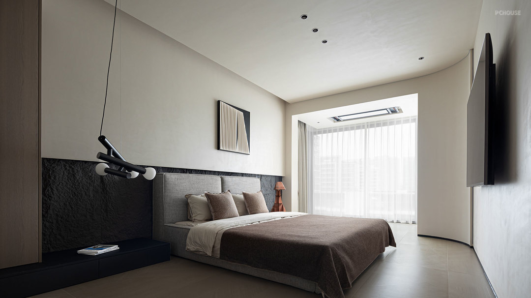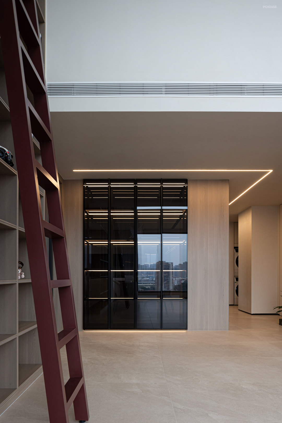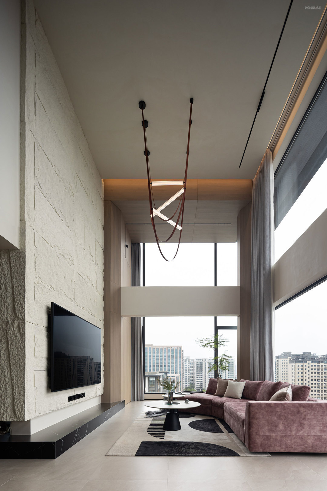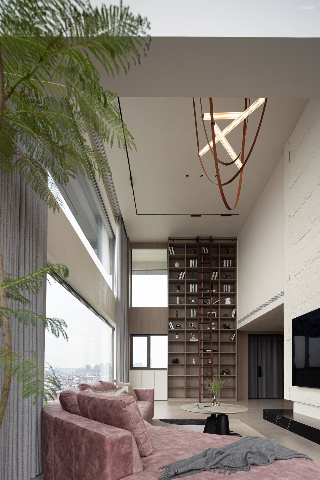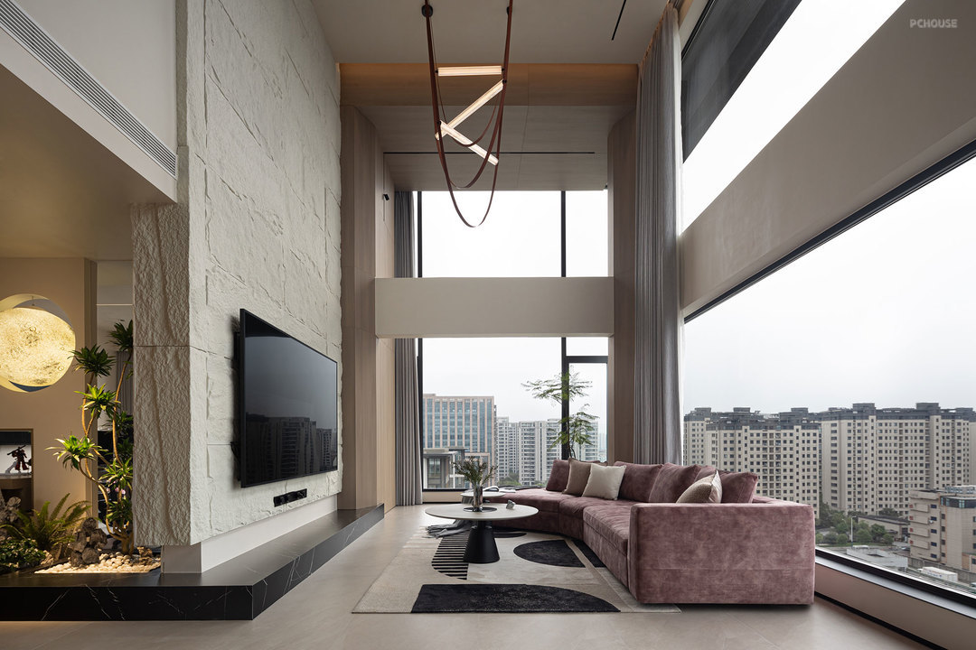 客厅的满墙书架,红色的楼梯,横向大块的全景玻璃窗,天空中垂落下来的皮带吊灯, 色彩在这里交错,不争先恐后,却彼此辉映。材质在此碰撞,冷峻的石材与柔软的织物交织,硬朗的结构与弧线的包裹对望,刚与柔彼此渗透,松弛与秩序相互平衡。