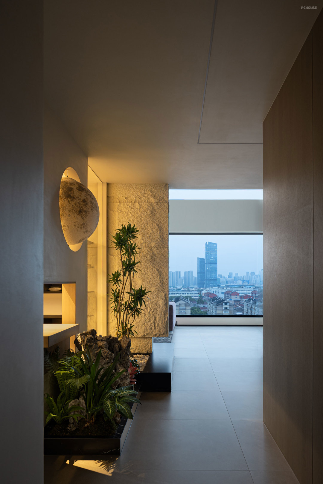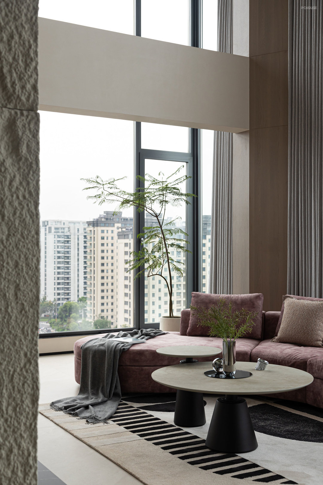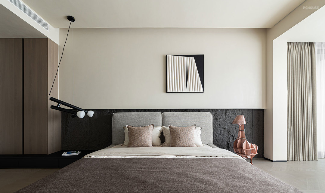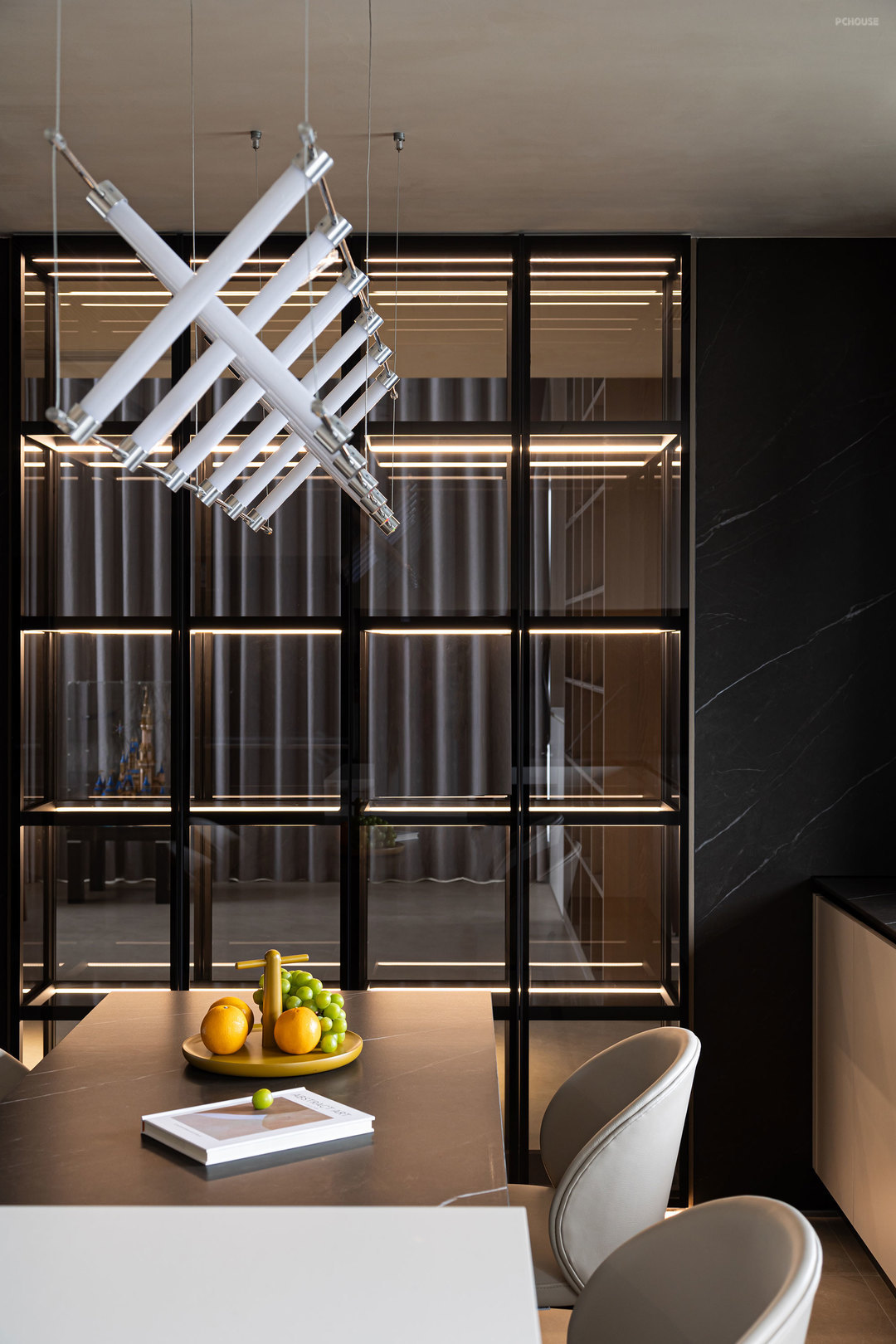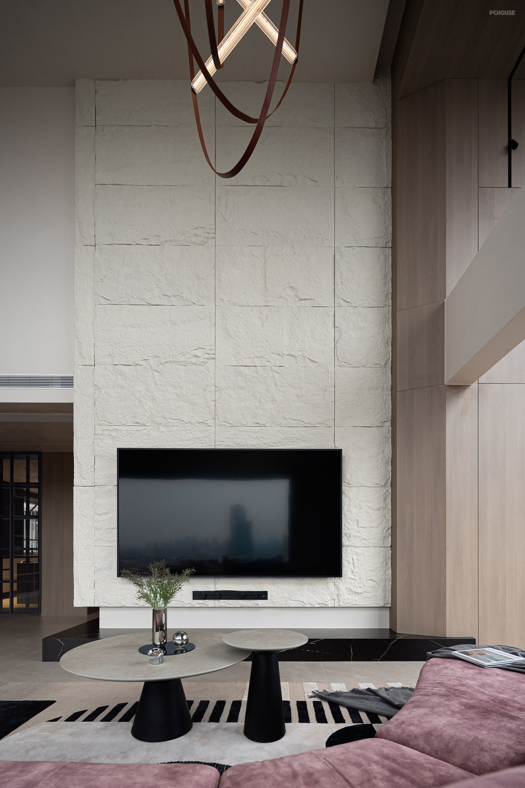 客厅的满墙书架,红色的楼梯,横向大块的全景玻璃窗,天空中垂落下来的皮带吊灯, 色彩在这里交错,不争先恐后,却彼此辉映。材质在此碰撞,冷峻的石材与柔软的织物交织,硬朗的结构与弧线的包裹对望,刚与柔彼此渗透,松弛与秩序相互平衡。