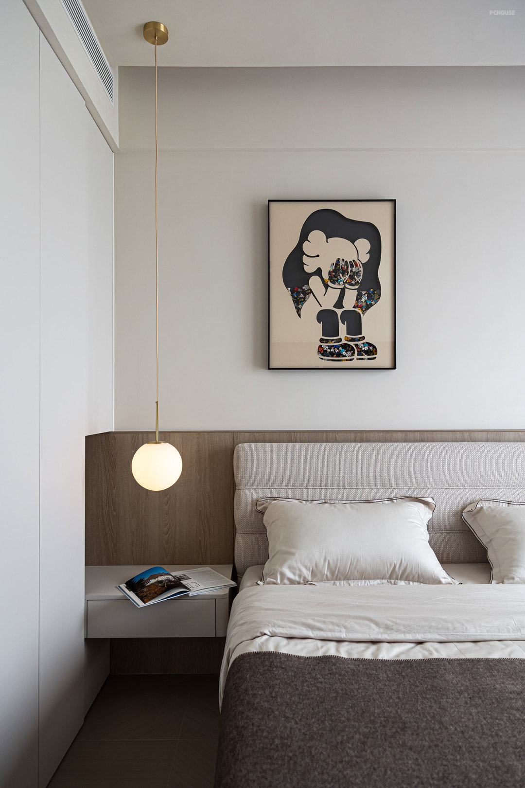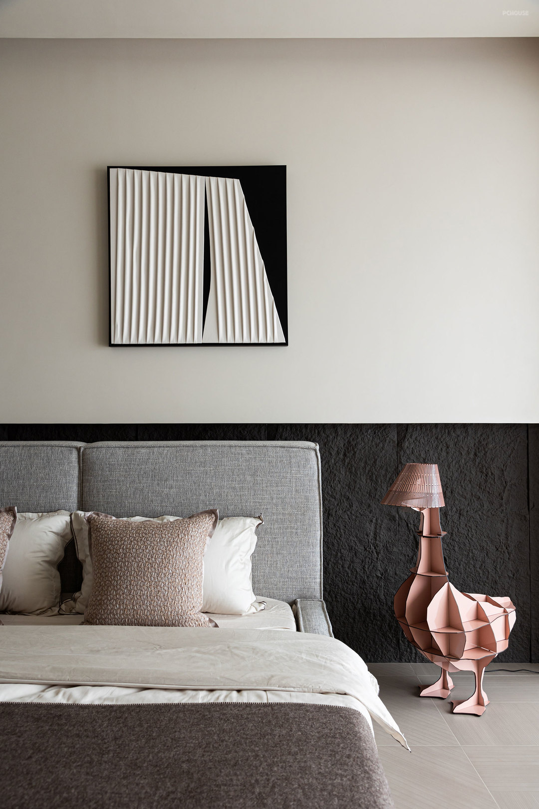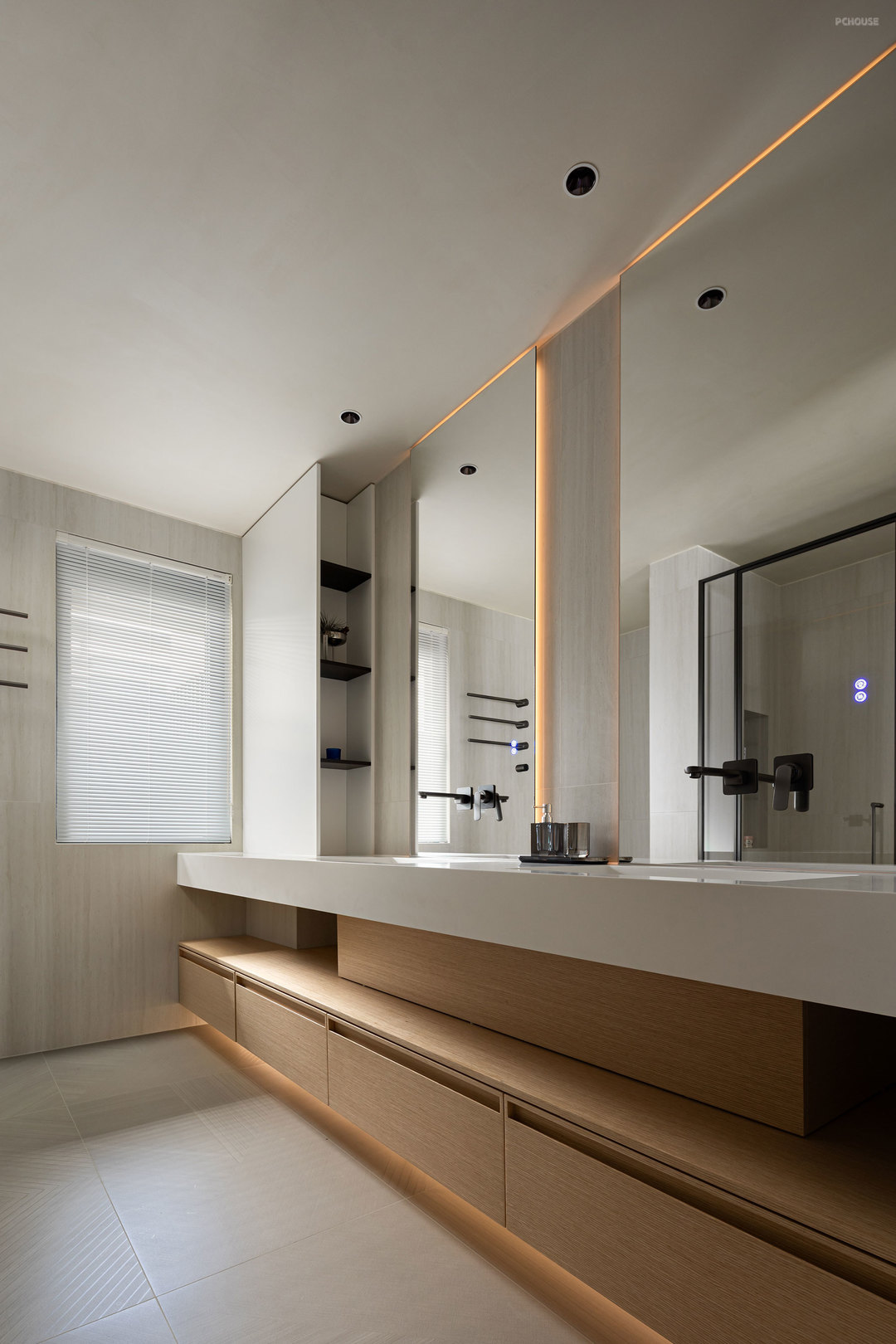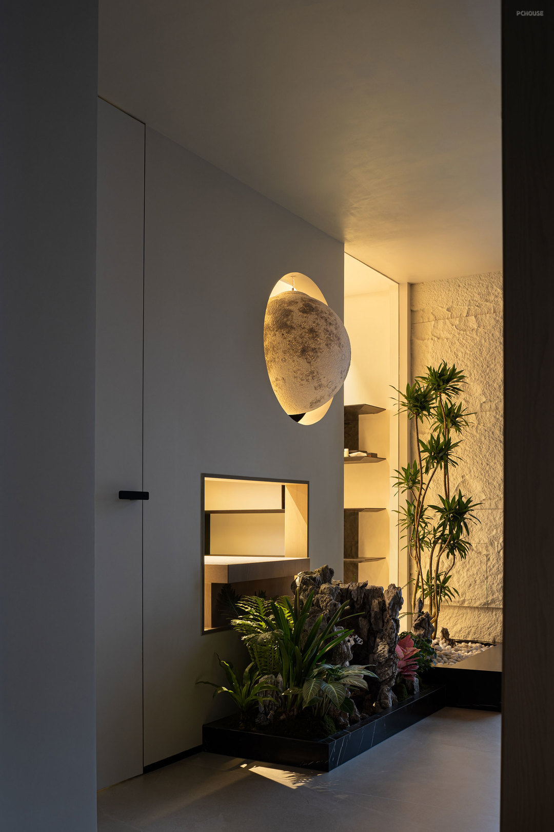 客厅的满墙书架,红色的楼梯,横向大块的全景玻璃窗,天空中垂落下来的皮带吊灯, 色彩在这里交错,不争先恐后,却彼此辉映。材质在此碰撞,冷峻的石材与柔软的织物交织,硬朗的结构与弧线的包裹对望,刚与柔彼此渗透,松弛与秩序相互平衡。