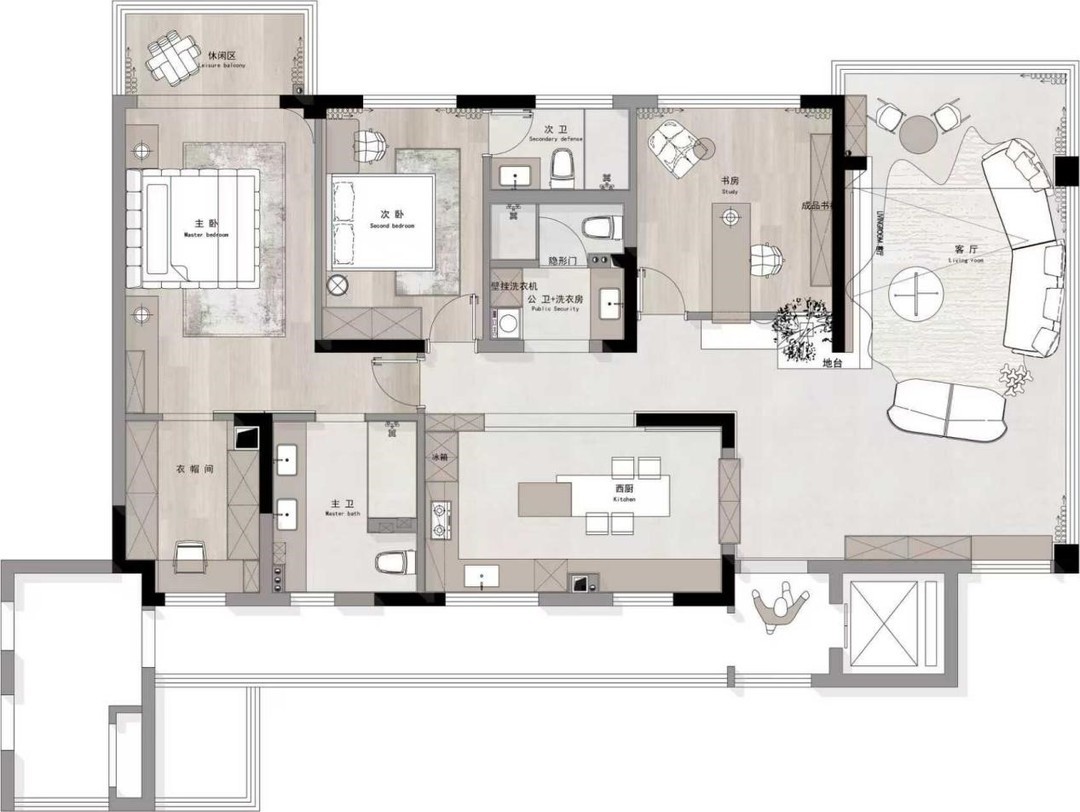空间,我们可以根据主人公的需求---“量身定制”。打破传统的餐厅厨房客厅必须联动的概念,我们把客厅尽量最大化,把北侧的空间合并成厨餐一体的社交厨房。根据业主未来十年内的生活需求,我们做了两个套房加一个多功能房,客厅及餐厅的尺度我们也尽量最大化,保证每个空间的舒适开阔度。
