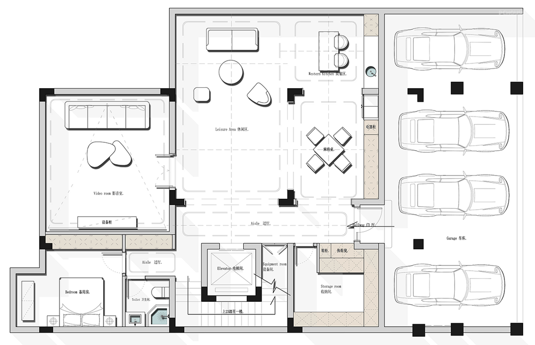整个地下室,分上下2层,半挑高设计,入户就是一个收纳和卫生间的功能区域,满足业主平时健身完,在这里换洗出门的一个动态需求。半挑高的空间,是有一种入户豁然开朗的视觉空间感。