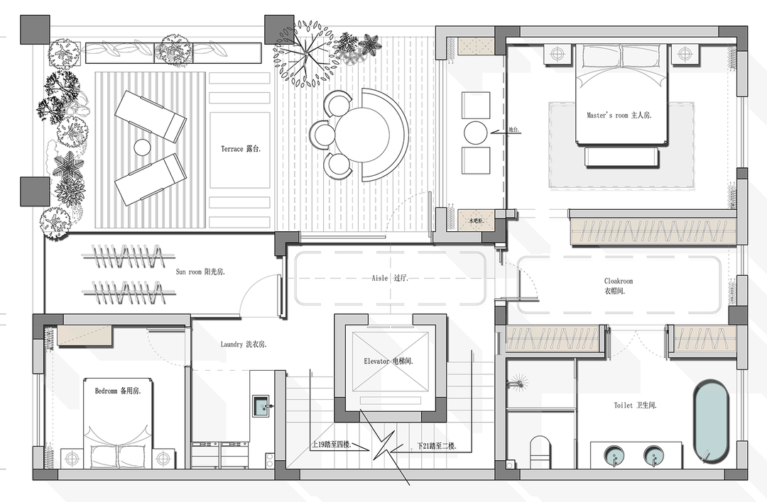 地下室我们是做了一个半挑高的设计,一方面我们要满足业主的攀岩墙的需求,另一方面半挑高的设计可以更加丰富地下室的功能。