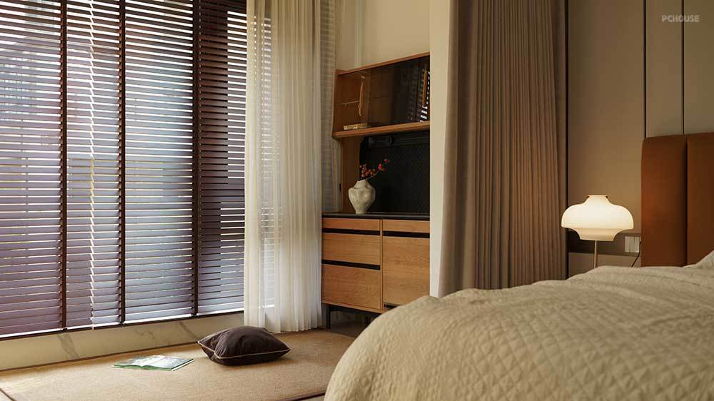 卧室的硬装以精装为主,设计师只是增加了一个阳台的融入,变成一个榻榻米的休闲空间,还加入了一个咖啡角,来增加空间的便利性。业主是一个非常懂得生活的人,空间里很多软装都是来自于业主之前家里比如名品灯具/床头柜还有一个电视柜都保养的非常好。即使当下使用也是毫无违和感。