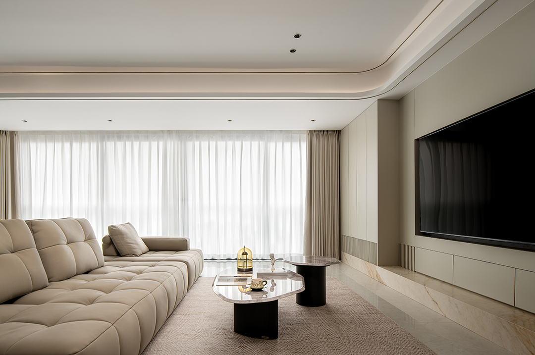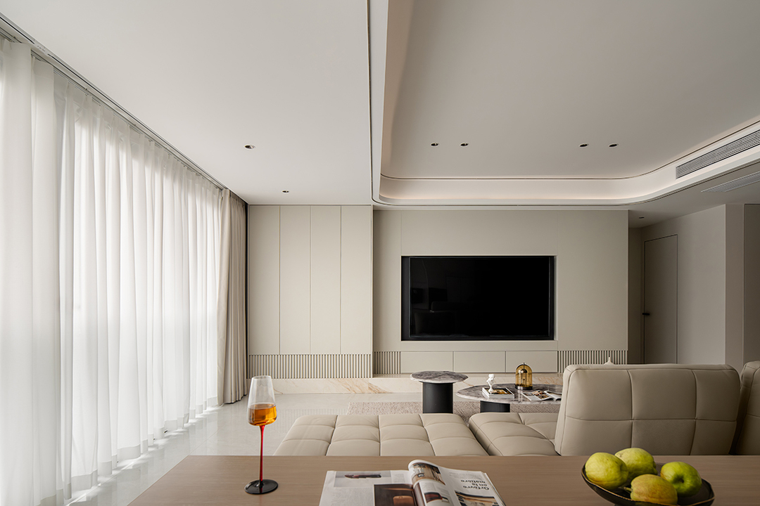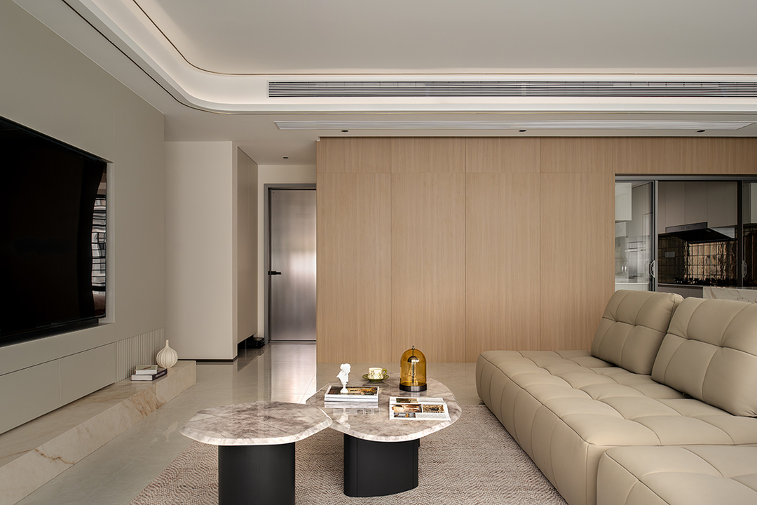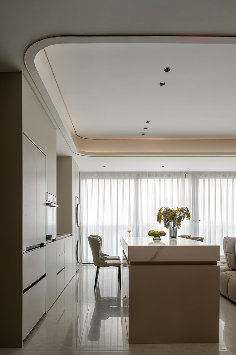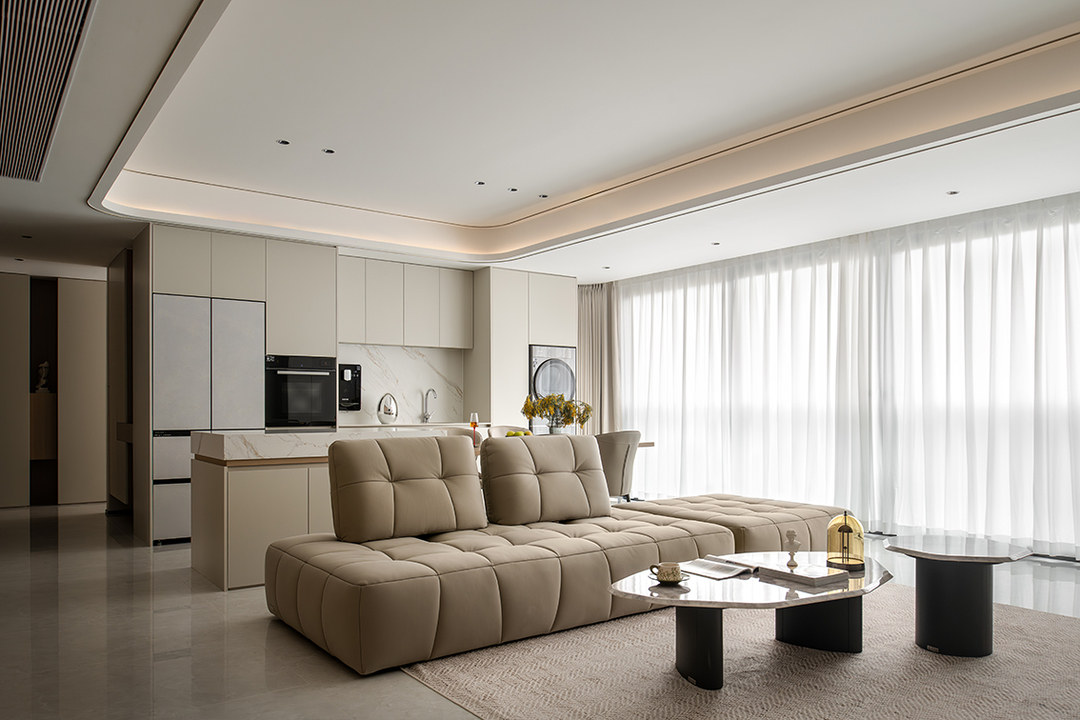 前言: 本案例是一套现代简约的风格,主要呈现简洁流畅的空间,整体家居色彩采用了米色,杏色,白色局部采用了金色,让整体空间更精致。整个色调让空间开阔舒适且时尚,让居家氛围更有松弛感,如春日的微风,缓缓且暖暖。客厅的过道用木饰面让整个空间层次感更丰富的同时也柔和了客厅的温馨感。这样的空间摒弃了繁杂,以纯粹的色调和质感构建简约的框架,让空间开阔通透,契合现代简约追求的少即是多。客厅吊顶点缀了金属不锈钢,让客厅质感更强,电视墙的地台和餐区西厨的台面及岛台用了岩板,让整个空间层次分明的同时又让空间质感得以升华。营造了治愈氛围也消除了生活的疲惫感。