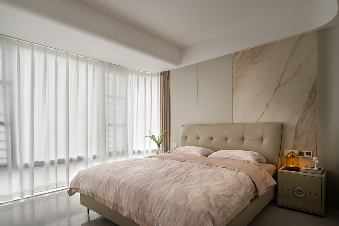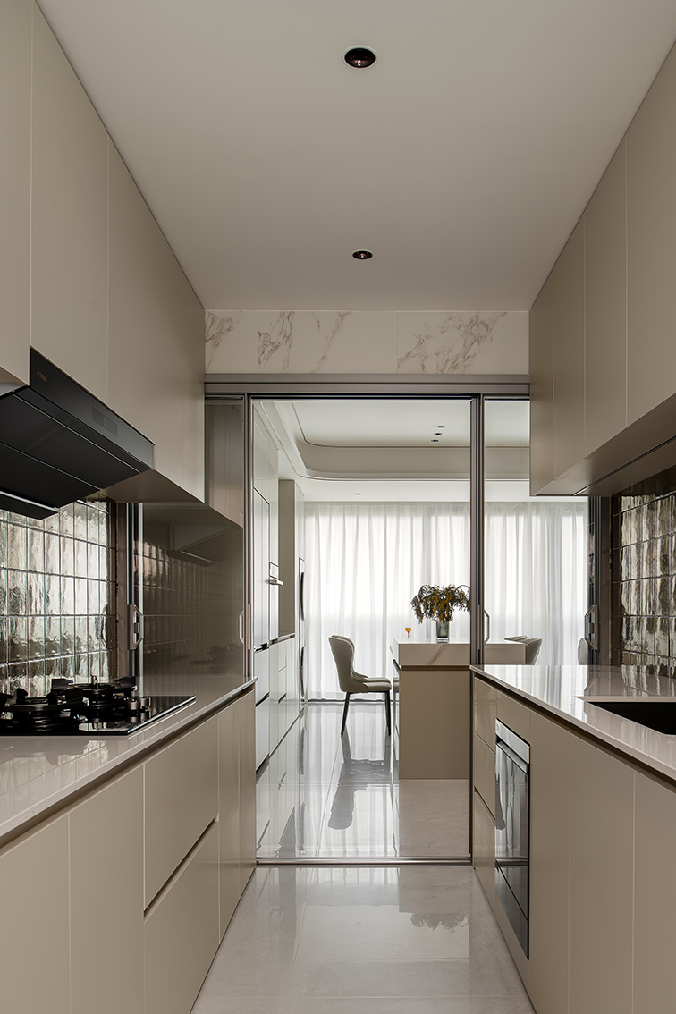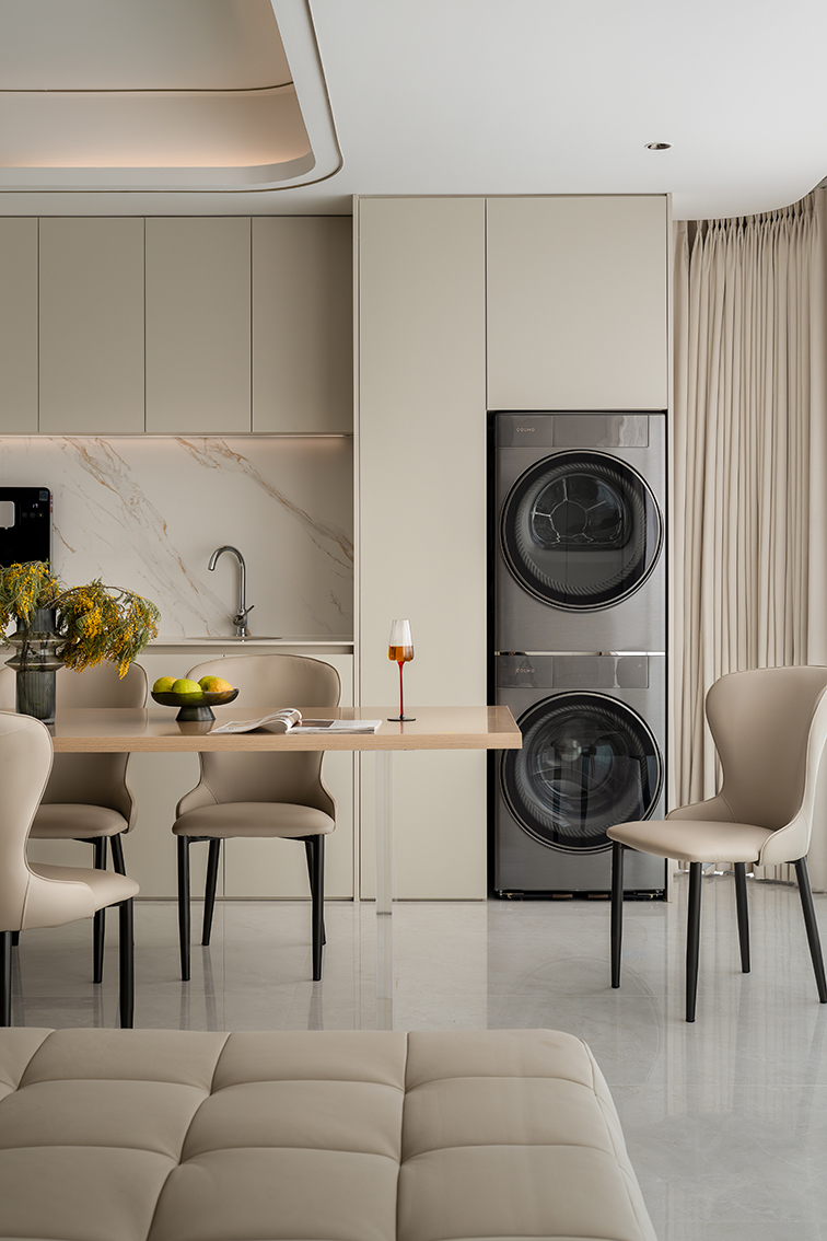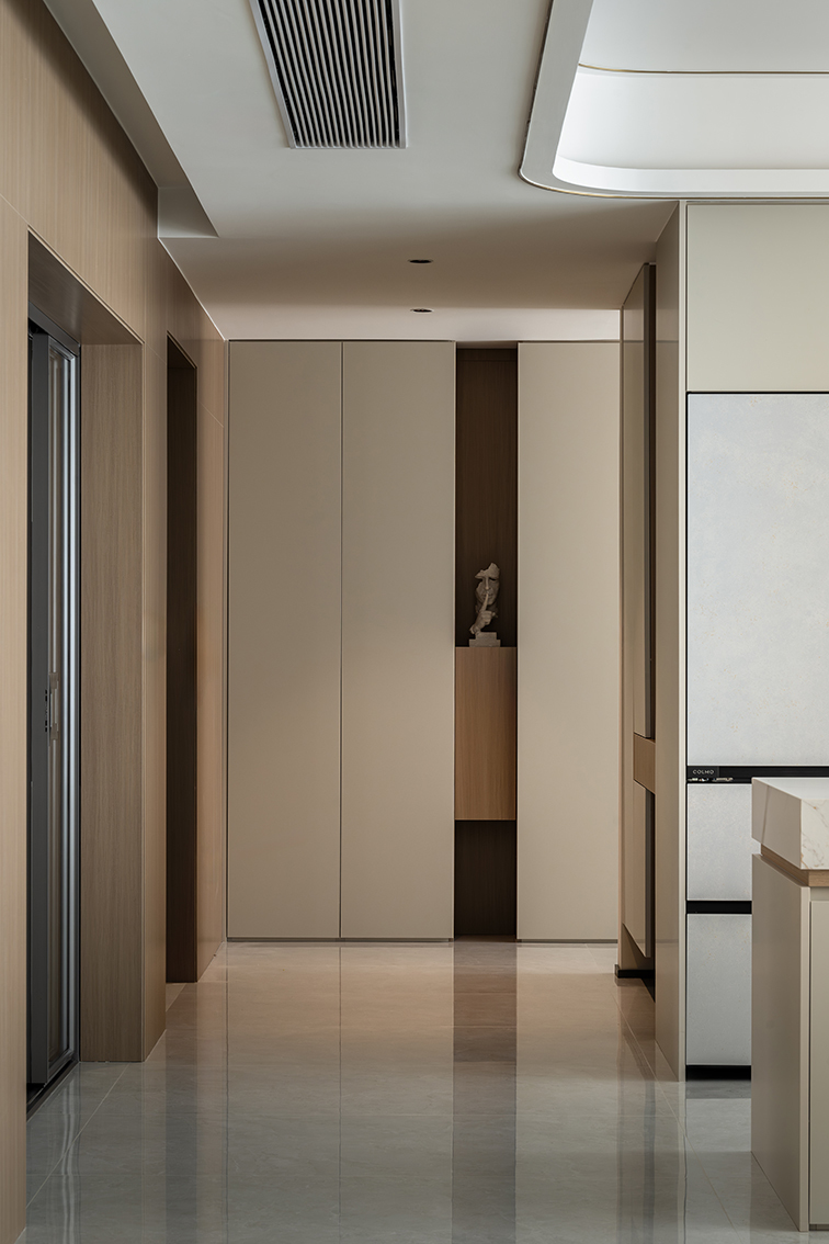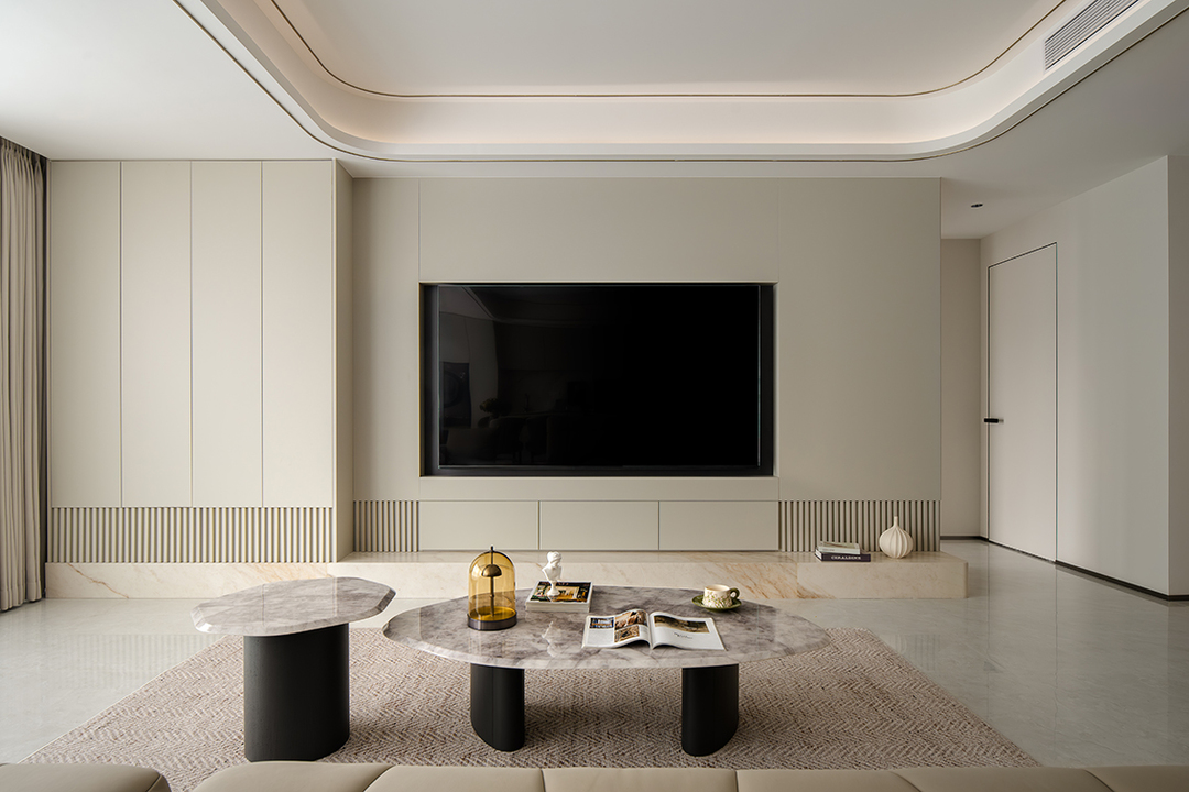 前言: 本案例是一套现代简约的风格,主要呈现简洁流畅的空间,整体家居色彩采用了米色,杏色,白色局部采用了金色,让整体空间更精致。整个色调让空间开阔舒适且时尚,让居家氛围更有松弛感,如春日的微风,缓缓且暖暖。客厅的过道用木饰面让整个空间层次感更丰富的同时也柔和了客厅的温馨感。这样的空间摒弃了繁杂,以纯粹的色调和质感构建简约的框架,让空间开阔通透,契合现代简约追求的少即是多。客厅吊顶点缀了金属不锈钢,让客厅质感更强,电视墙的地台和餐区西厨的台面及岛台用了岩板,让整个空间层次分明的同时又让空间质感得以升华。营造了治愈氛围也消除了生活的疲惫感。