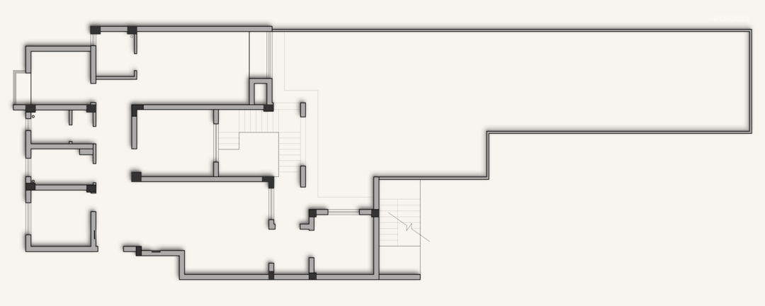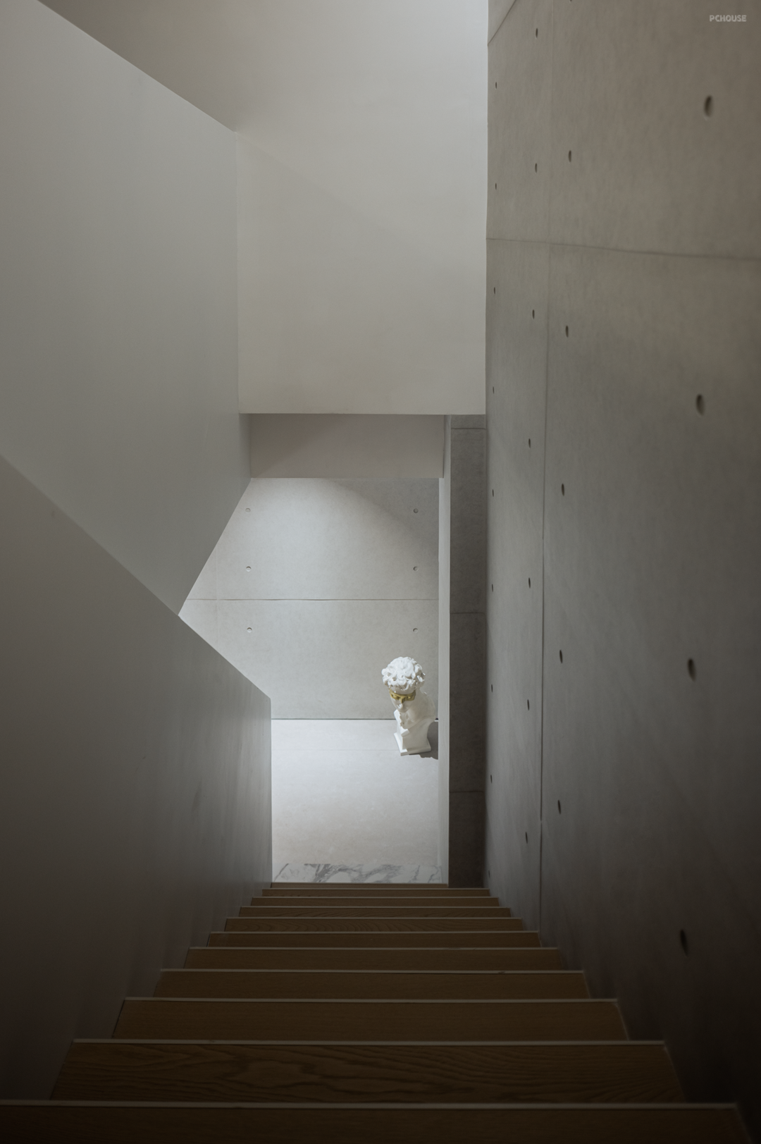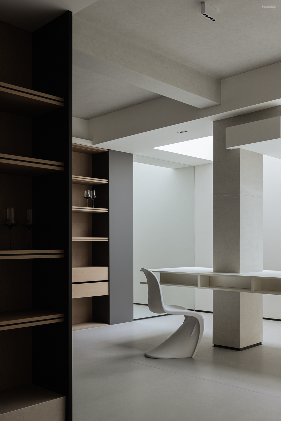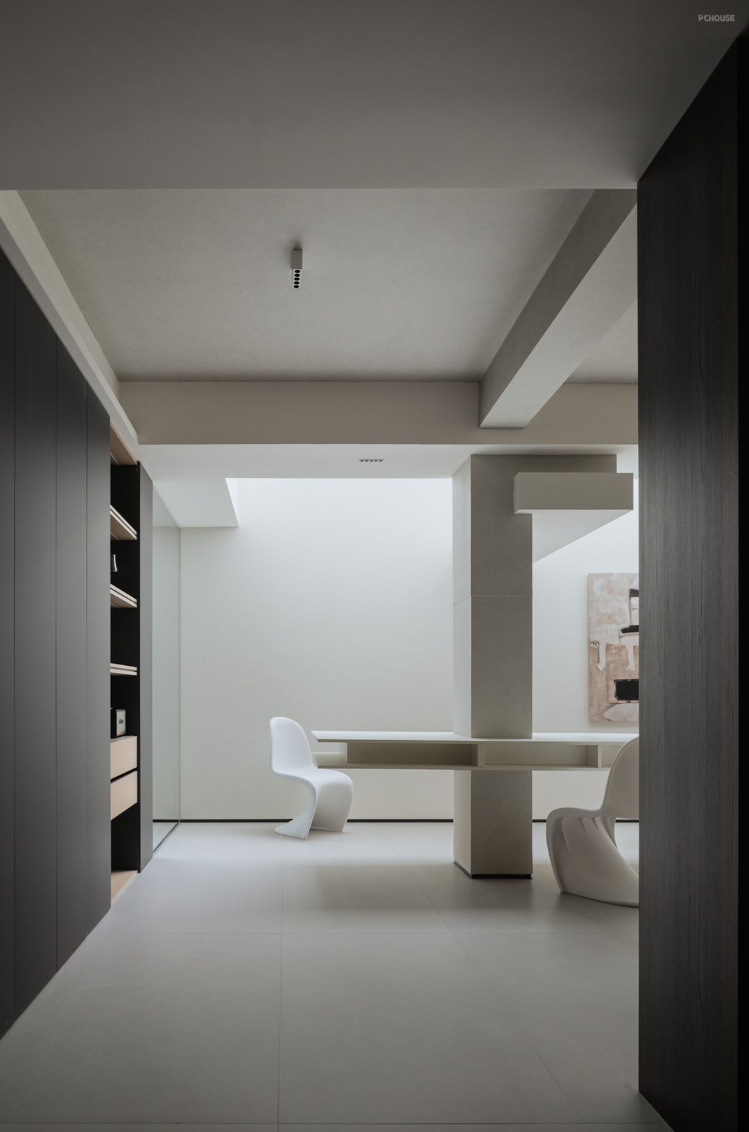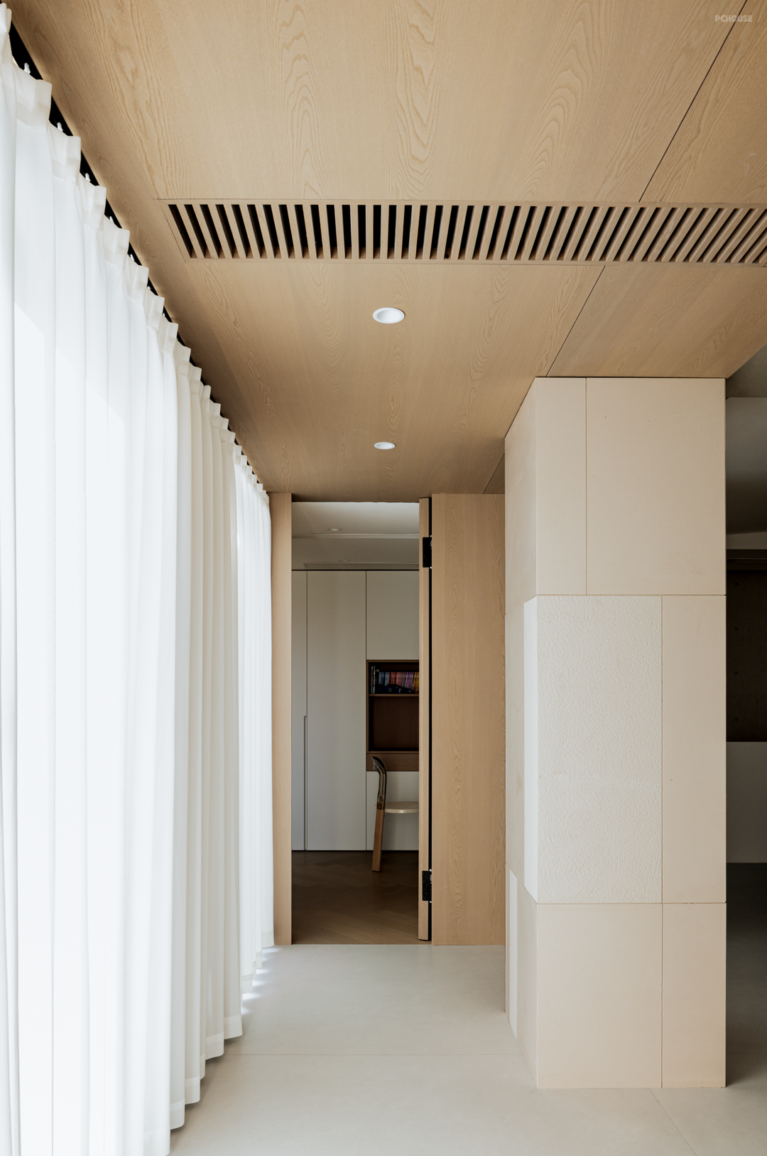 原始顶面梁体通过局部弧形吊顶巧妙包裹,流畅的曲线弱化了建筑结构的生硬感,营造柔和静谧的包裹式体验。