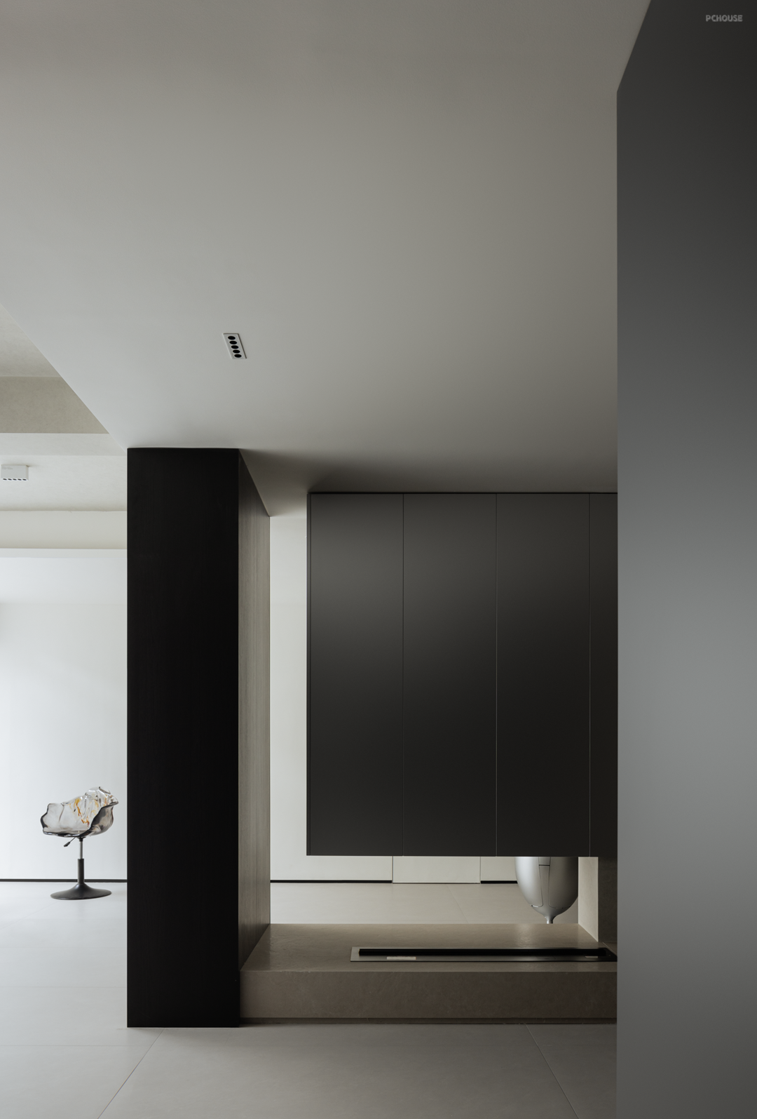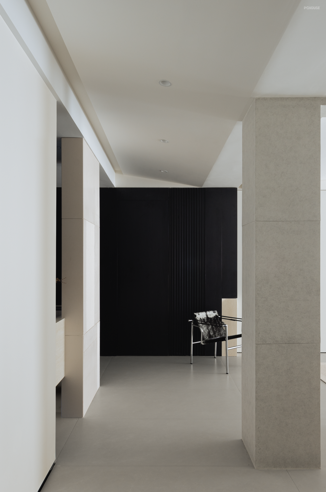 4.弱化和隐藏空间中承重柱的,用墙体与柜子包裹柱子,让整个开间更加和谐统一。