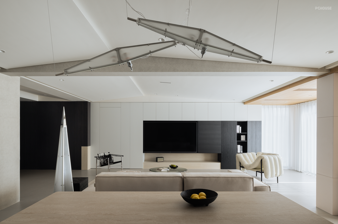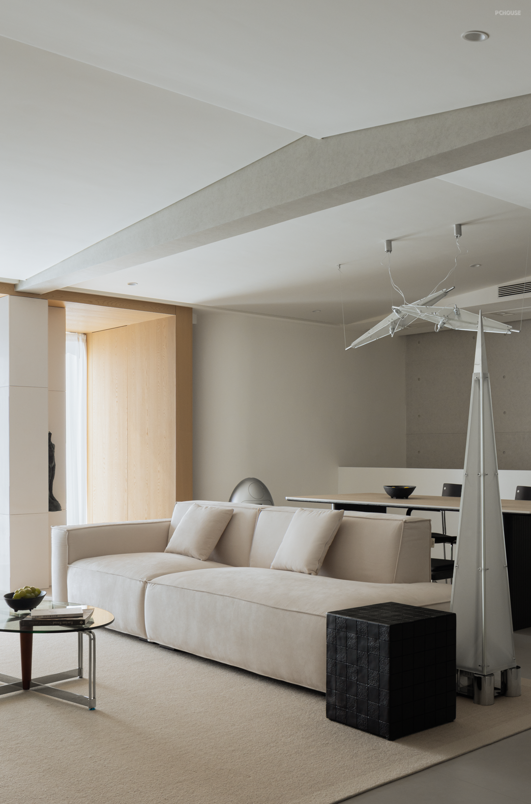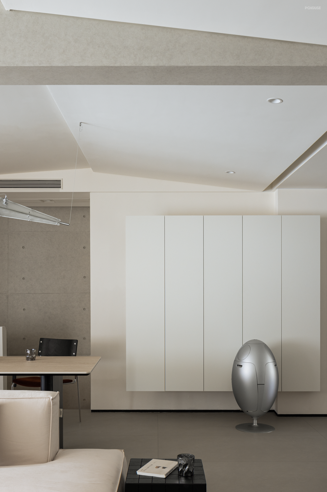 天花板的设计以几何为灵感,斜坡的松弛,都塑造了整个空间从容不迫的自由,搭配上自如的家具,慵懒、松散、惬意随之而来,完美的诠释了此处生活的理想模样,是幸福的,也是优雅的。