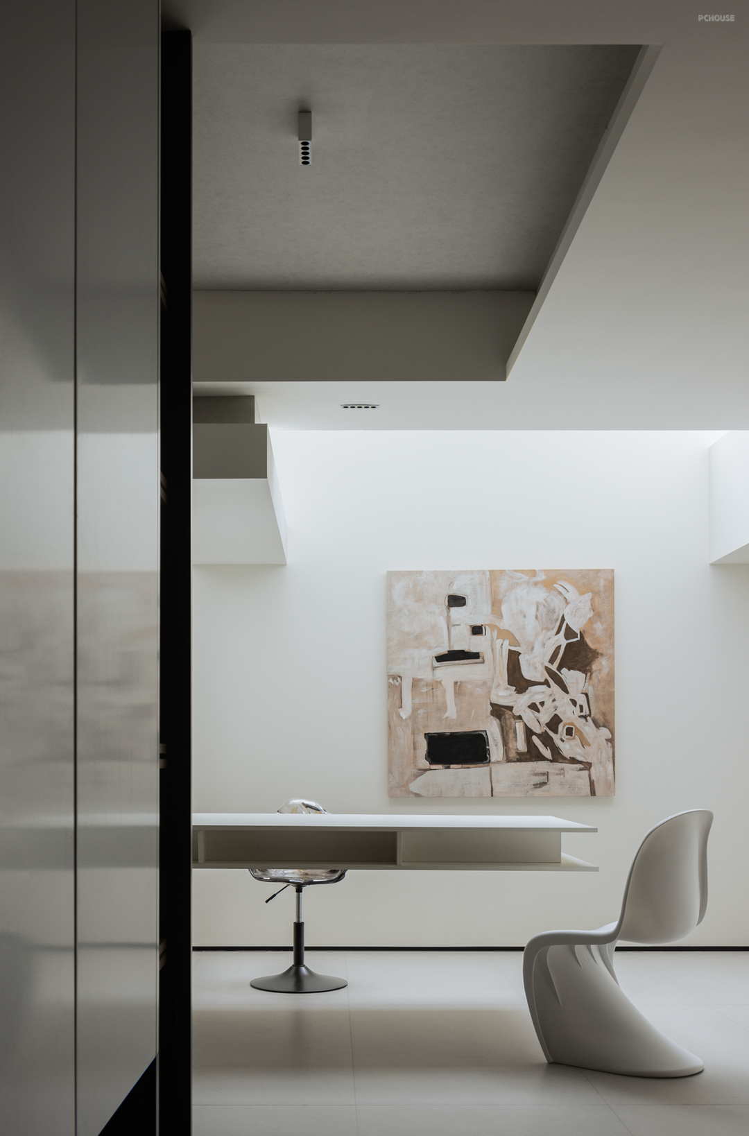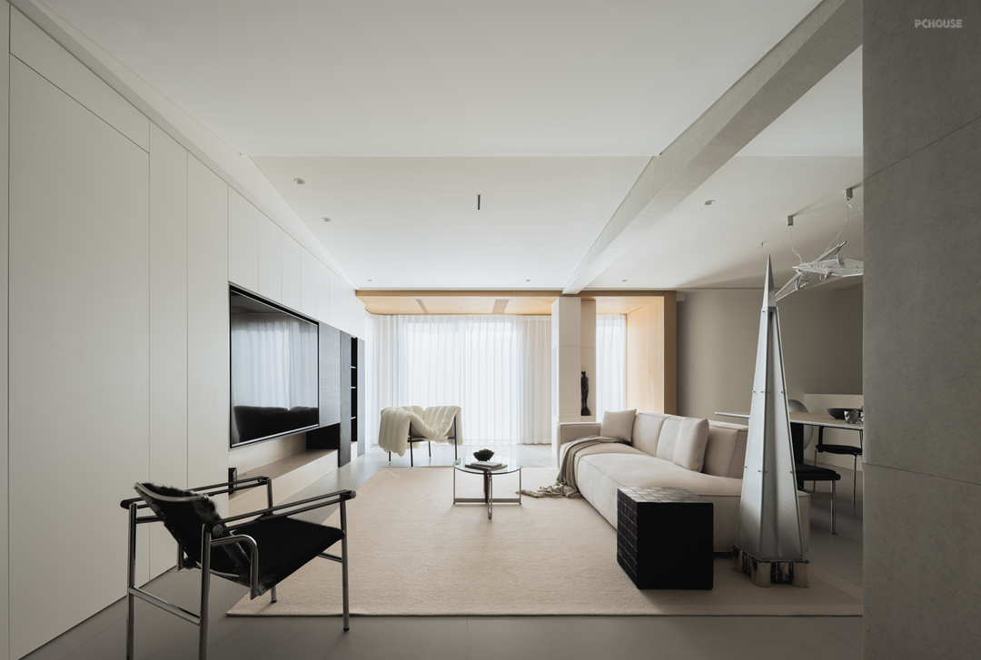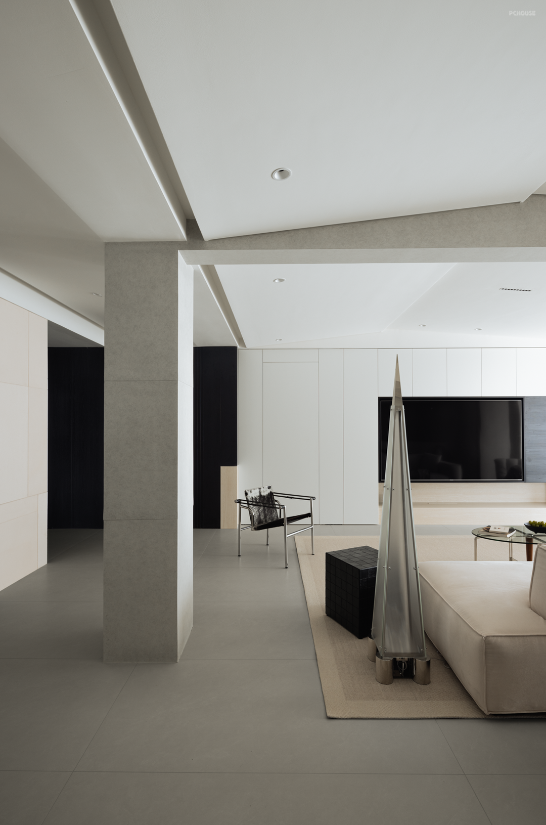天花板的设计以几何为灵感,斜坡的松弛,都塑造了整个空间从容不迫的自由,搭配上自如的家具,慵懒、松散、惬意随之而来,完美的诠释了此处生活的理想模样,是幸福的,也是优雅的。