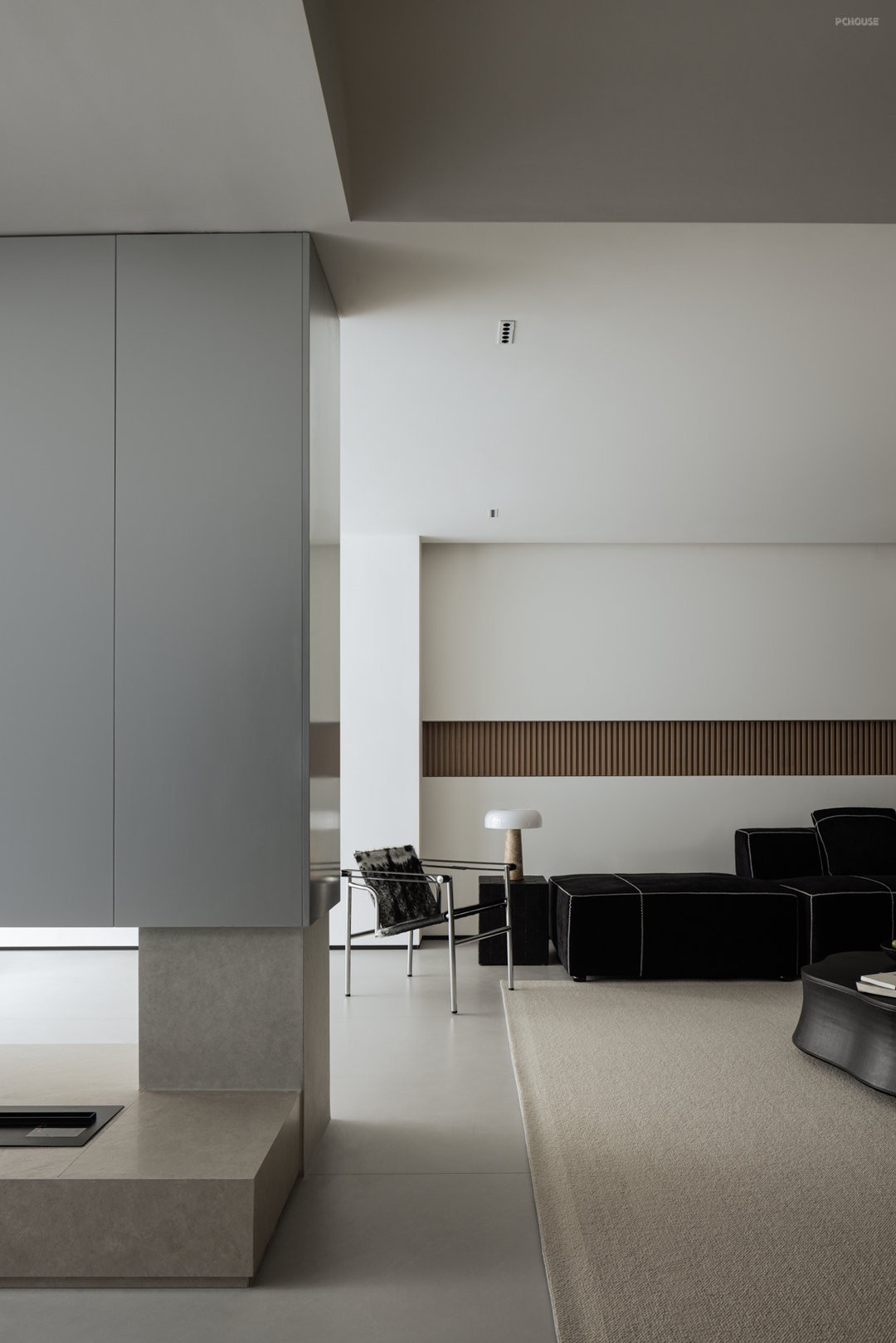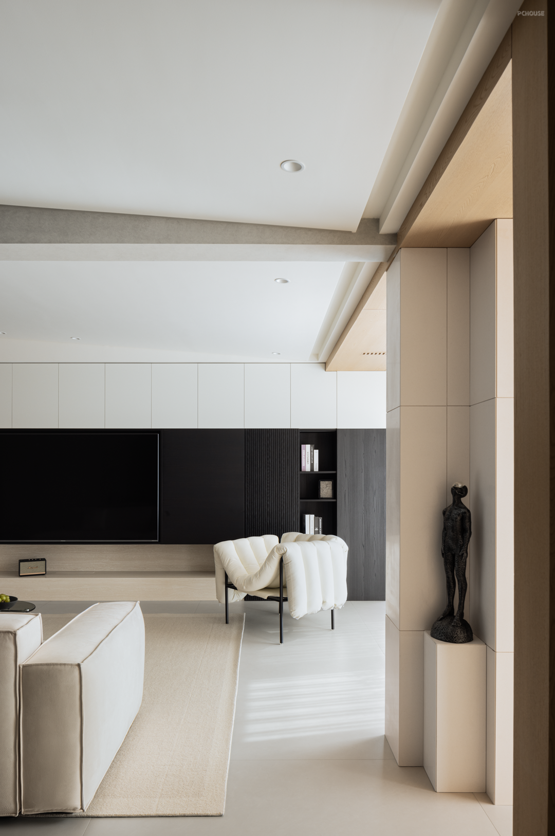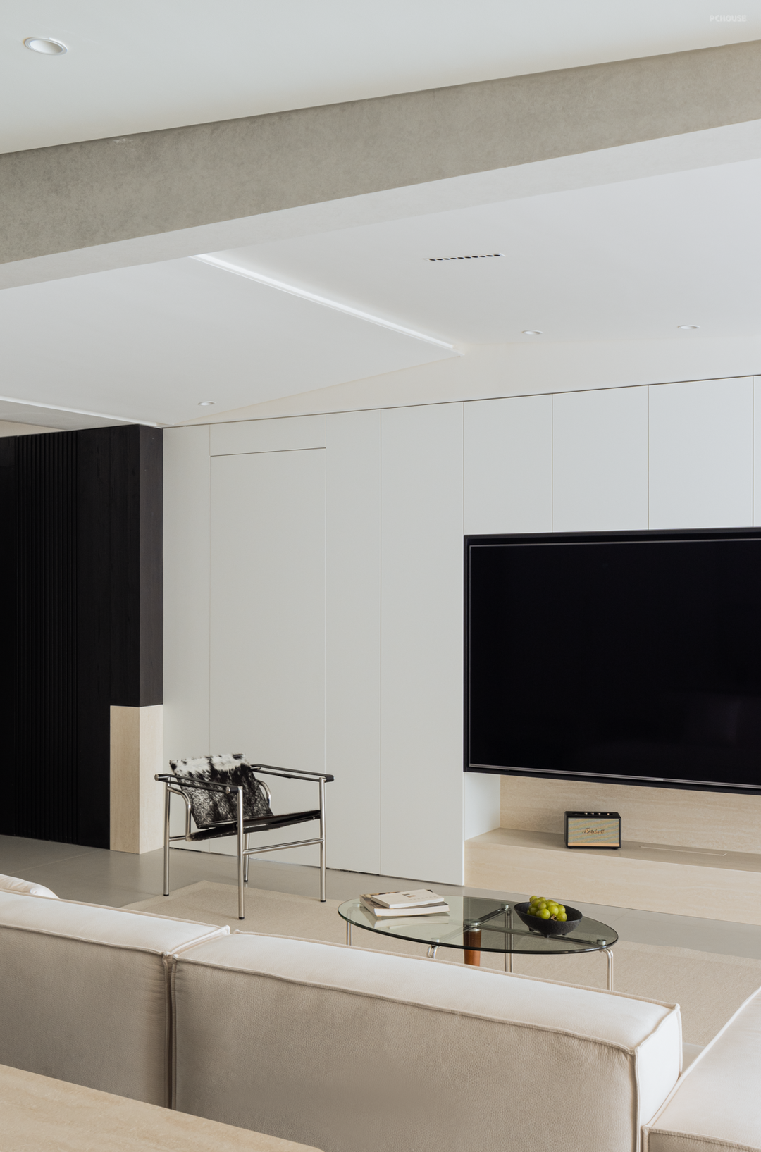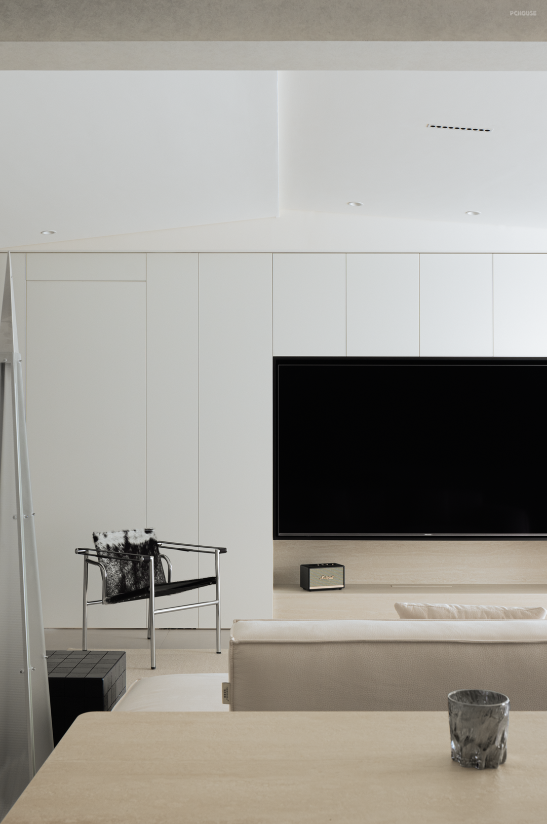 嵌入式电视背景墙简化造型,与整体黑白灰基调呼应,低调却不失质感。