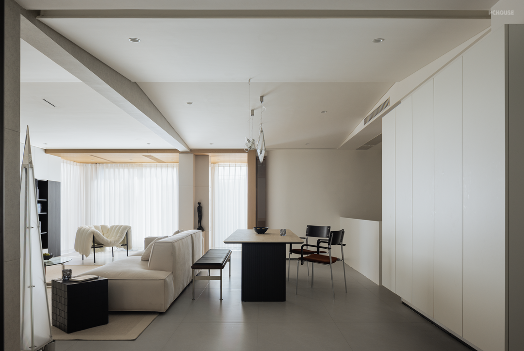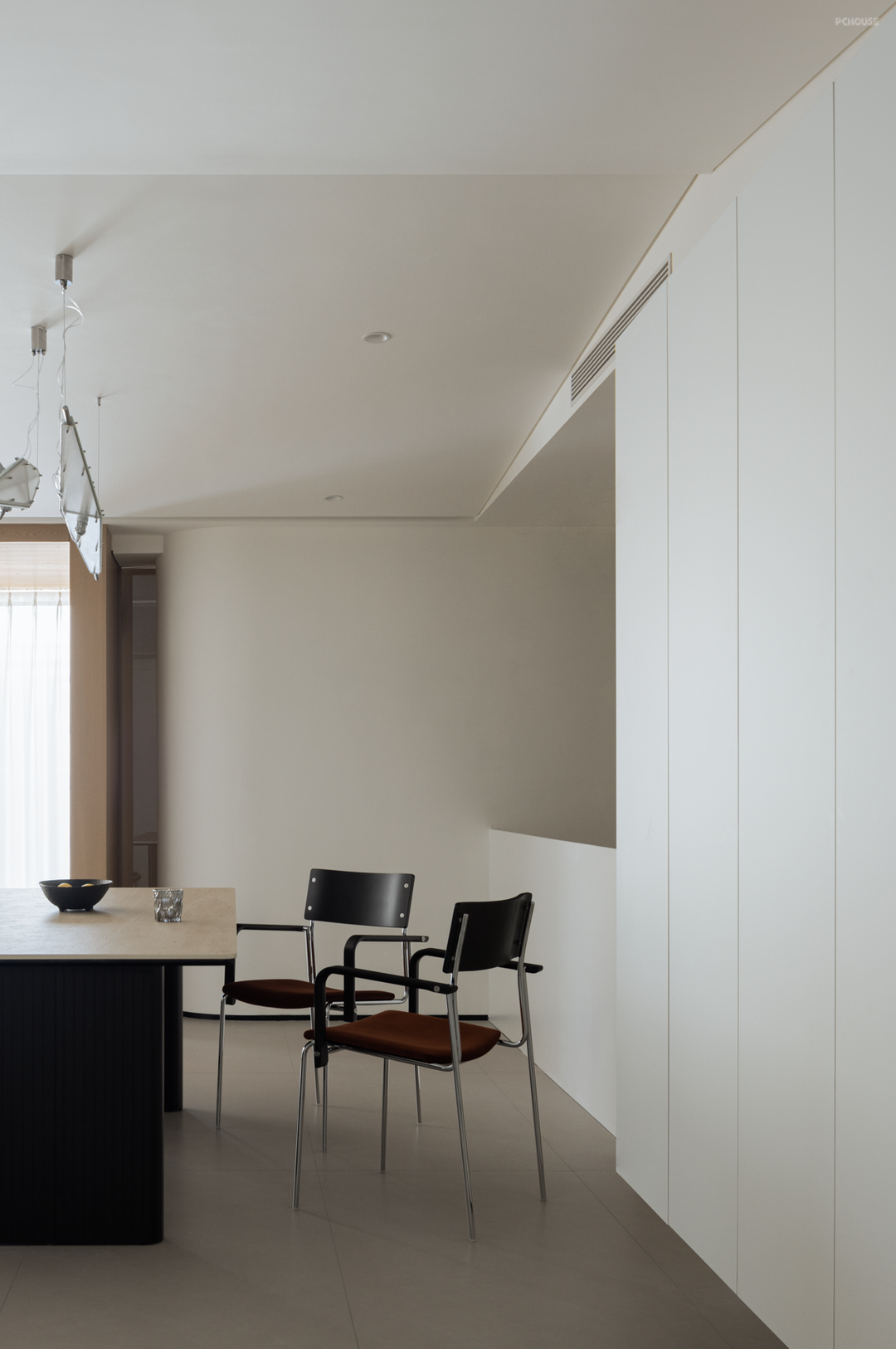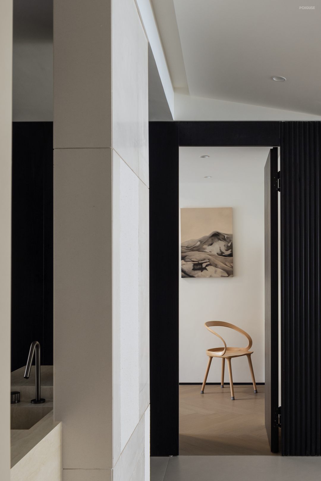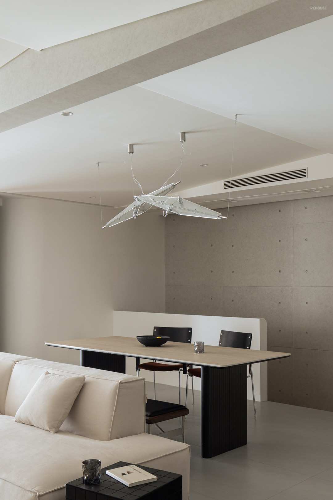 在开放式的客餐厅中,2.6米长的洞石岩板餐桌成为视觉重心。天然石材的粗犷肌理与整体黑白灰基调形成微妙对比,让用餐区在简约中透出自然气息。