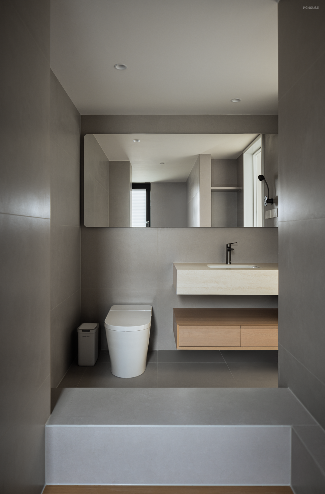 改变了干区台盆的位置显得既现代又实用,扩大了空间的视觉效果。台盆柜上下落地的镜子,增添了空间的趣味性。