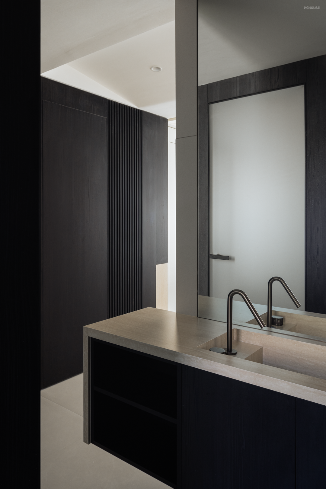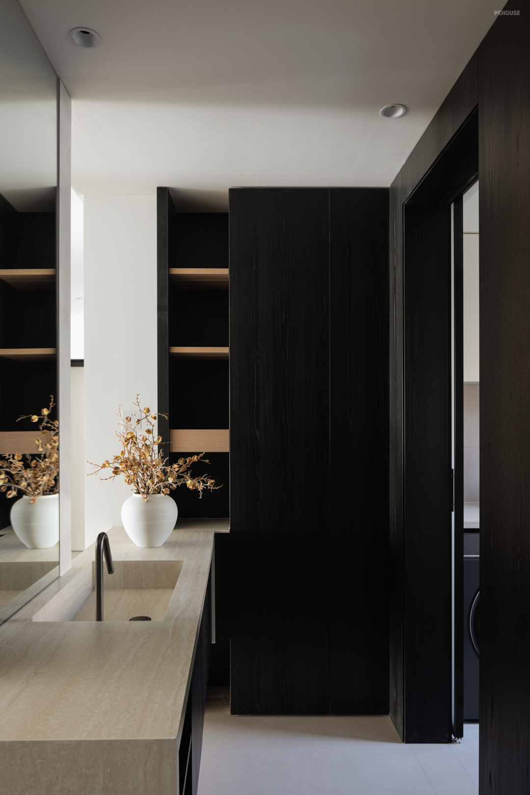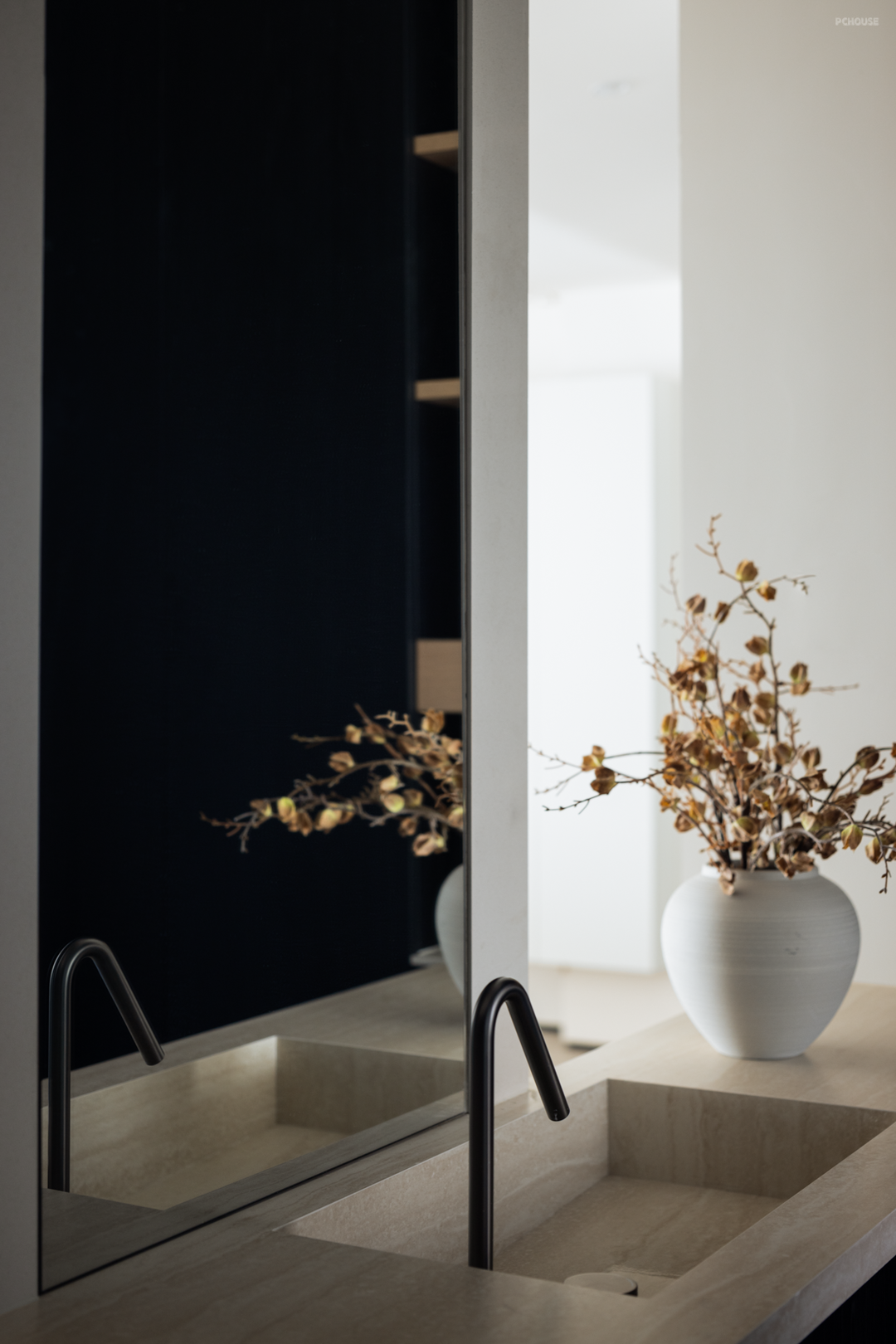 洞石一体悬空台盆干区设计,侧面嵌入储物柜,兼顾美观与实用。