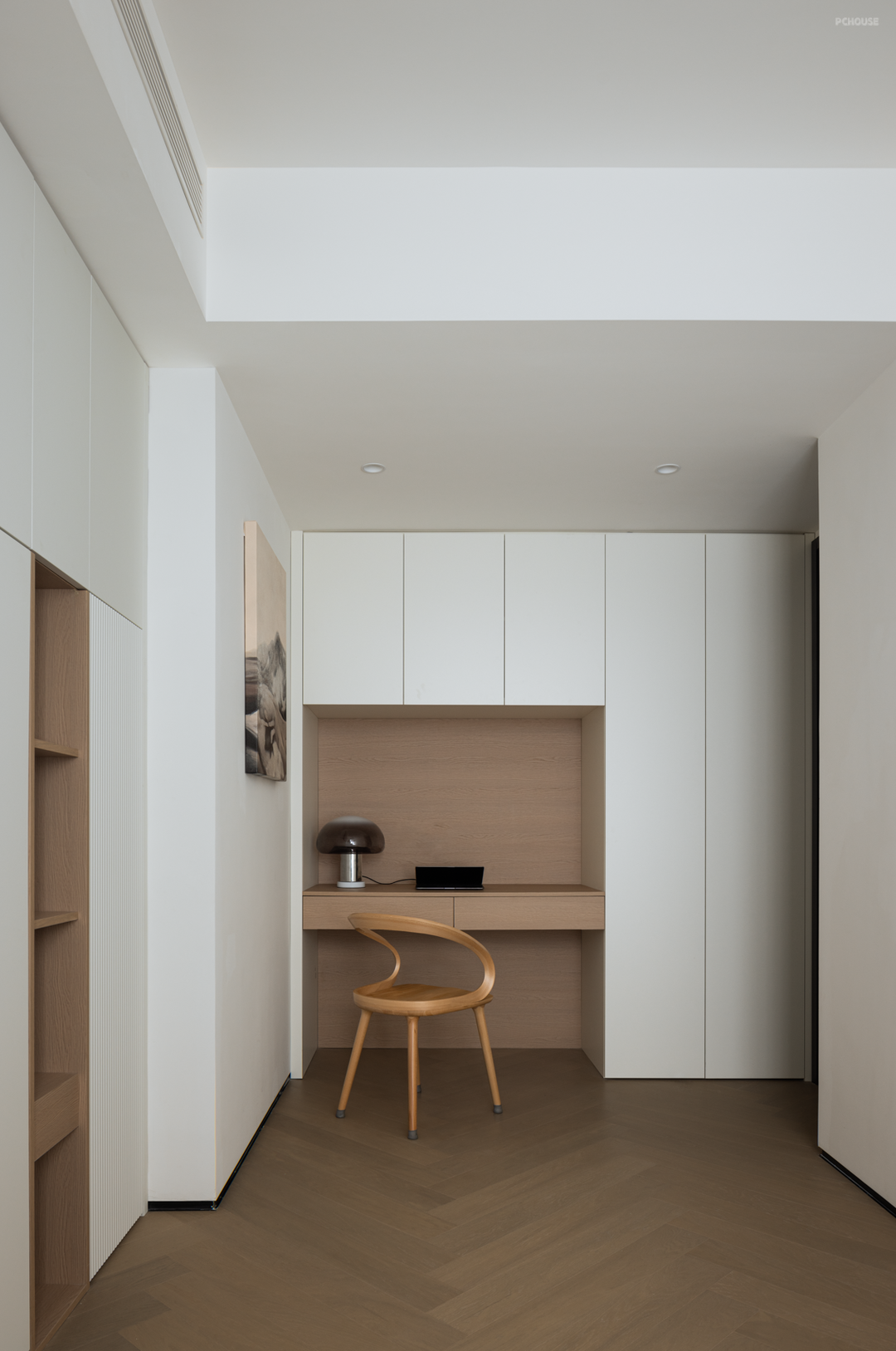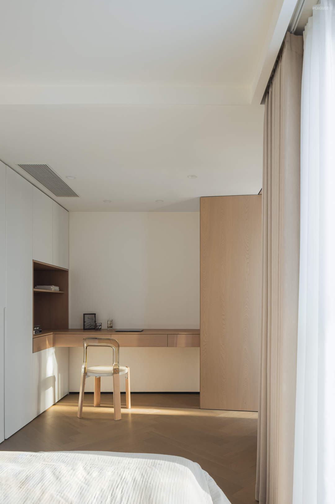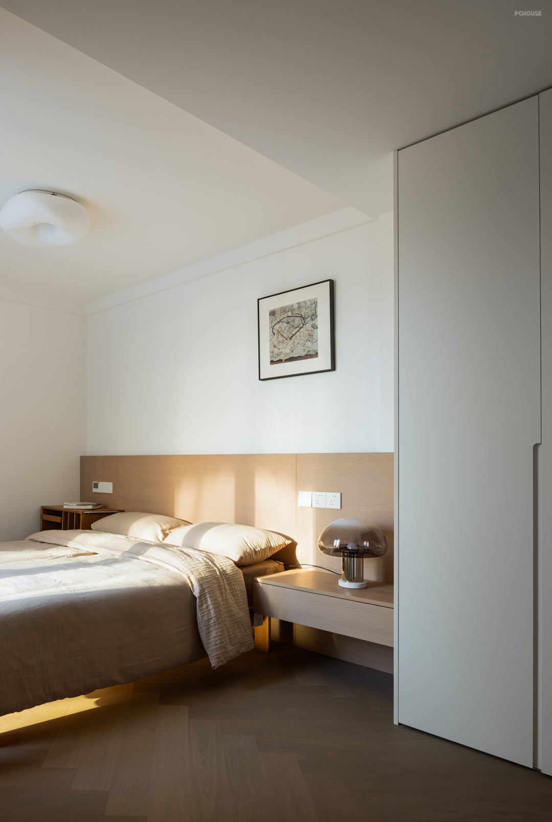 橡木原木饰面从吊顶延伸至南次卧墙面,搭配同色系隐形门,自然元素悄然融入冷色调空间。