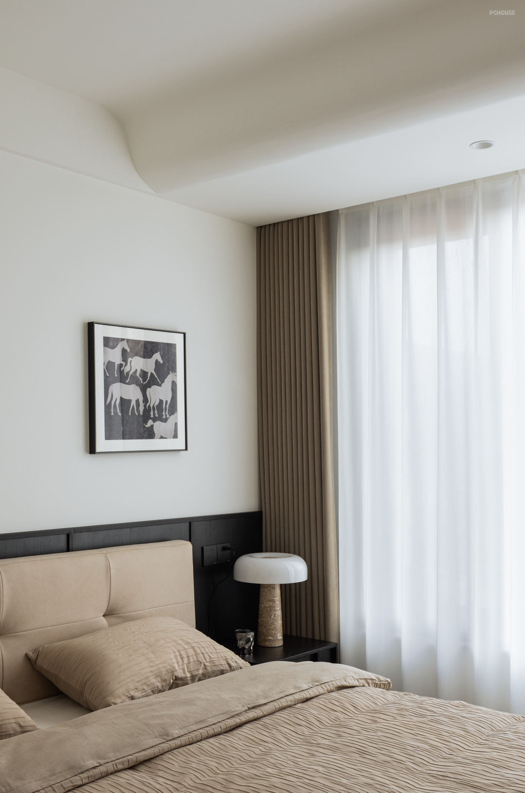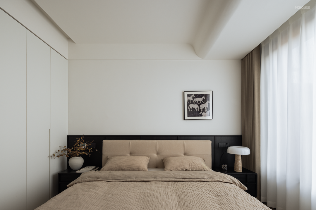 床头背景墙采用黑色骨格线墙板,利落的竖向线条拉伸视觉层高,同时赋予空间现代感与节奏美。深色墙板与浅色床品、橡木饰面形成冷暖对比,在克制中透出细腻质感。