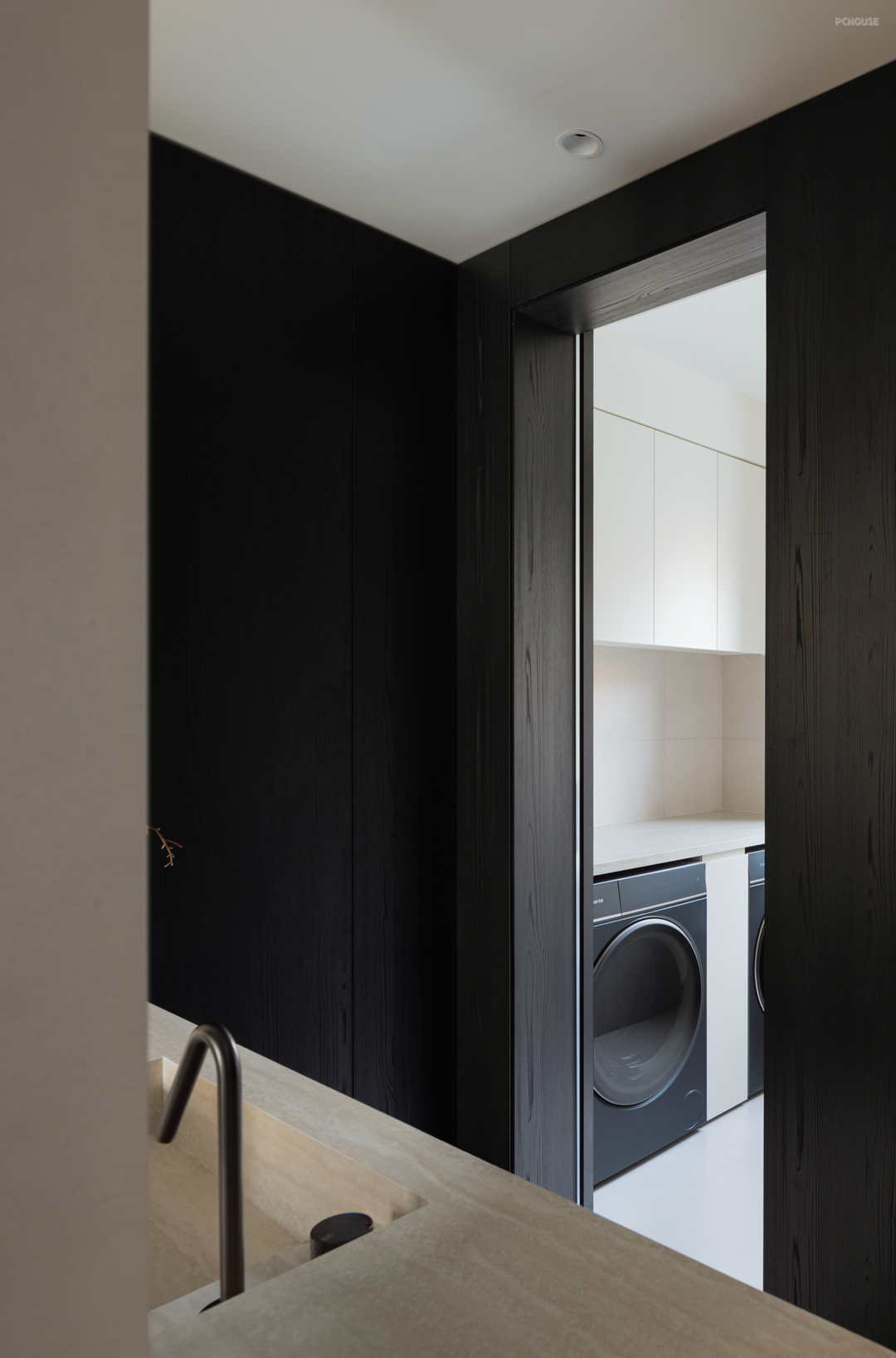 3.厨房位置改变后,U形厨房大大提高生活使用的便利性。原始的厨房设计成家政间,里面的摆放洗衣烘干机。把客卫做了干湿分开,便于生活使用。