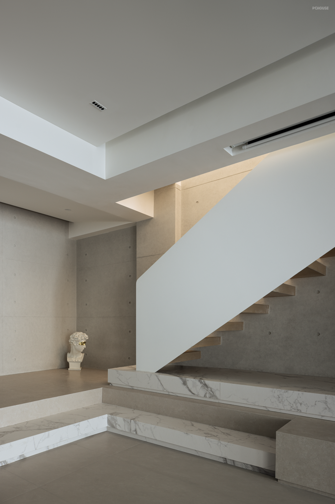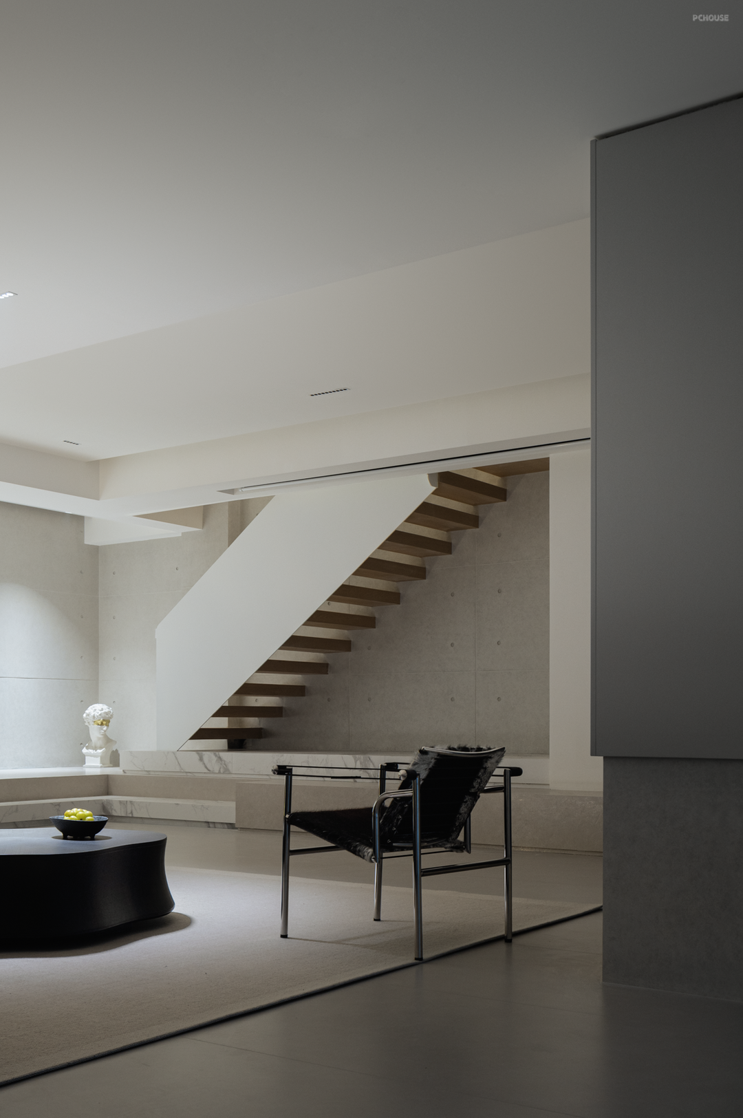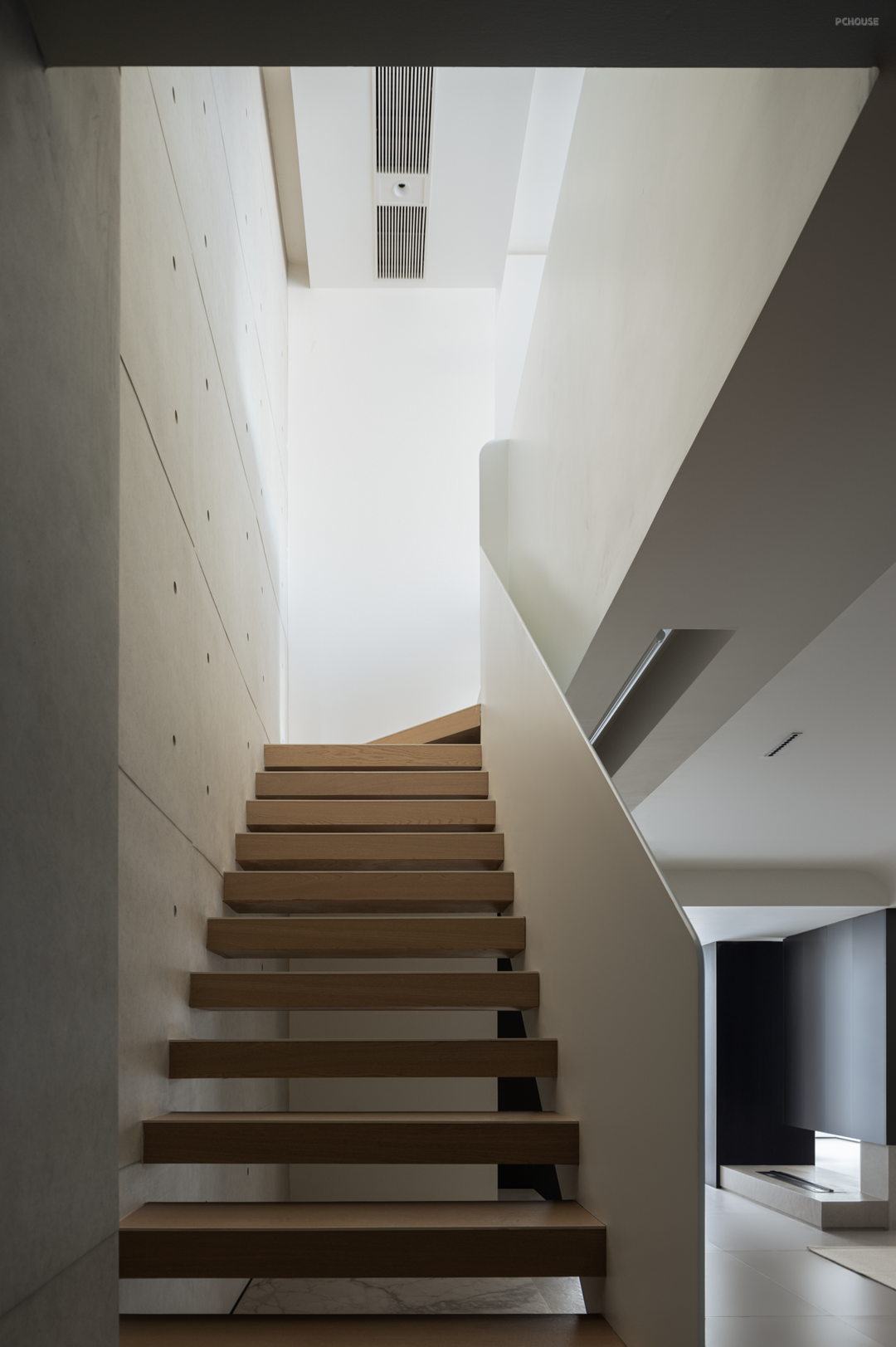 原始楼梯位置不佳,设计师将其改为白色钢板悬浮结构,踏步与扶手一体化,视觉更轻盈。踏步下方嵌入灯带,夜晚行走时,光线柔和指引,安全又美观。