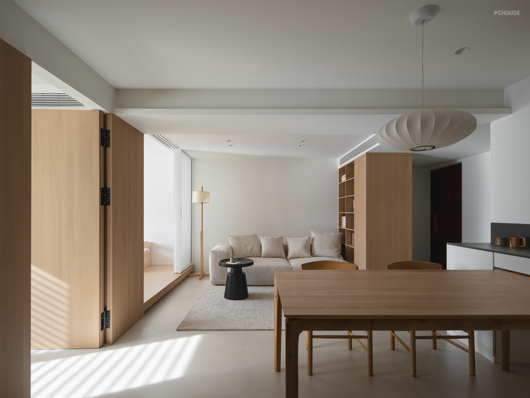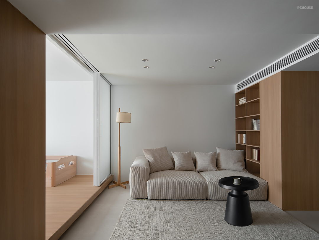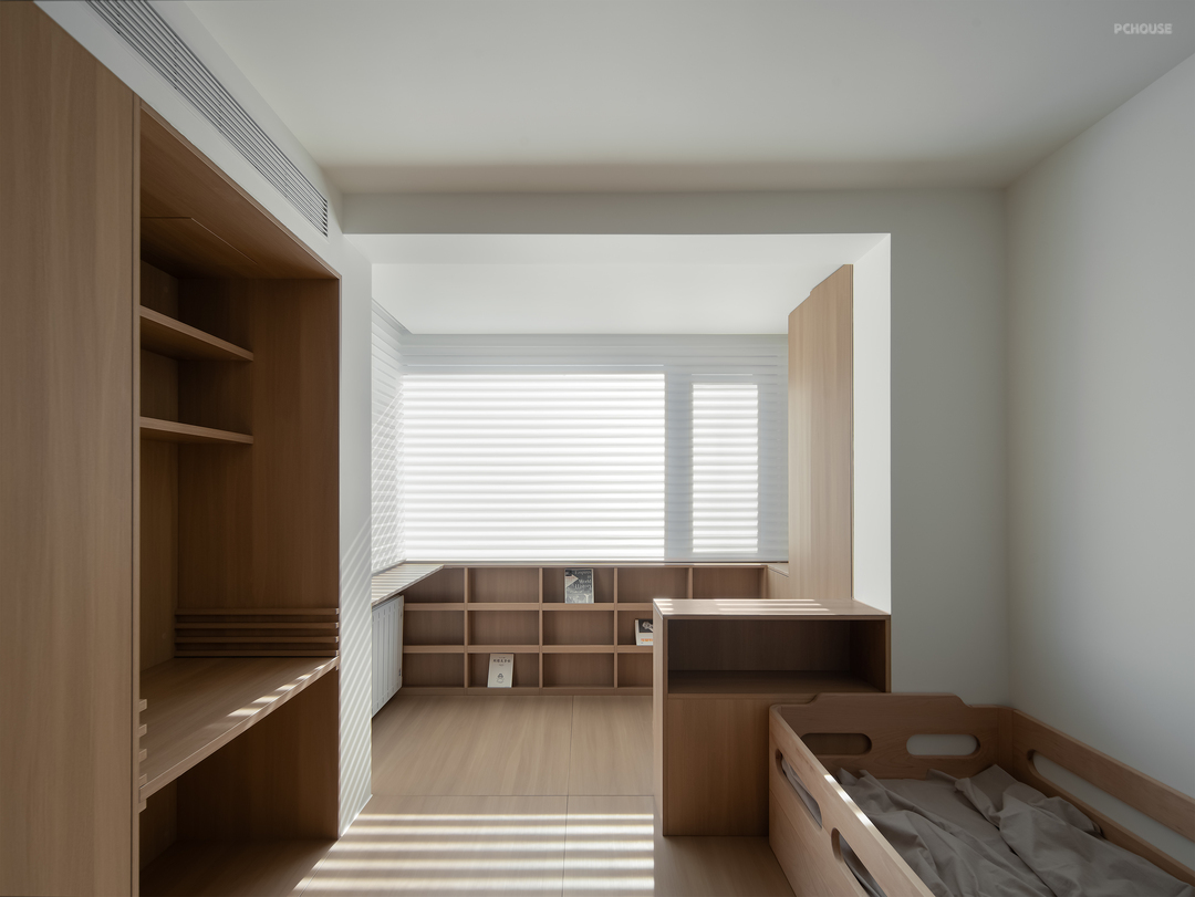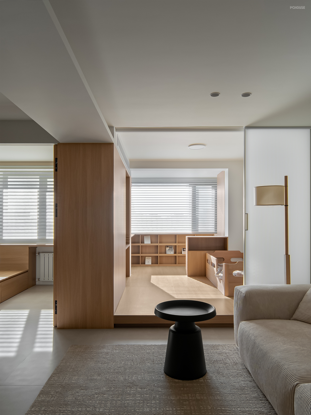 于是,我们进行了一番改造,采用木质柜体分隔出各自的空间,一层分为客餐、老人房、儿童房;儿童房构建地台增加趣味感,沿窗下定制杂志架陈列儿童书,合适的高度可以培养孩子的阅读习惯。