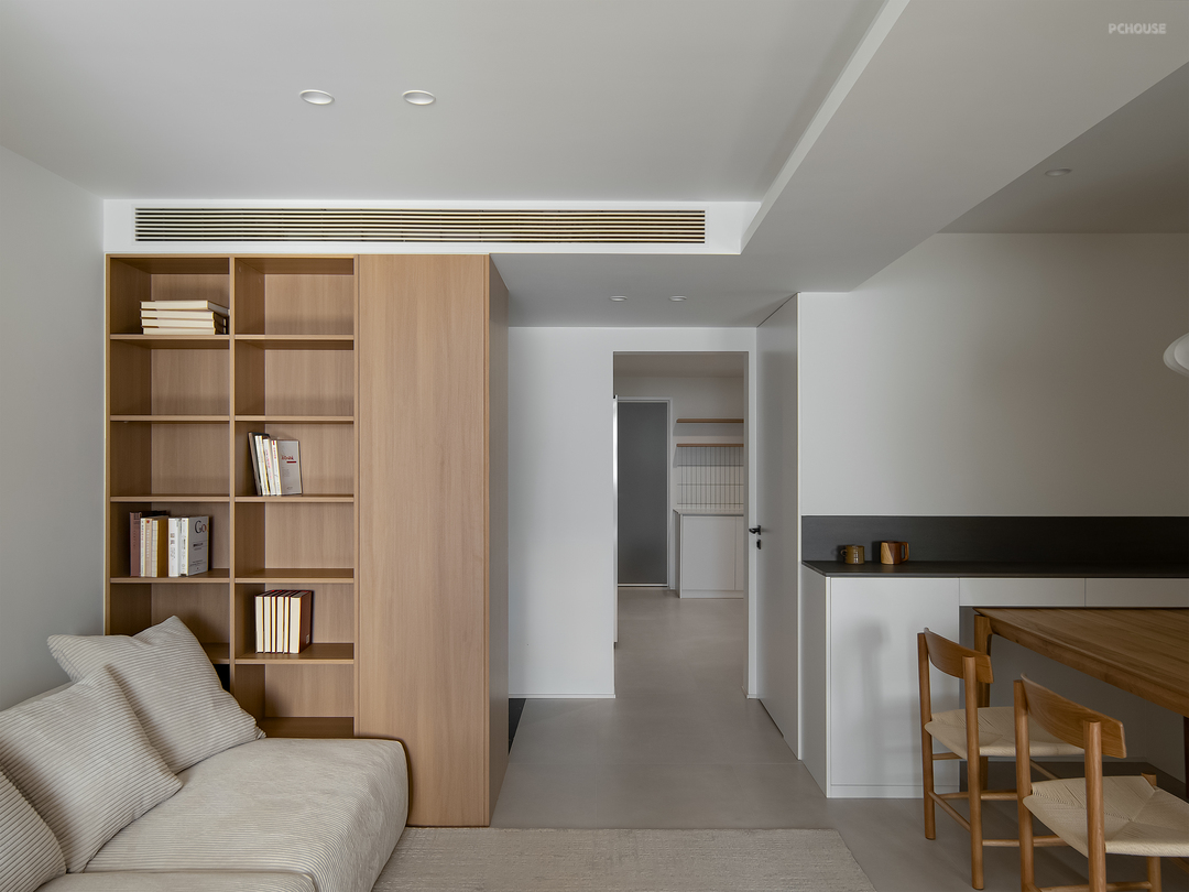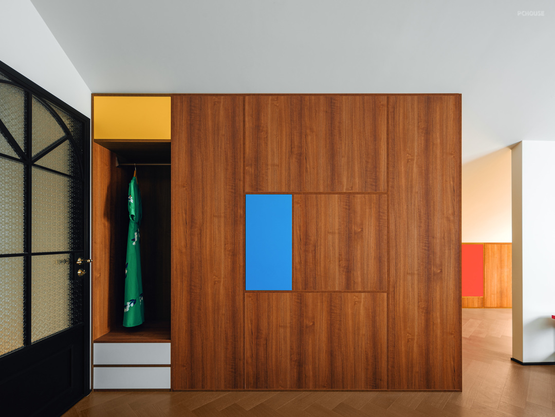 家门口特意做了一个双面柜遮挡入口,这样在室内完全看不到门的位置。用来遮挡入口的柜门和其他柜体形成完整而流畅的收纳空间。
