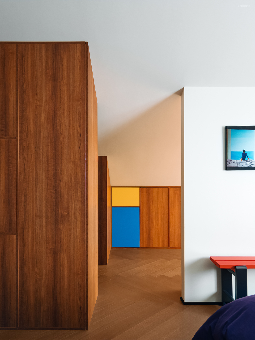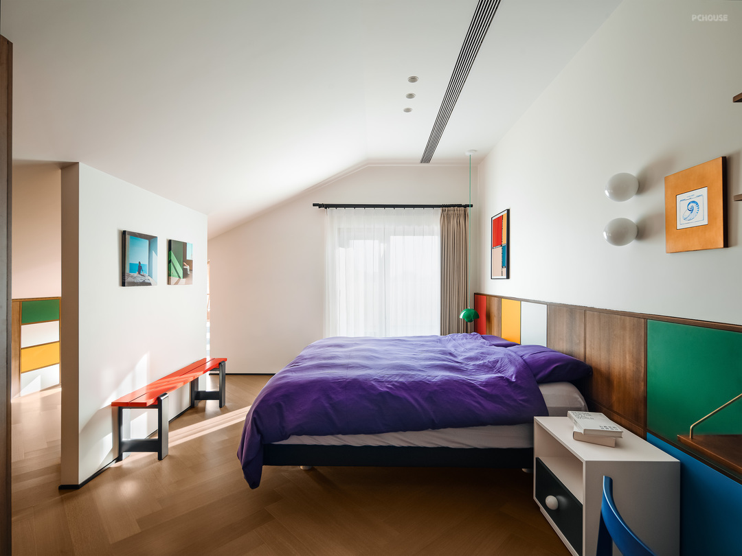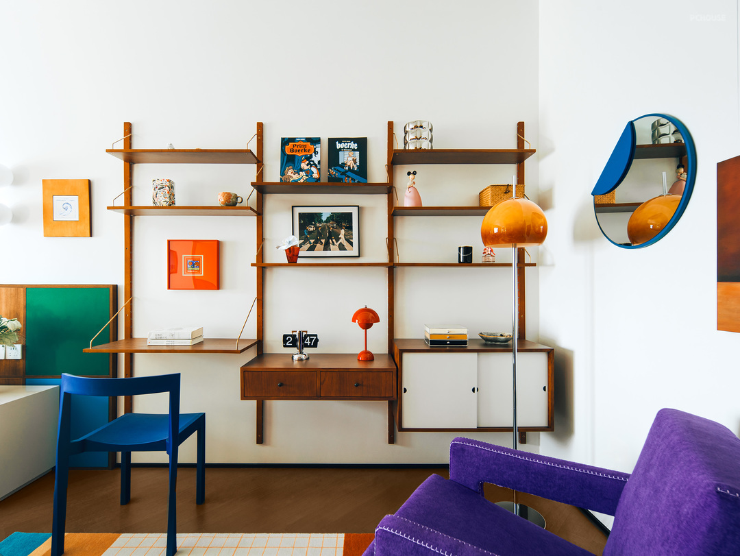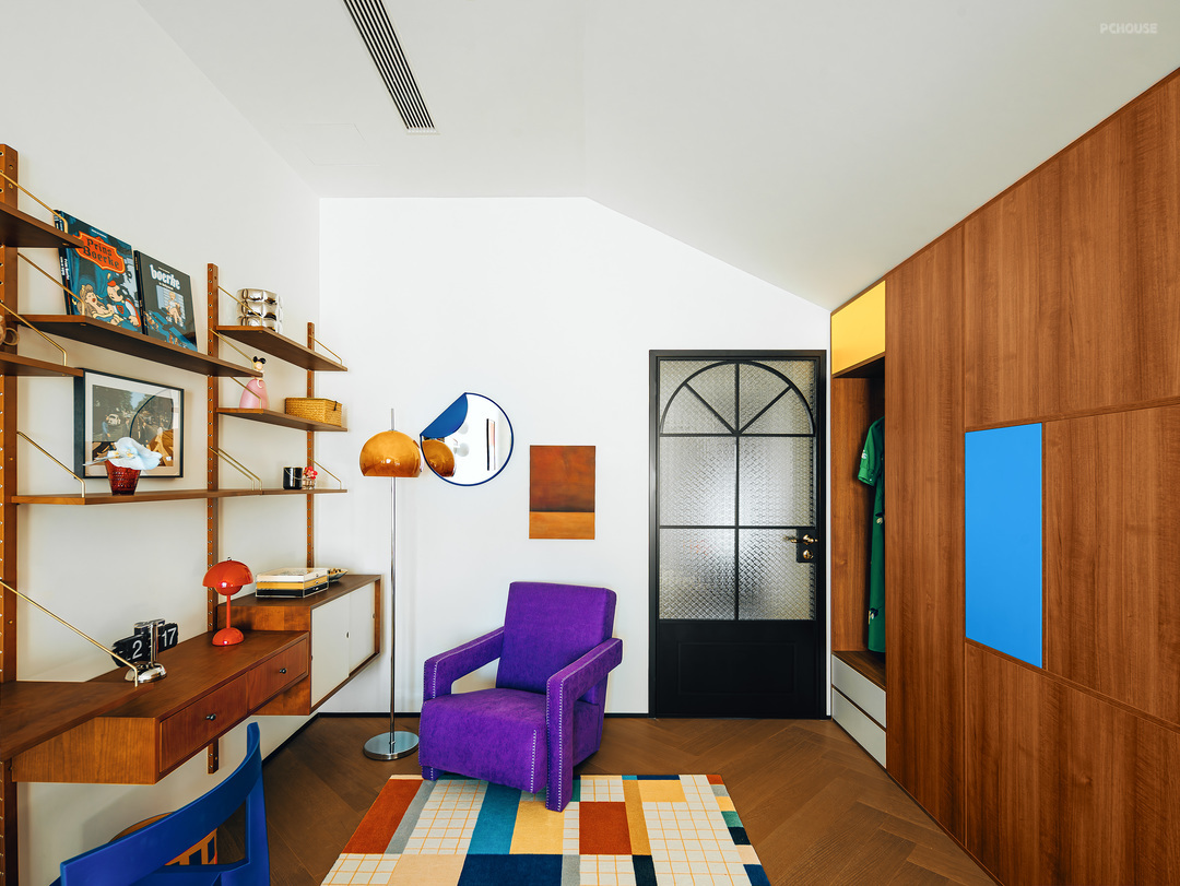 充斥着亮眼的色彩,在一片红黄蓝里,可以看到局部紫色沙发的点缀,还会有小面积克莱因蓝的椅子,跳跃却又合理。