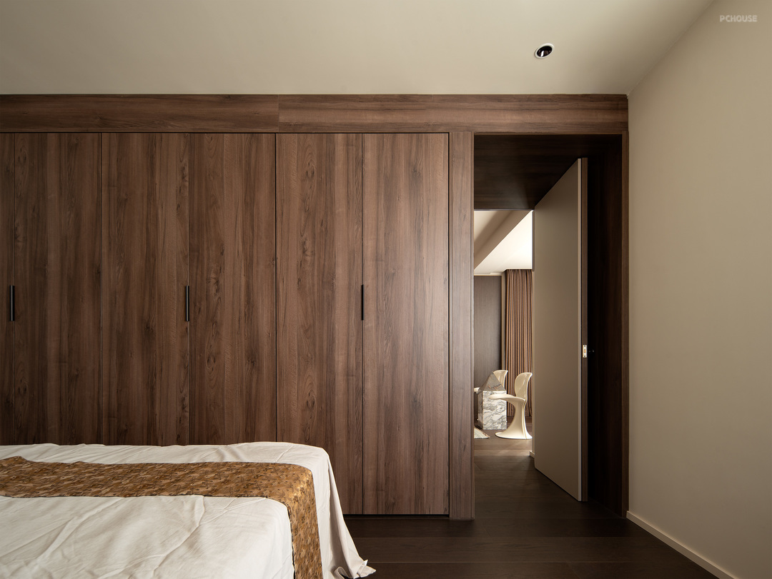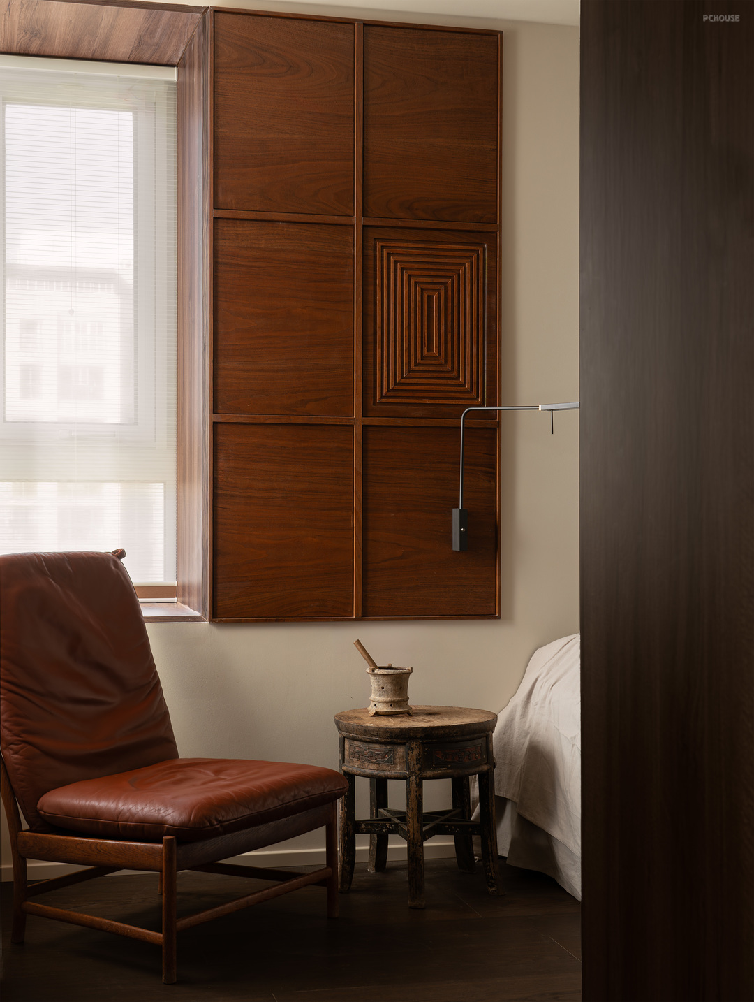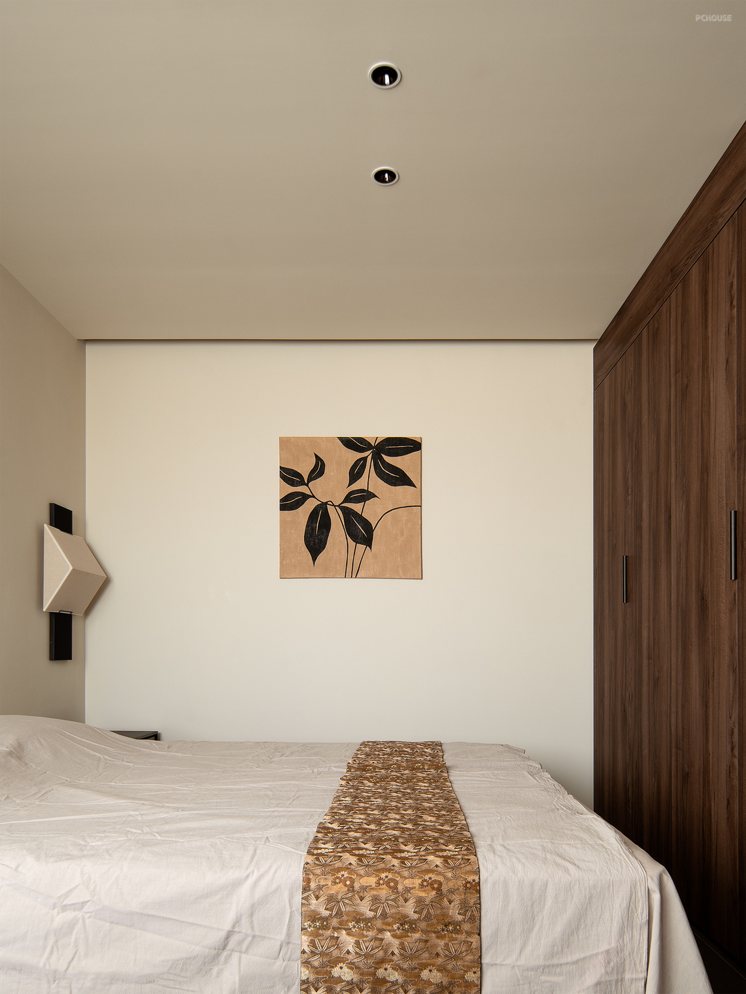 主卧空间,选择了温暖的大地色系,米白、浅棕...营造出宁静的氛围,增强空间温馨感。围合式大玻璃窗引光入室,将卧室映照的通透明亮,清晨的第一缕阳光透过纱帘,轻抚每一寸空间:地板、床品、桌上的油画,轻轻地唤醒沉睡的梦想。