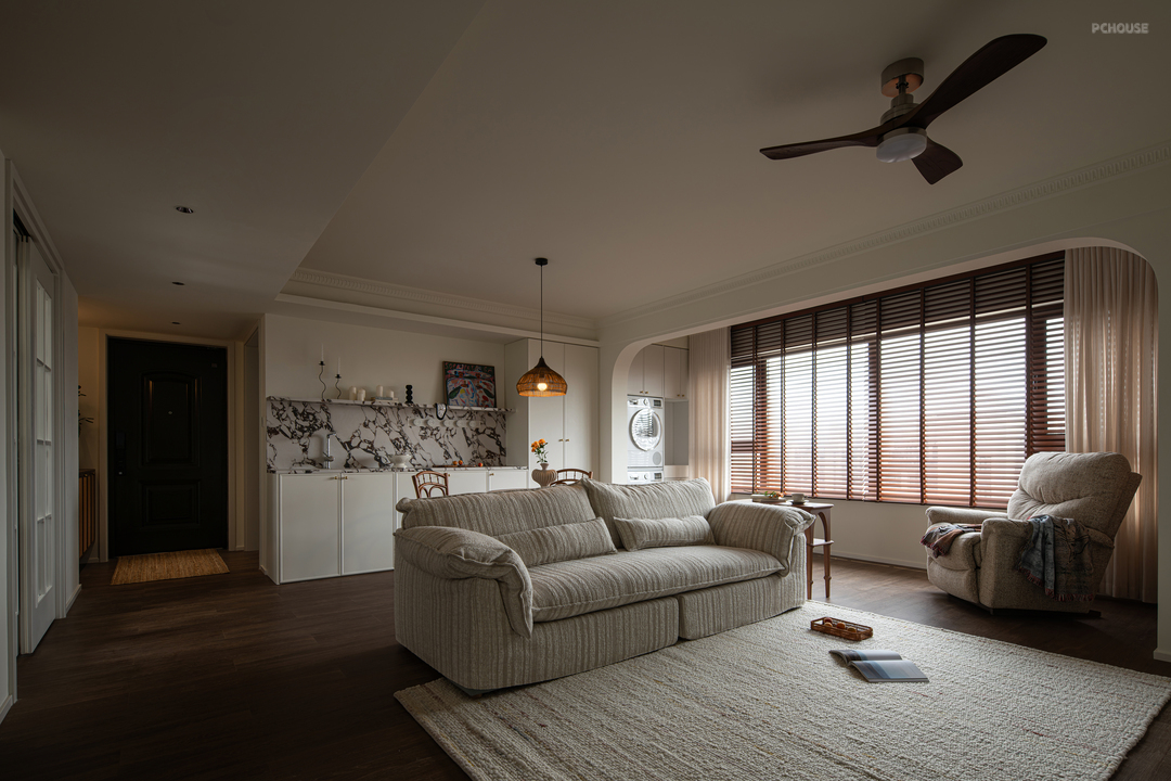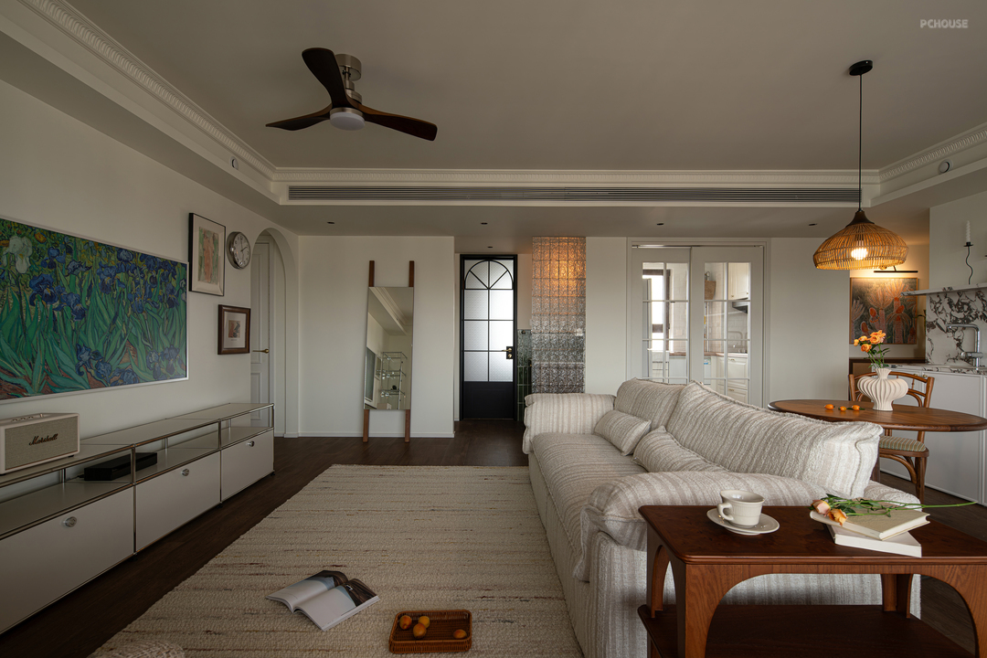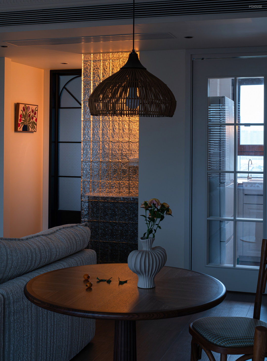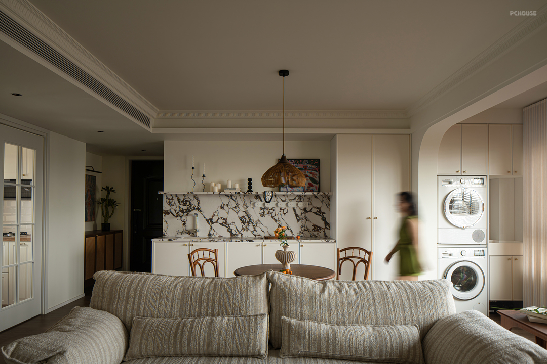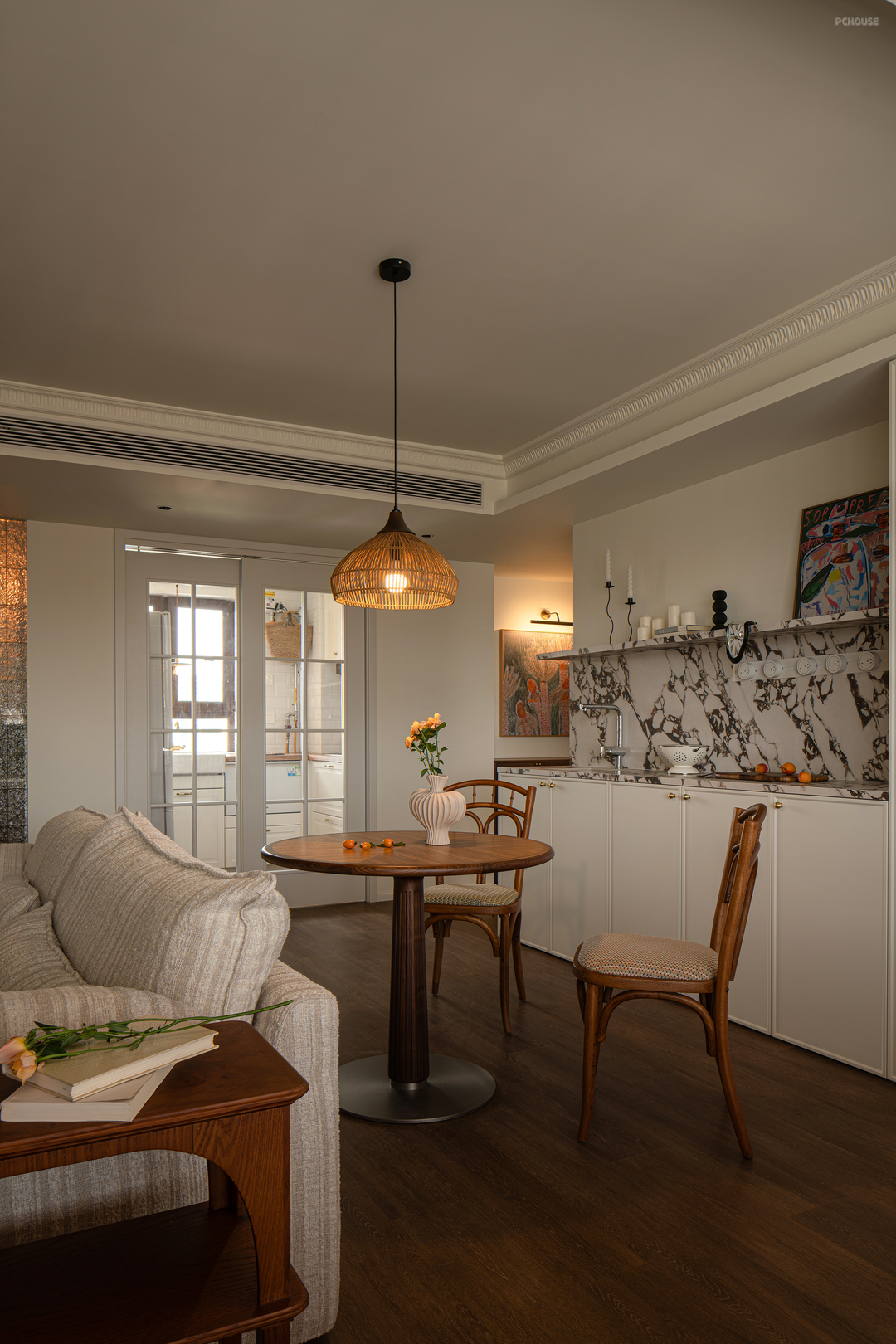 客餐厅一体的布局让家里拥有了六米的公区开间,我们塑造双重洄游的环形动线,并为屋主细化到生活习惯,来赋予家里独特的风格。