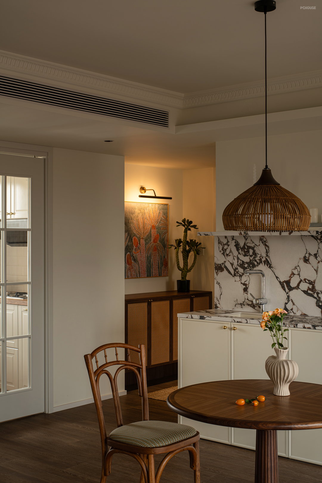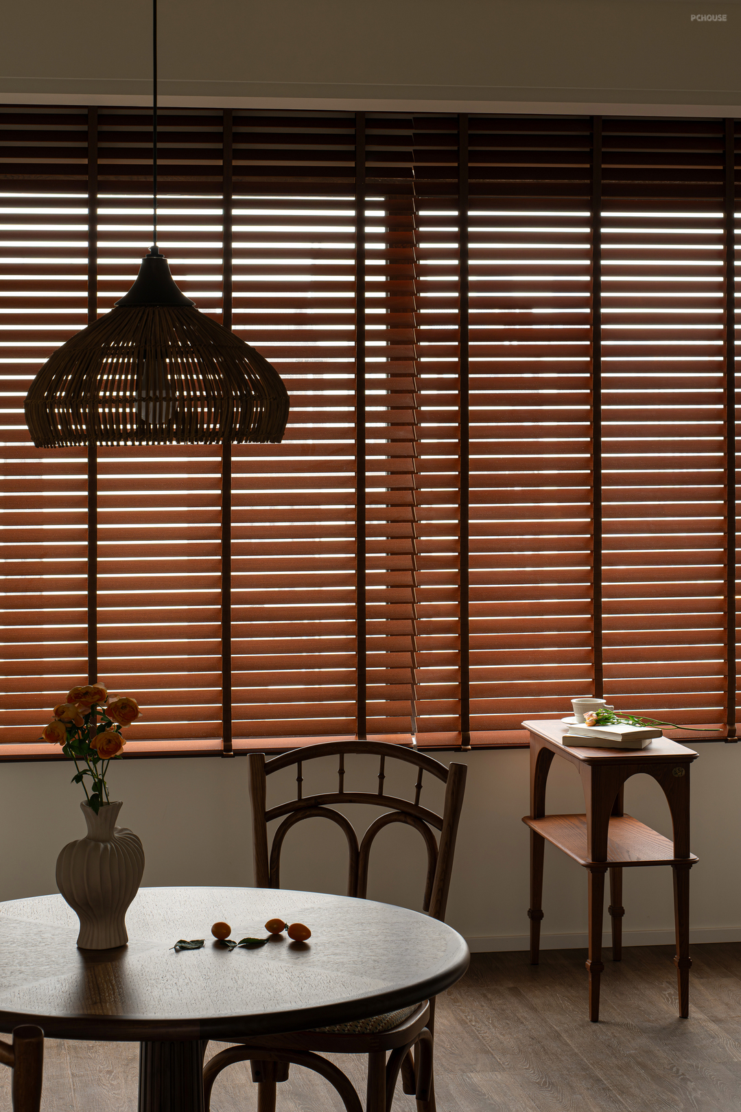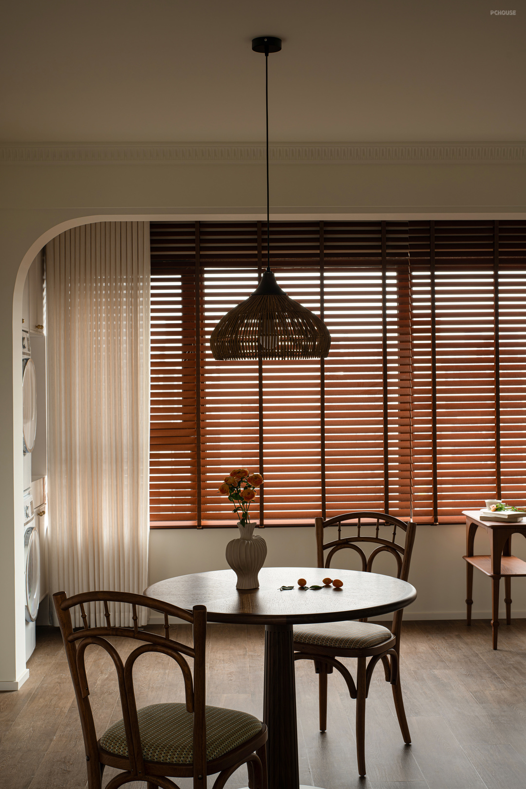 木地板、胡桃木、哑光岩板、木百叶、纱帘、编织灯...空间质感藏在复古而精致的沉淀中,选用的家具也不是标准公式上的大开大合,而是有自己的想法,最终又于生活中得到风格统一,像油画每一处特立独行的笔触,又汇聚的具象化。