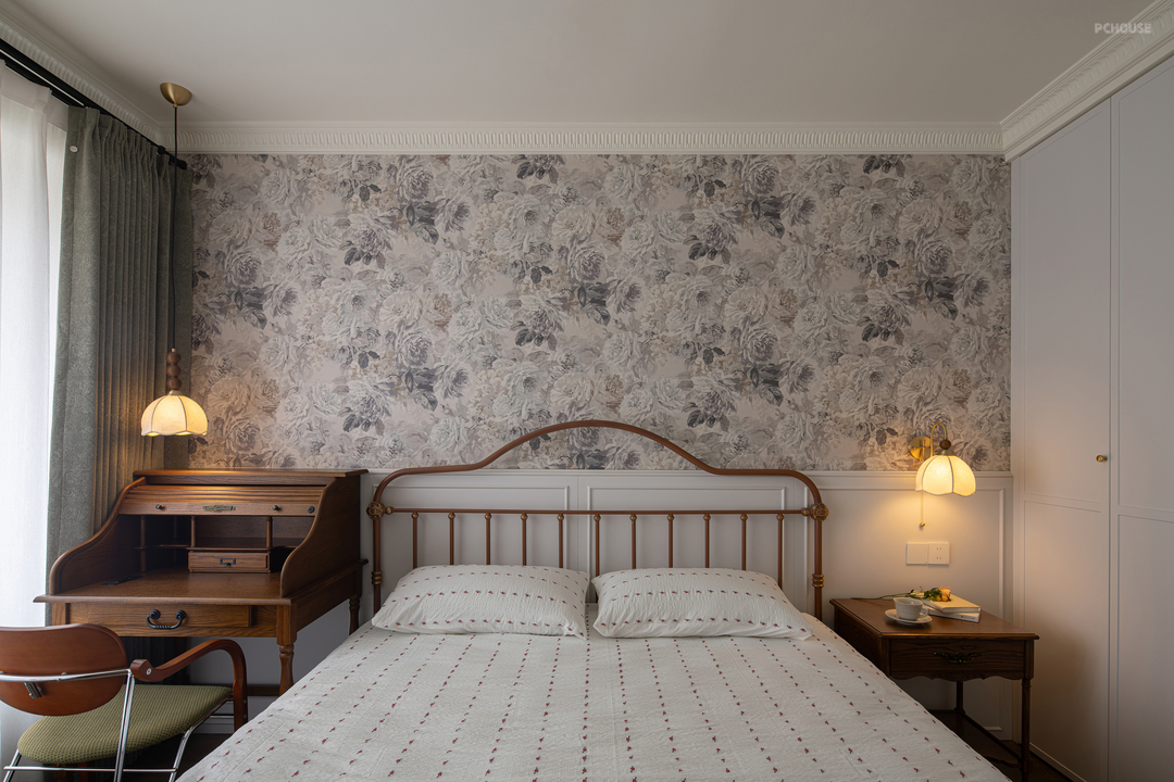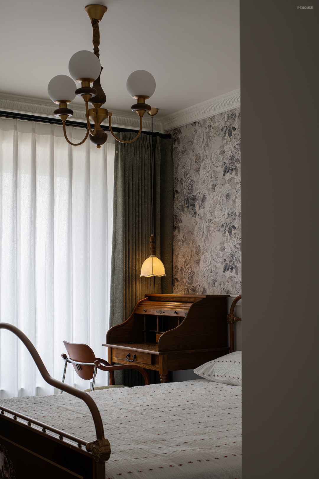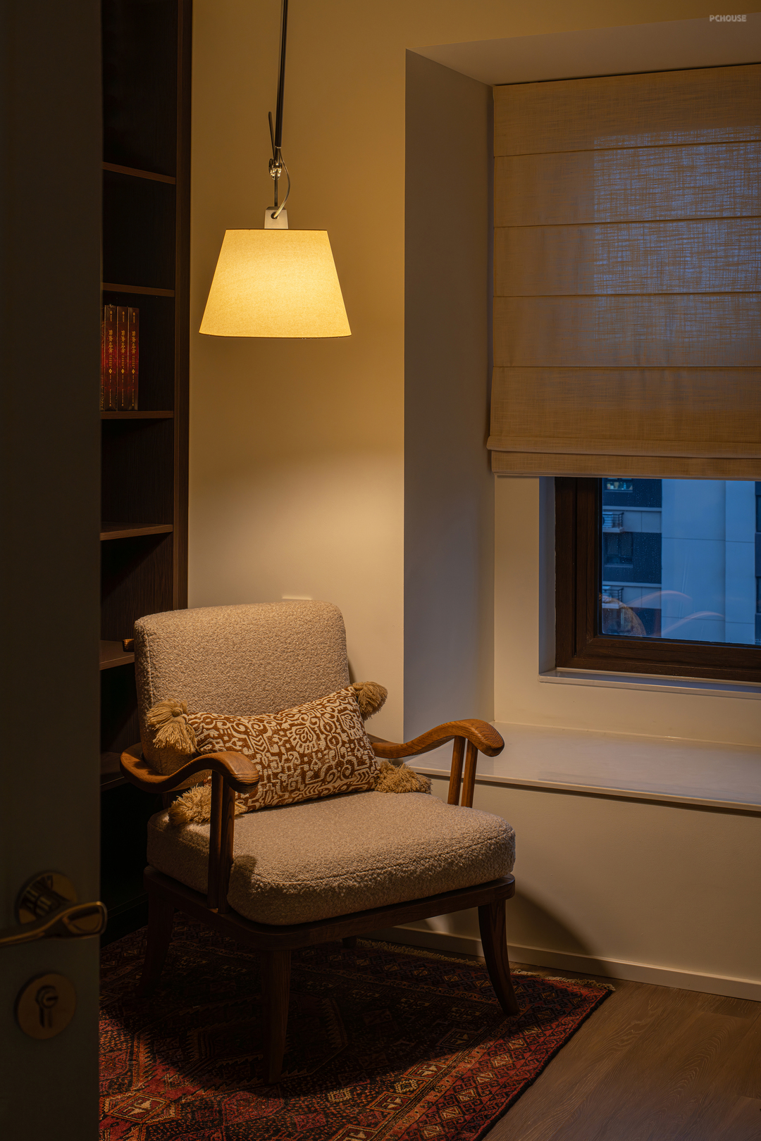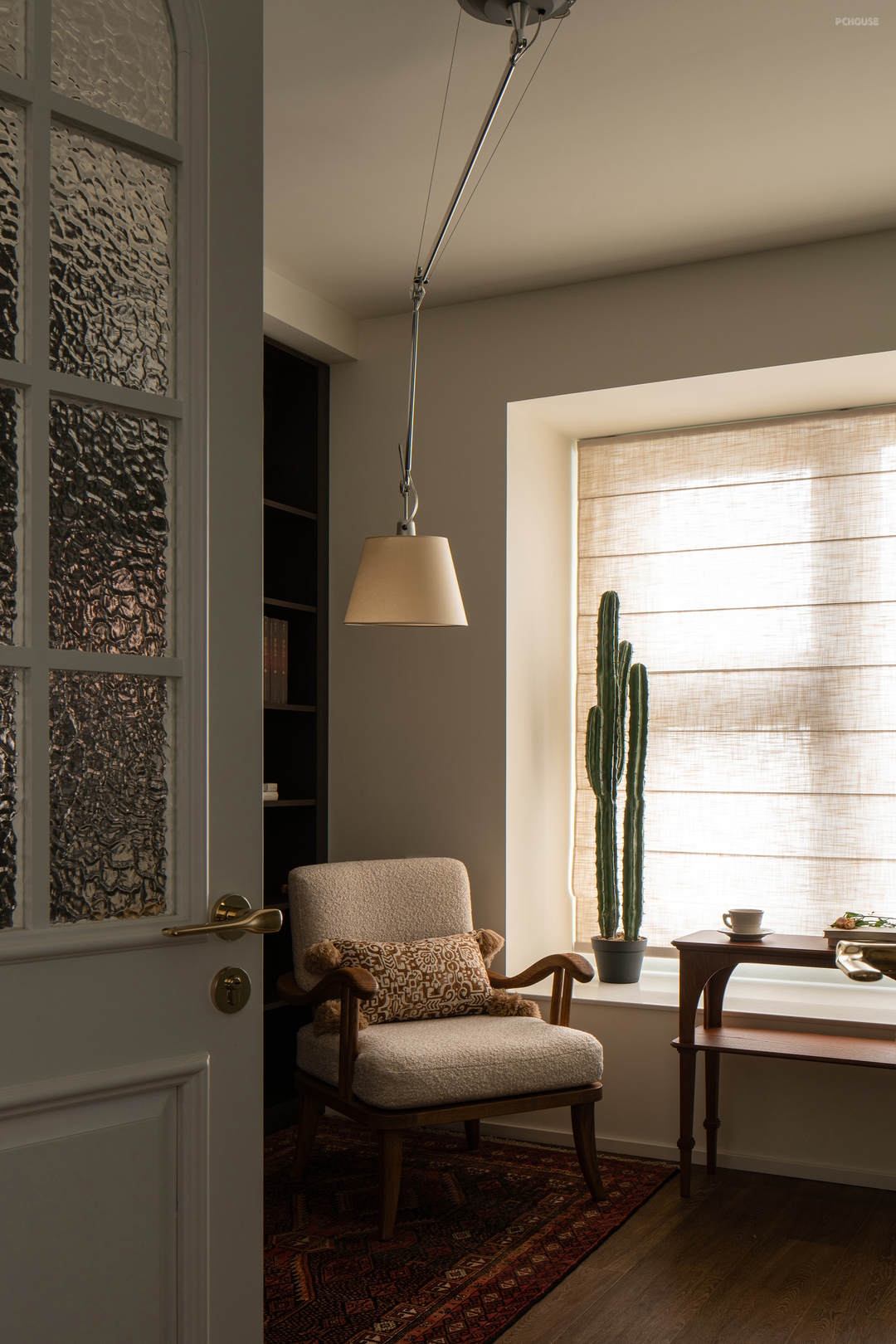 木地板、胡桃木、哑光岩板、木百叶、纱帘、编织灯...空间质感藏在复古而精致的沉淀中,选用的家具也不是标准公式上的大开大合,而是有自己的想法,最终又于生活中得到风格统一,像油画每一处特立独行的笔触,又汇聚的具象化。