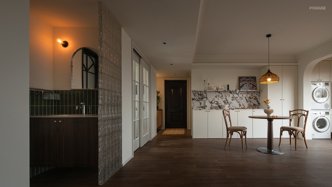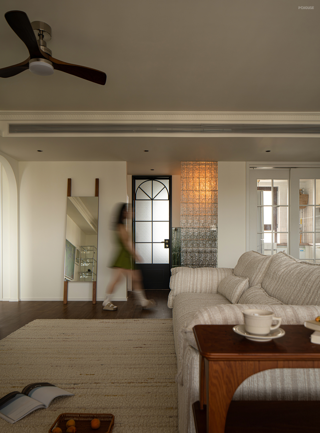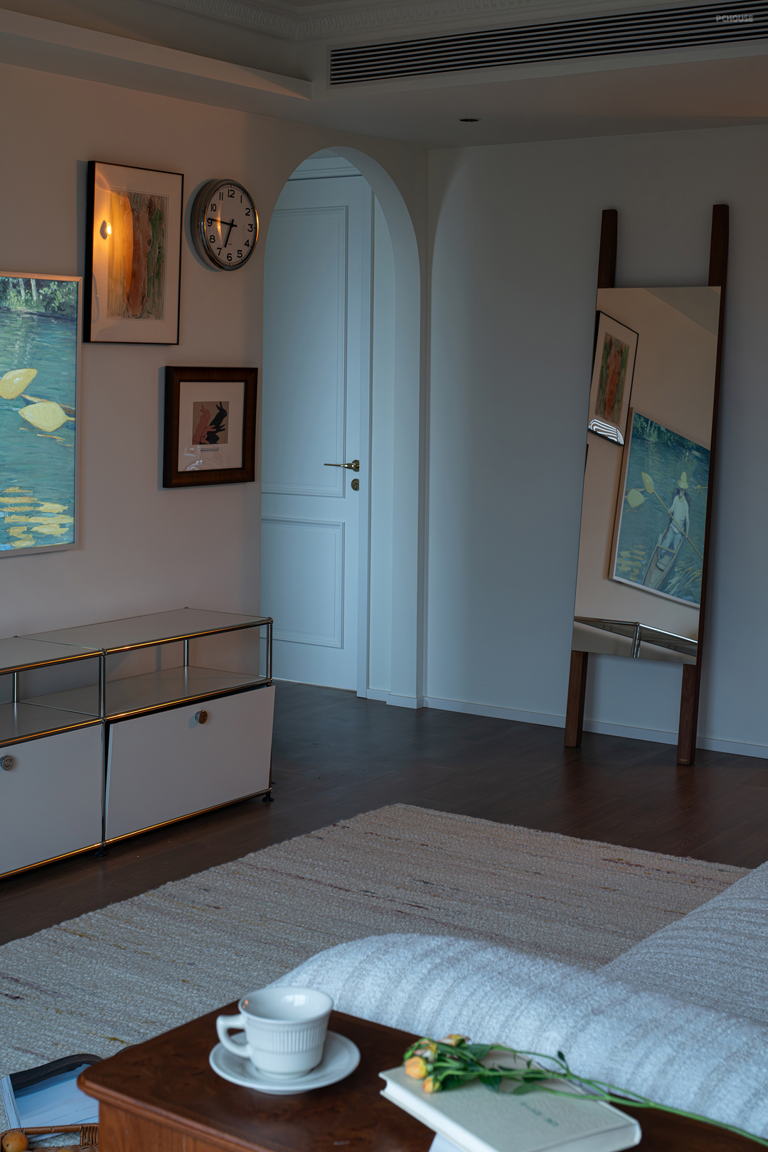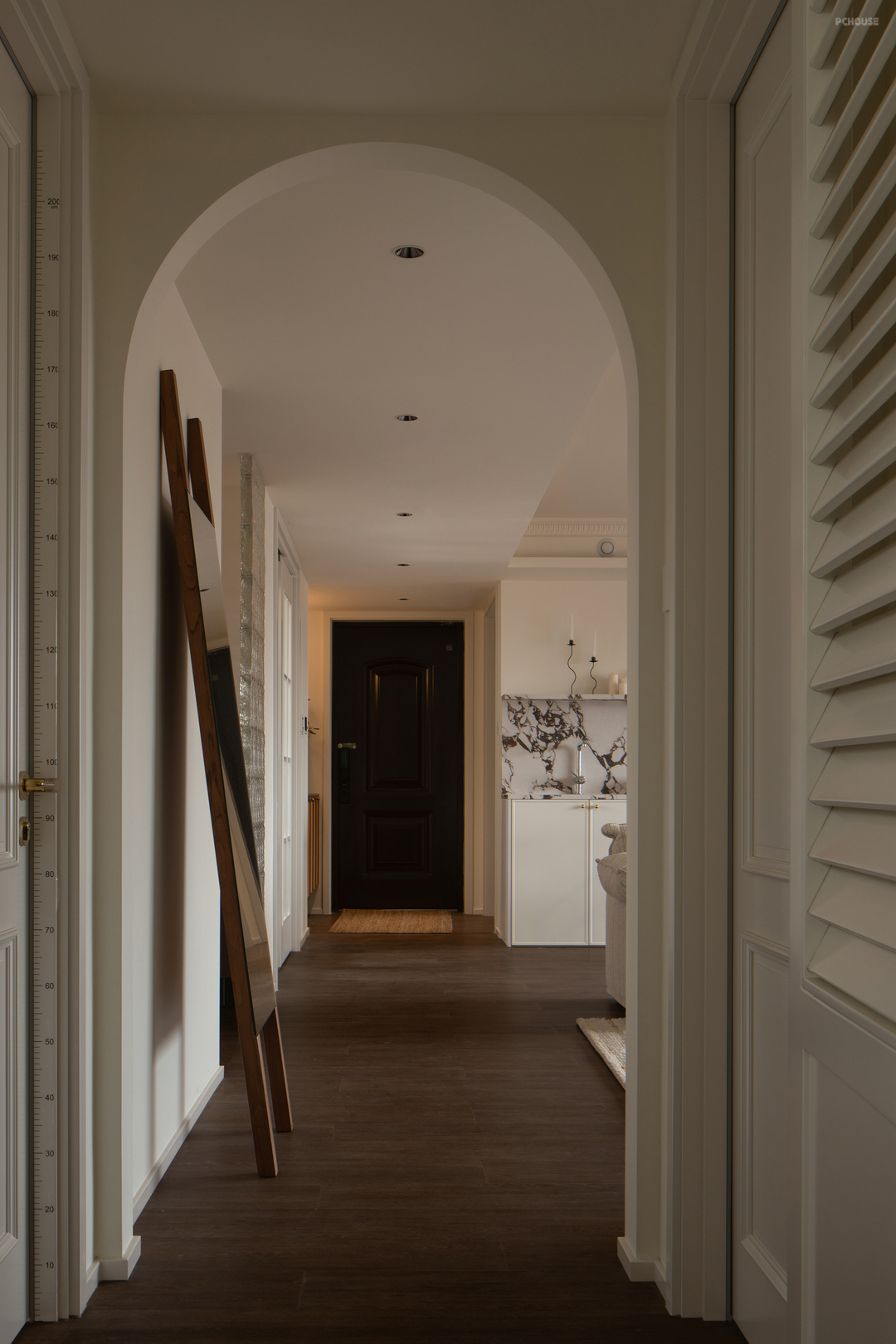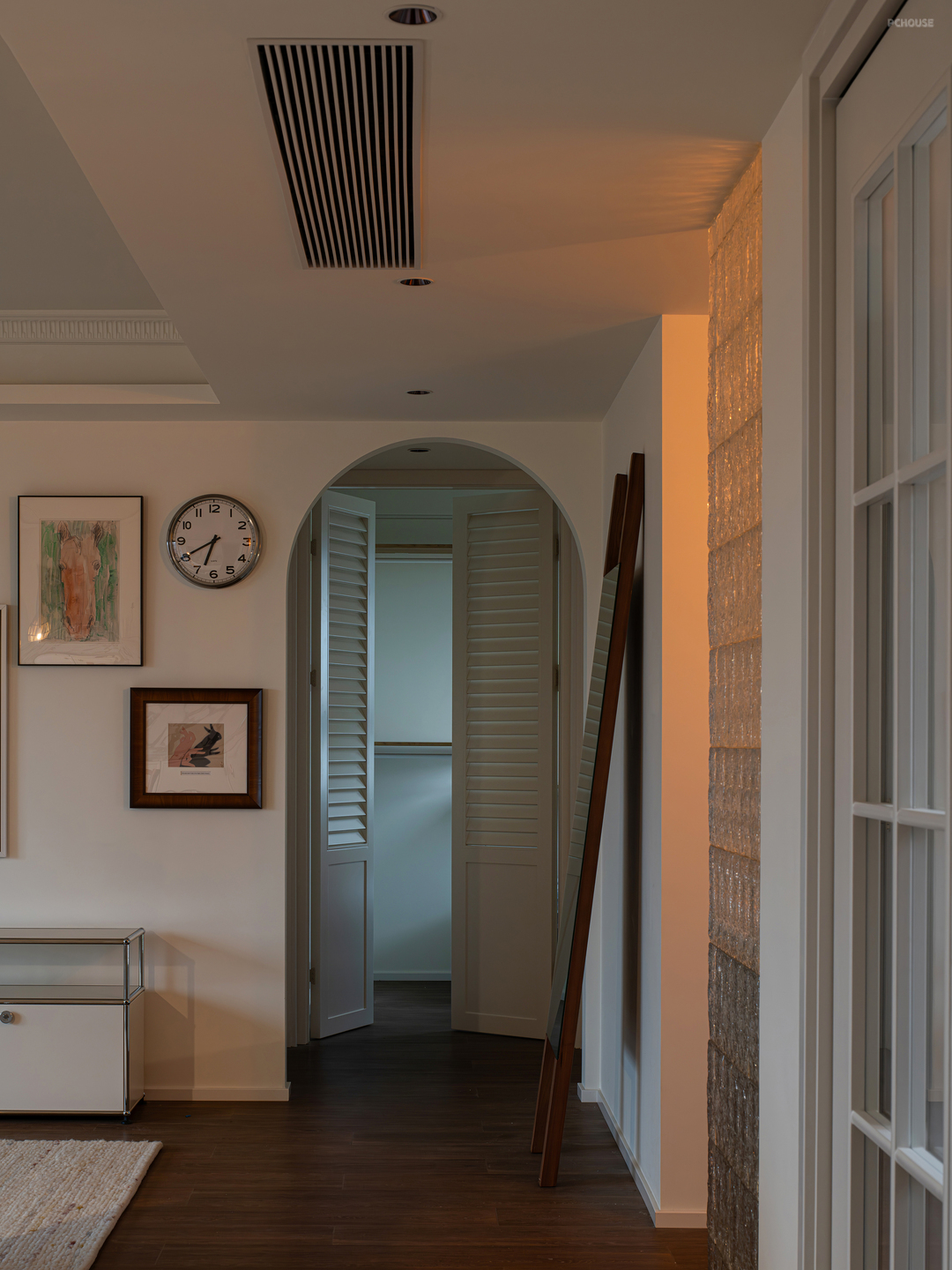 推开门拱下的双开门,原本的生活方式已经在这里改变。换衣后走出,穿衣镜随意倚靠在墙边,这条长长的走廊沿路有了层次感,这里是完全属于家庭的场域。