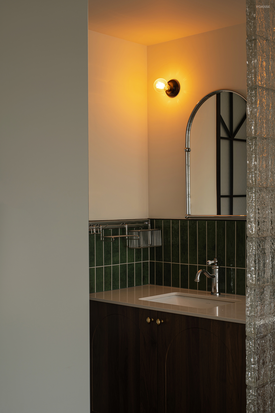 客卫做干湿分离,复古风在这里兴起,老式灯泡照亮半墙铺贴的墨绿小砖,棱角的美若隐若现,透过油画质感的玻璃隔断展示。