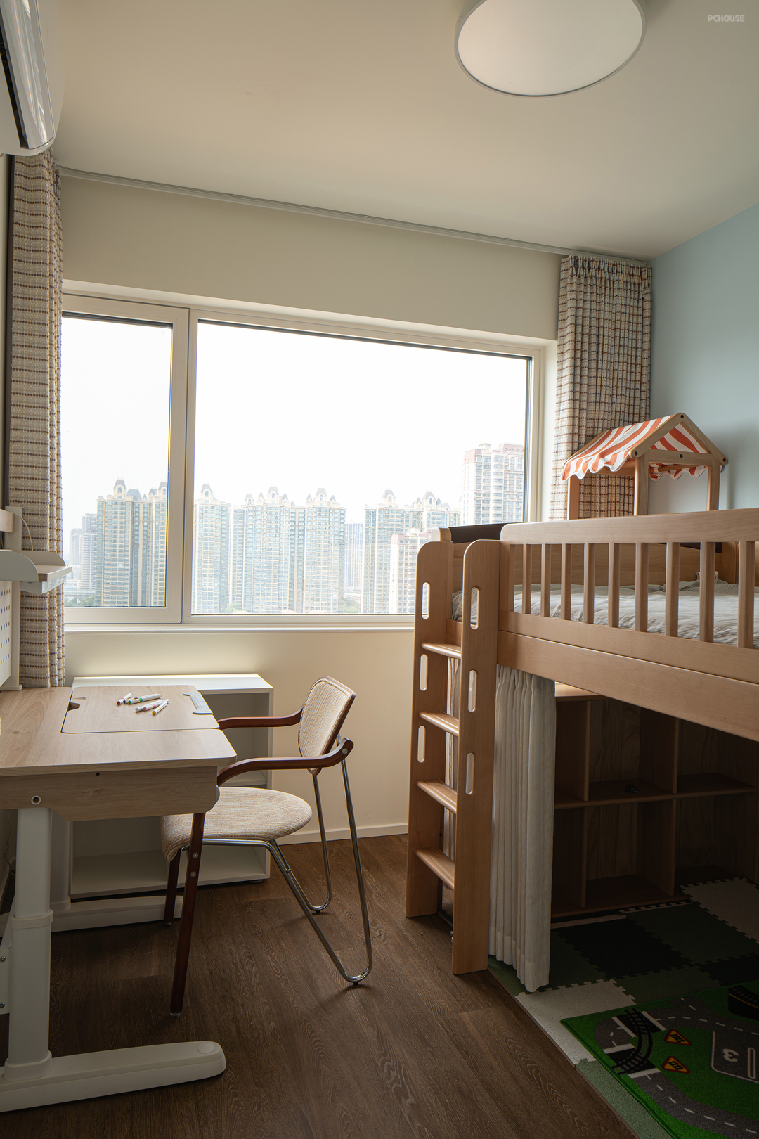 茶几是活动的、阳台不限于家政、影视墙没有去构造复杂的造型,用USM模块柜与画壁电视的组合就让这里足够同时具备呼吸感与丰富画面,划分出大面积的活动区域去满足亲子家庭的陪伴。