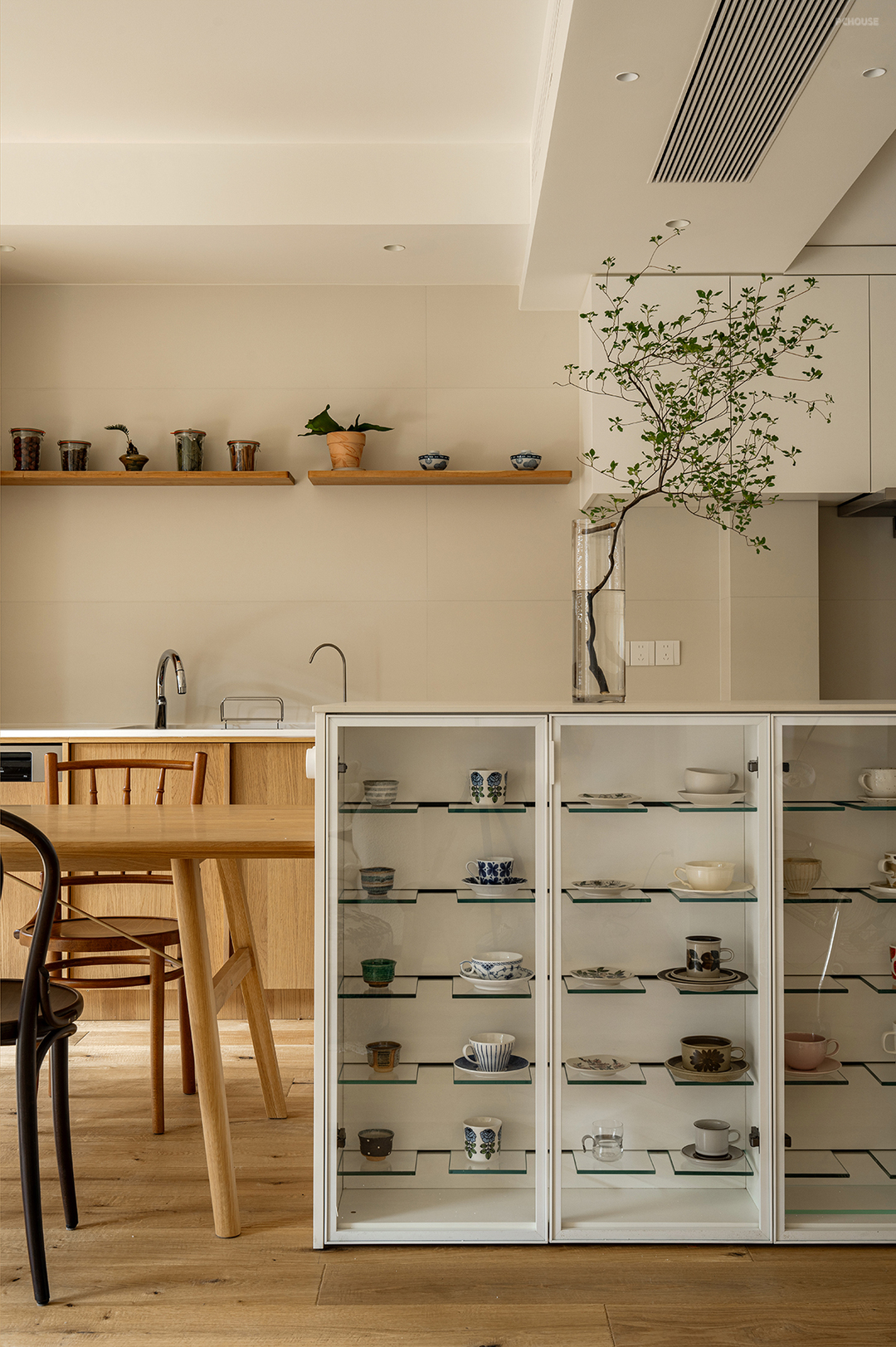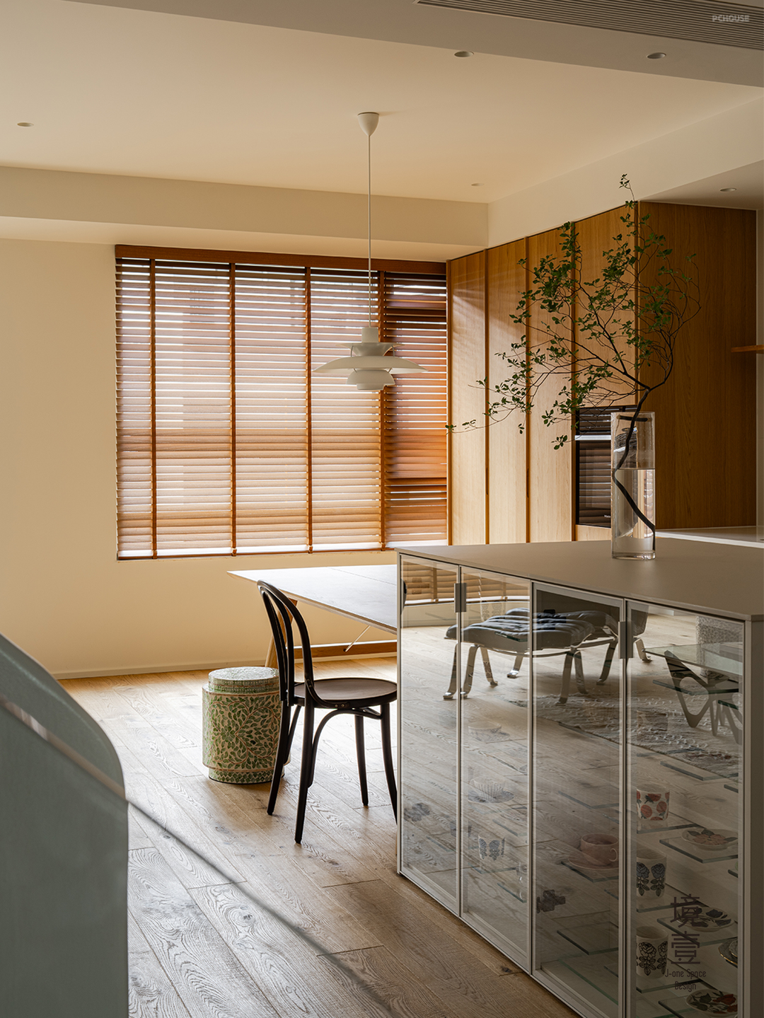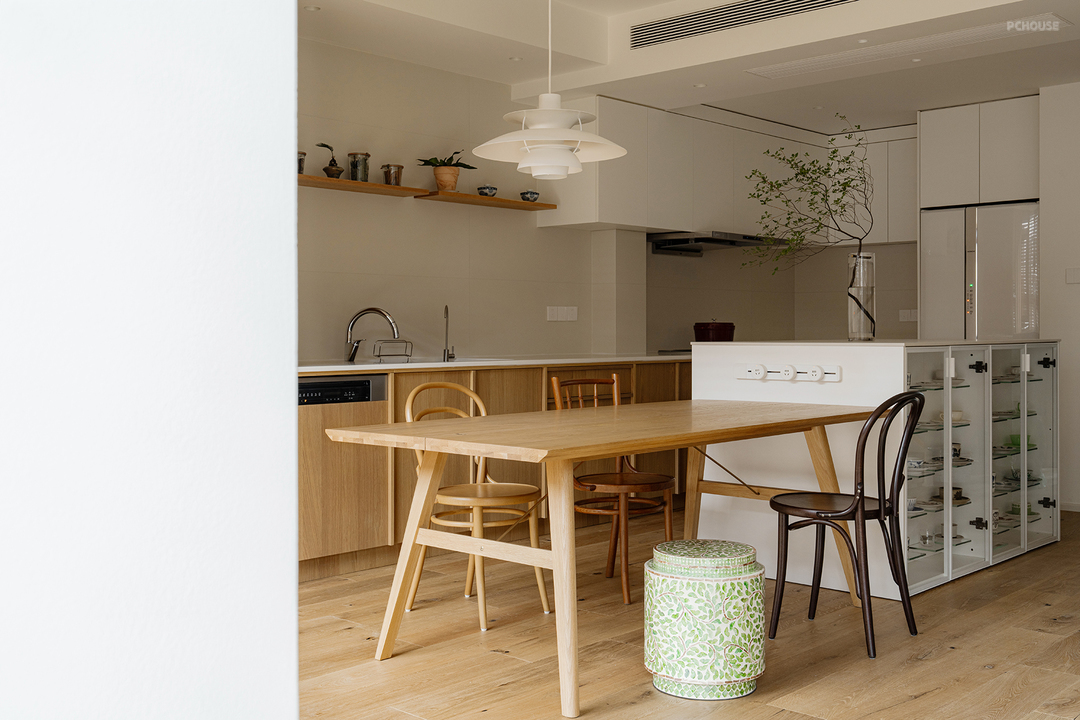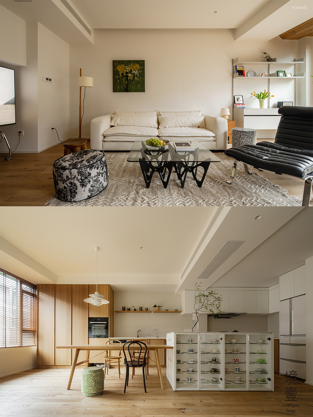 前言: 本案面积210平米,目前主要是业主独自居住。希望自己的空间是开放式的,空间是敞亮并且整体放松的感觉。所以拆除原有厨房空间,重新分配整个公区。如此,模糊餐厅与厨房界限。让餐厨变得宽敞而明亮,餐桌与岛台相连。与业主讨论后觉得可以控制卫生的前提下,首次采用了地板通铺作为西厨地面。