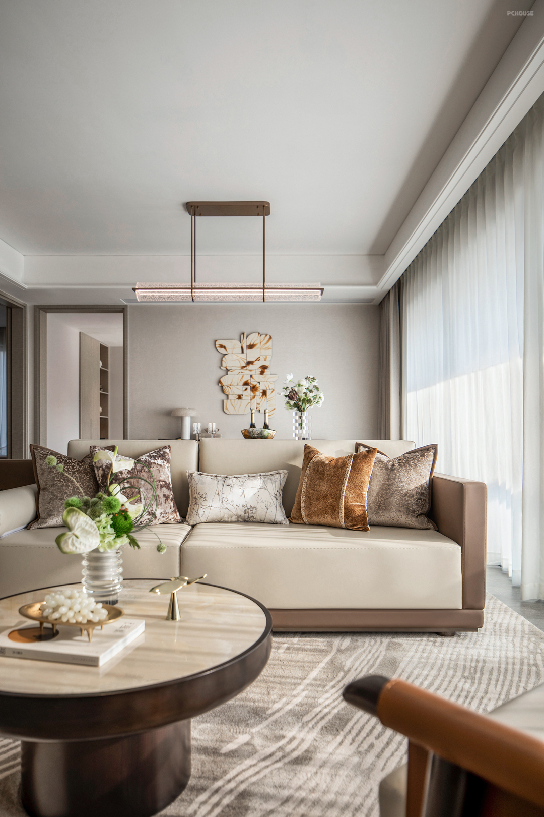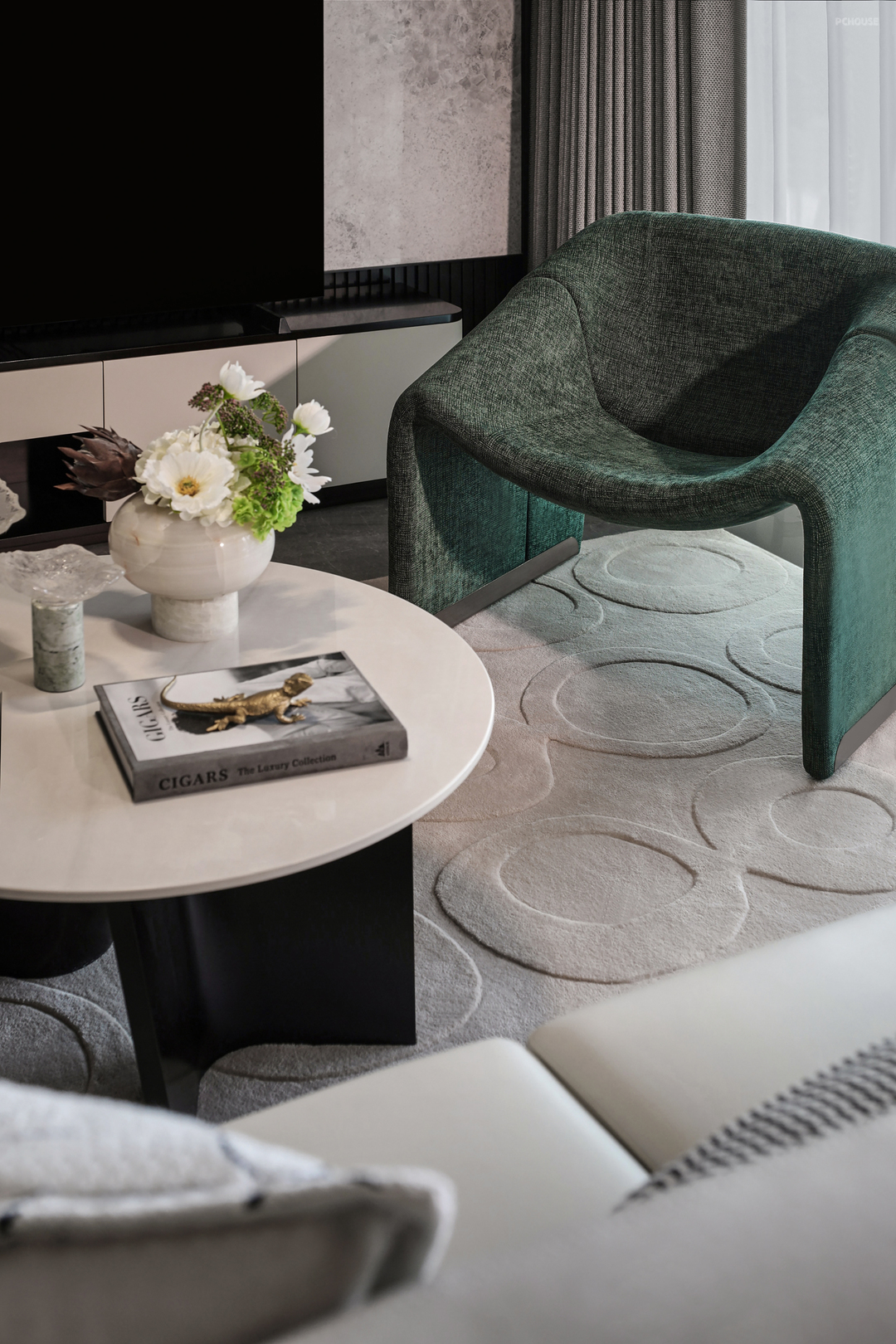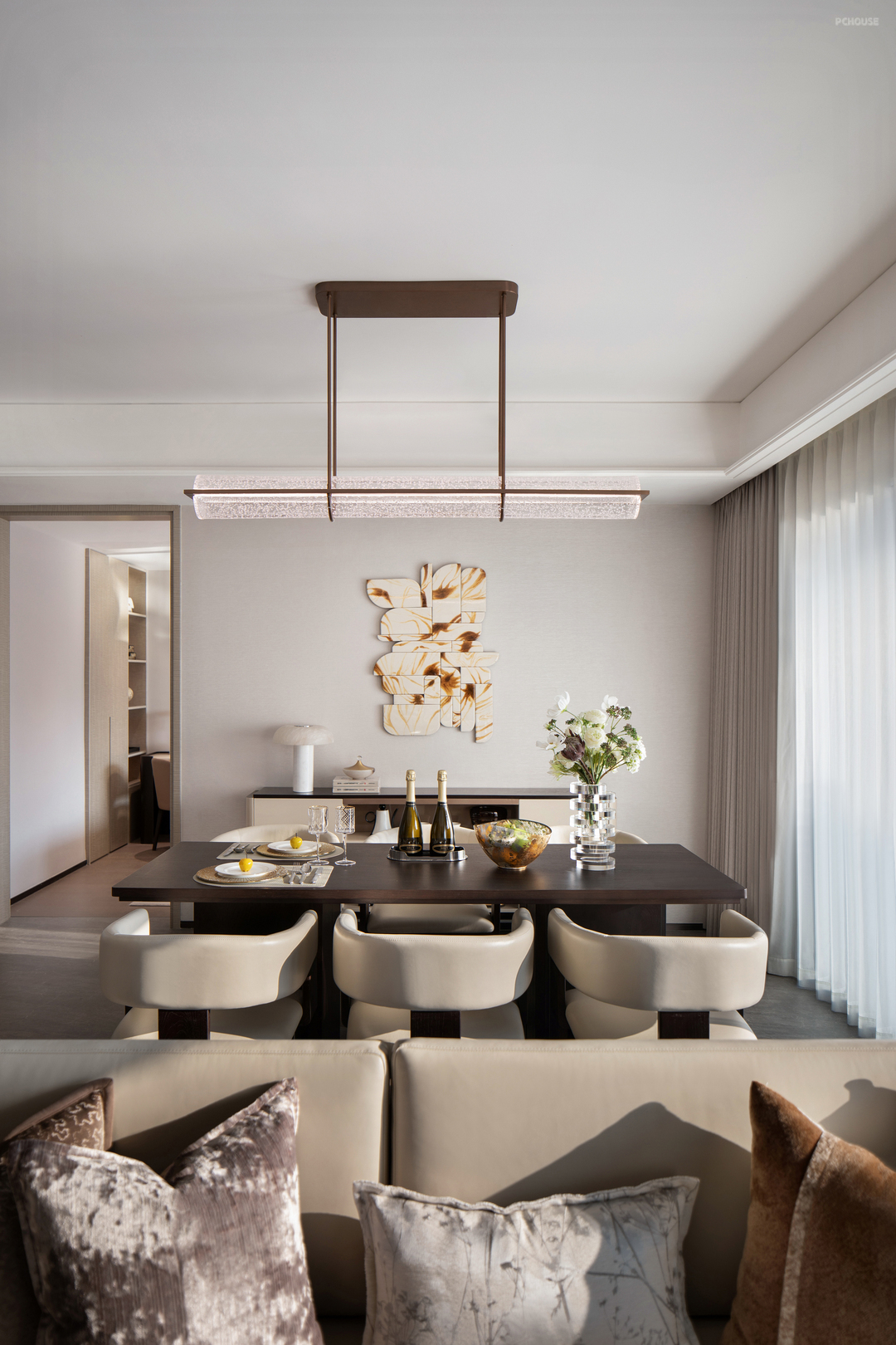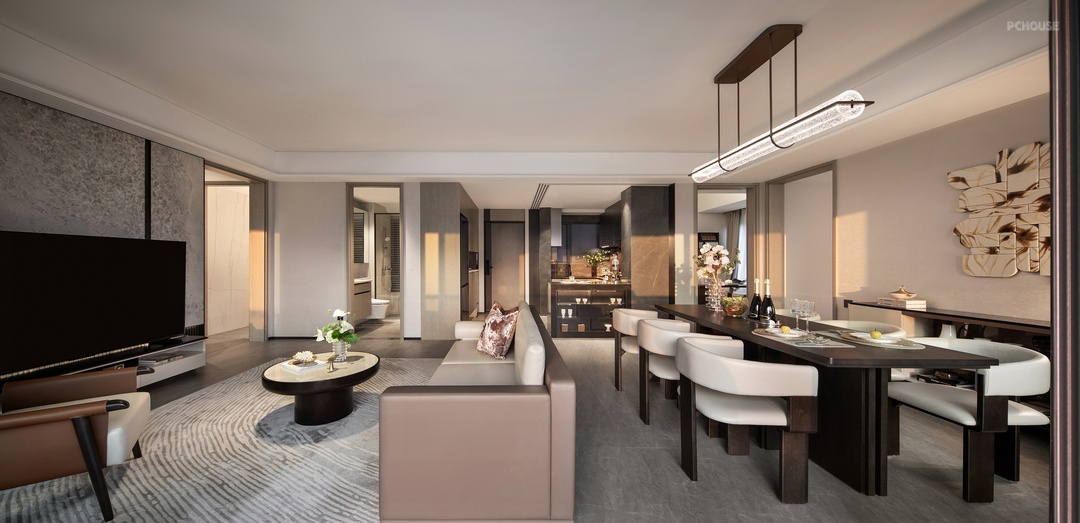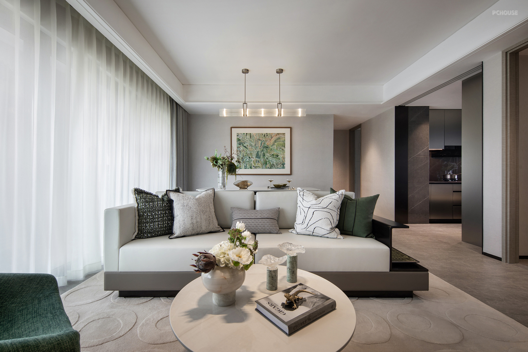 整体采用米白、浅灰等浅色调为基底,搭配深棕、墨绿等色彩点缀,辅以金属、玻璃等材质,营造出优雅大气又不失温馨的居住氛围。