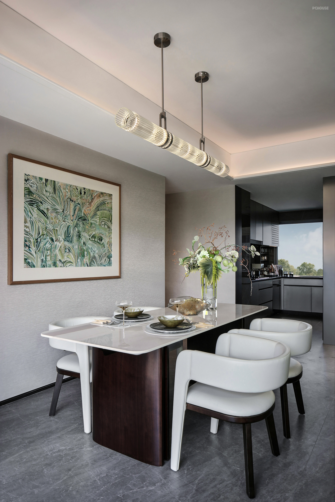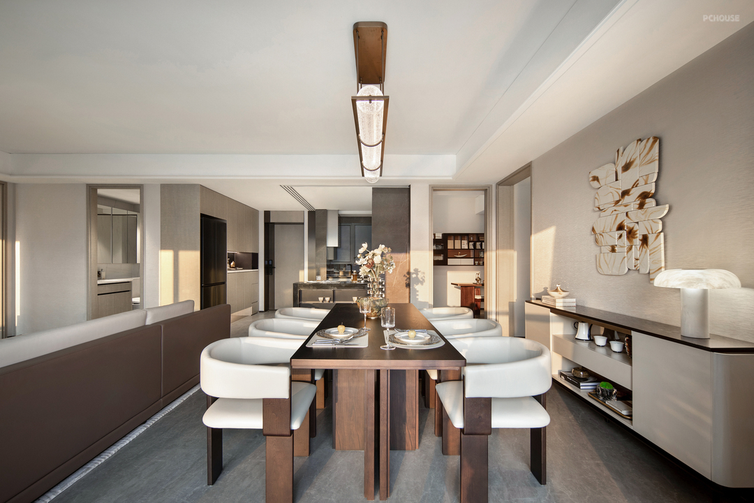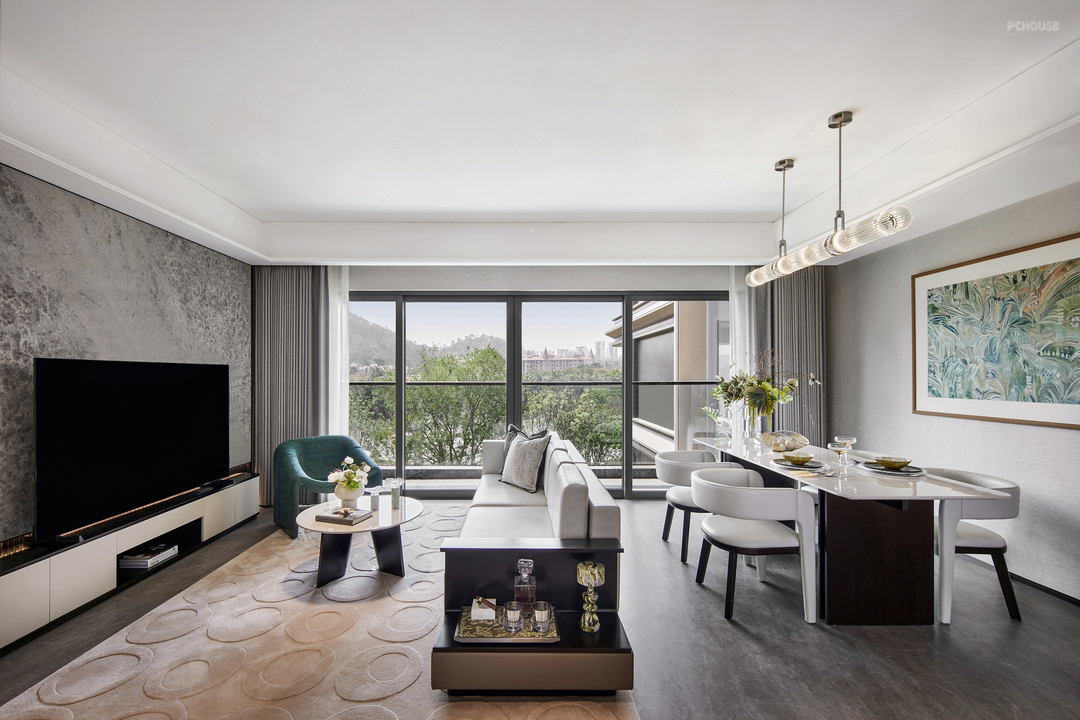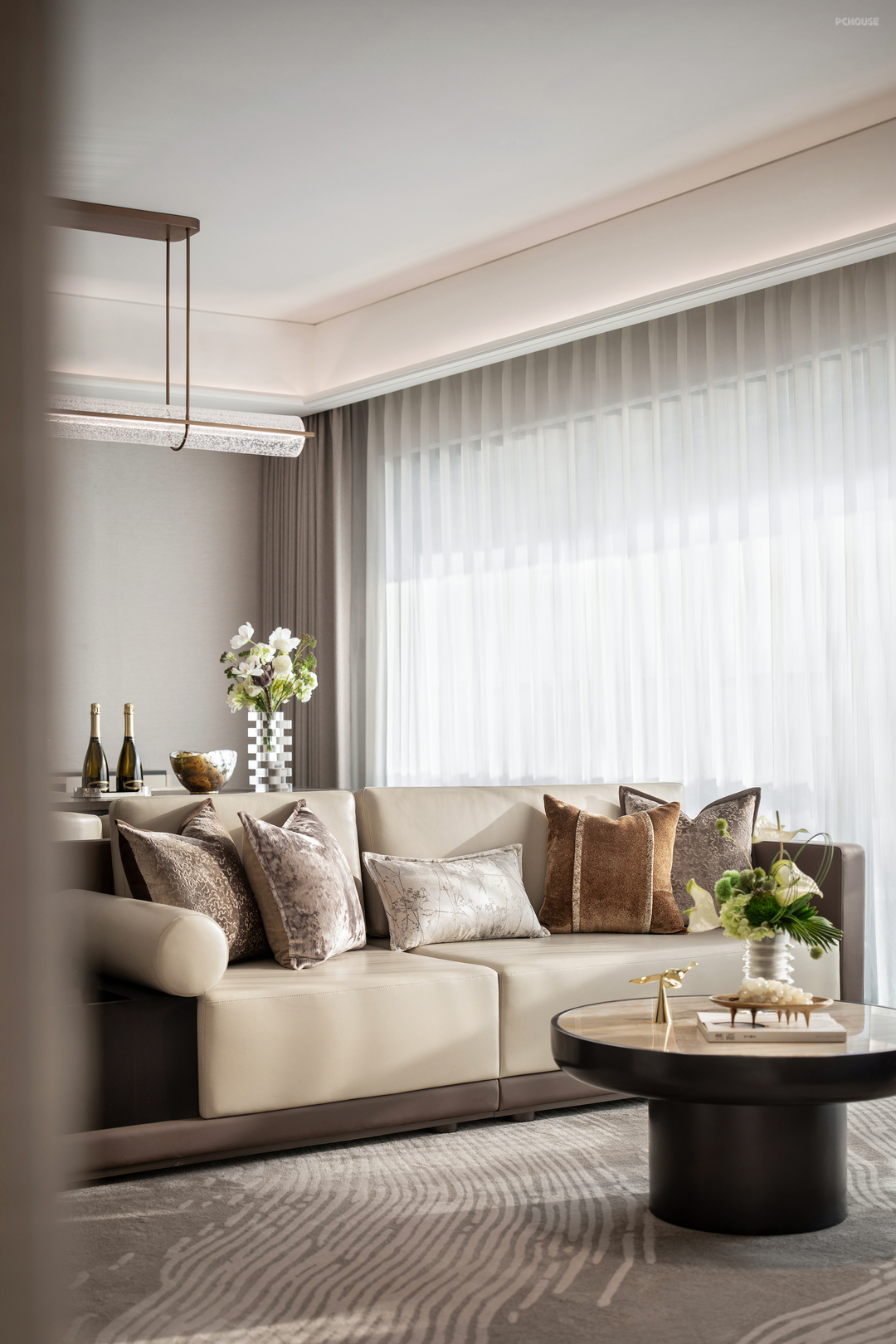 整体采用米白、浅灰等浅色调为基底,搭配深棕、墨绿等色彩点缀,辅以金属、玻璃等材质,营造出优雅大气又不失温馨的居住氛围。