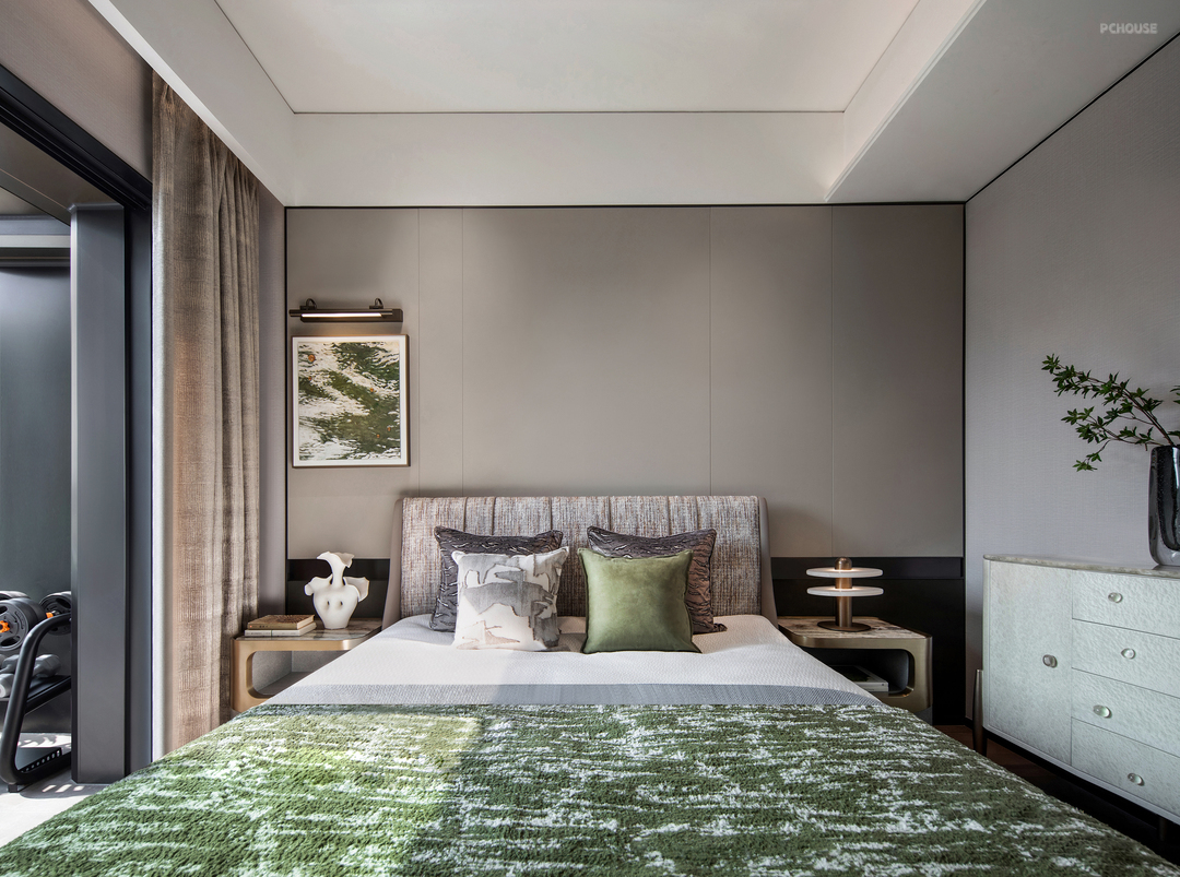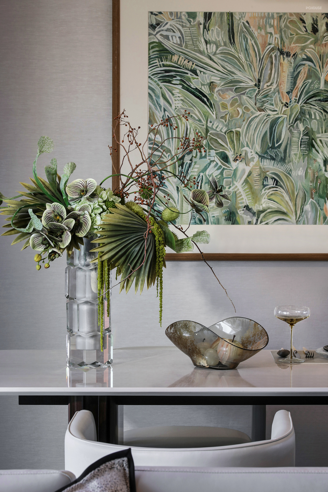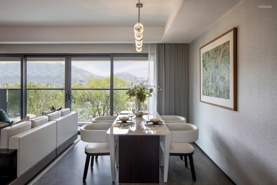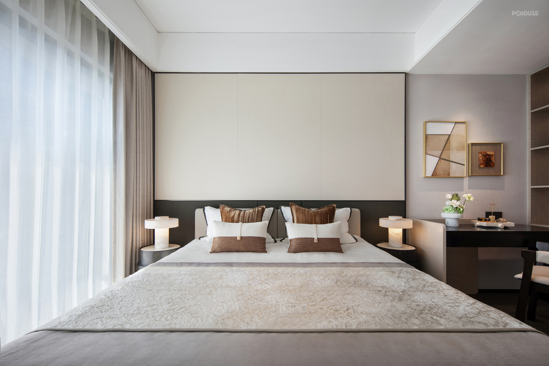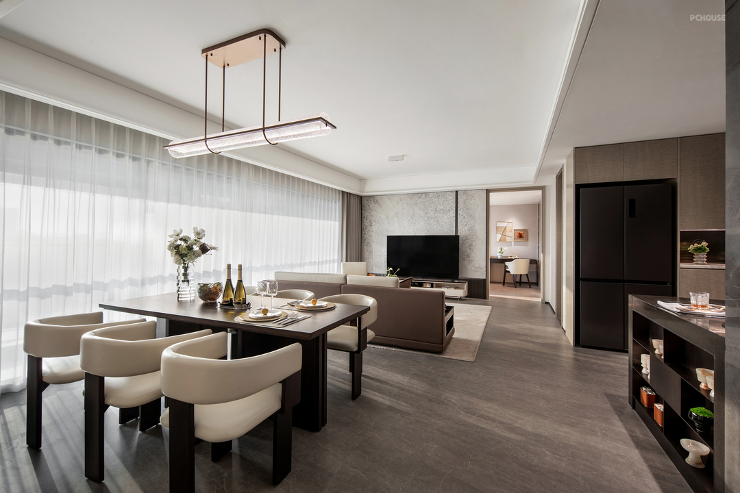 整体采用米白、浅灰等浅色调为基底,搭配深棕、墨绿等色彩点缀,辅以金属、玻璃等材质,营造出优雅大气又不失温馨的居住氛围。