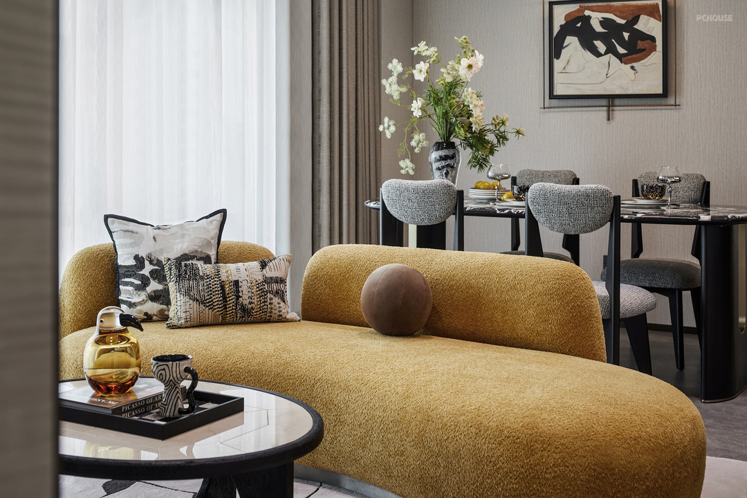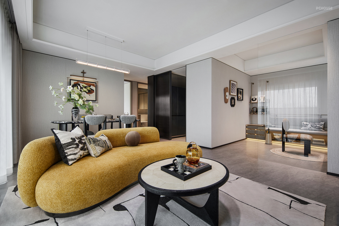 客厅以一张造型破格的明黄色异形布艺沙发为视觉锚点 —— 流畅的弧线轮廓打破空间方正感,鹅黄布艺如暖阳倾洒,在浅灰肌理墙面与大理石地面的基底上跃动生辉。