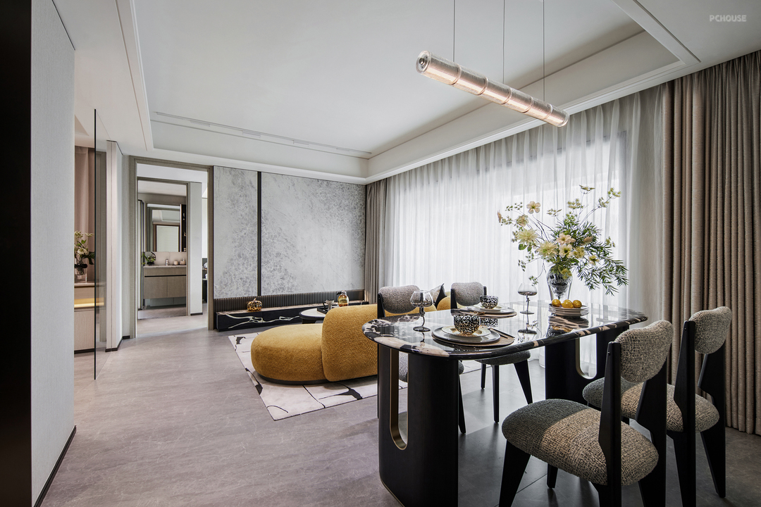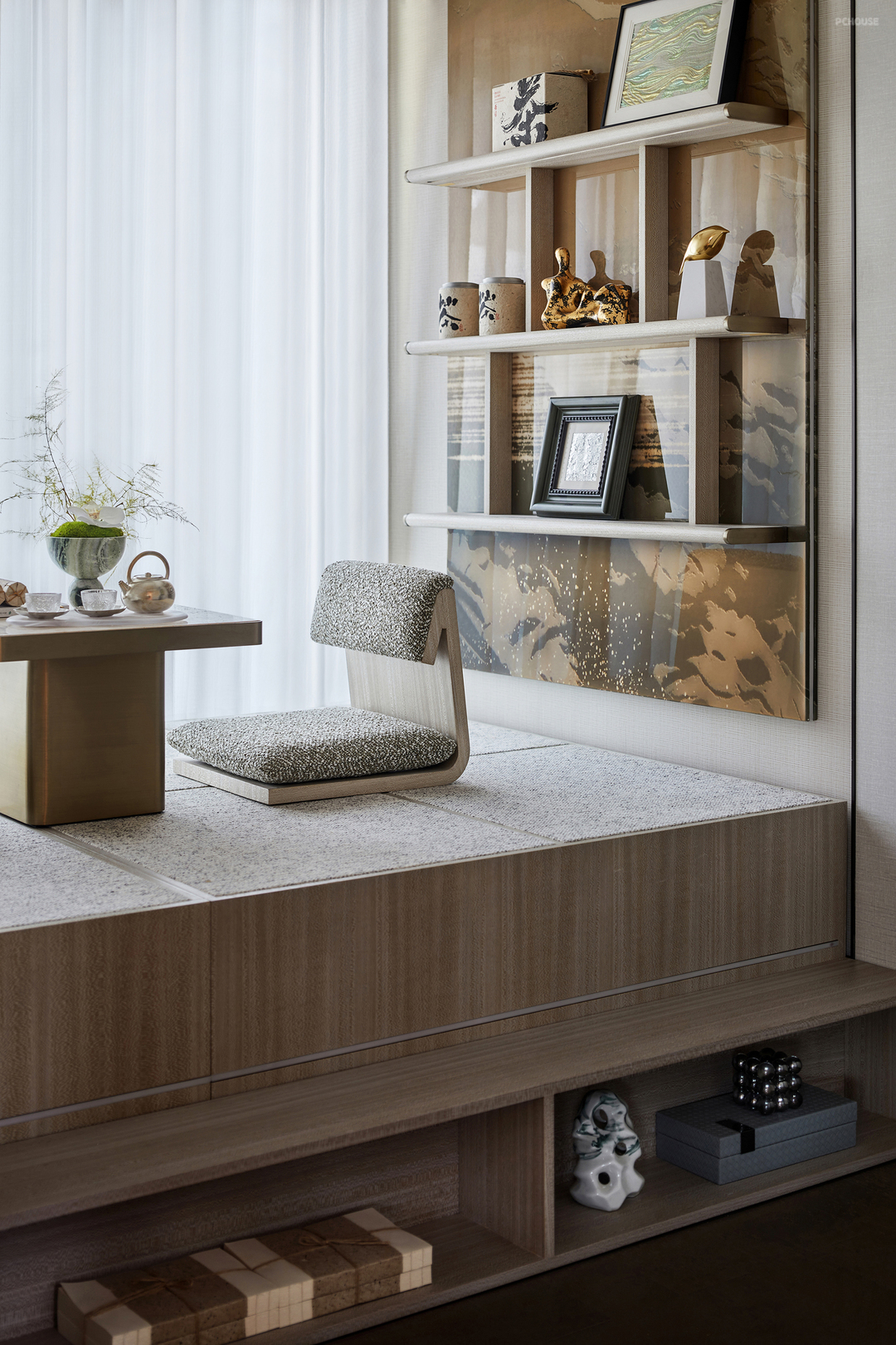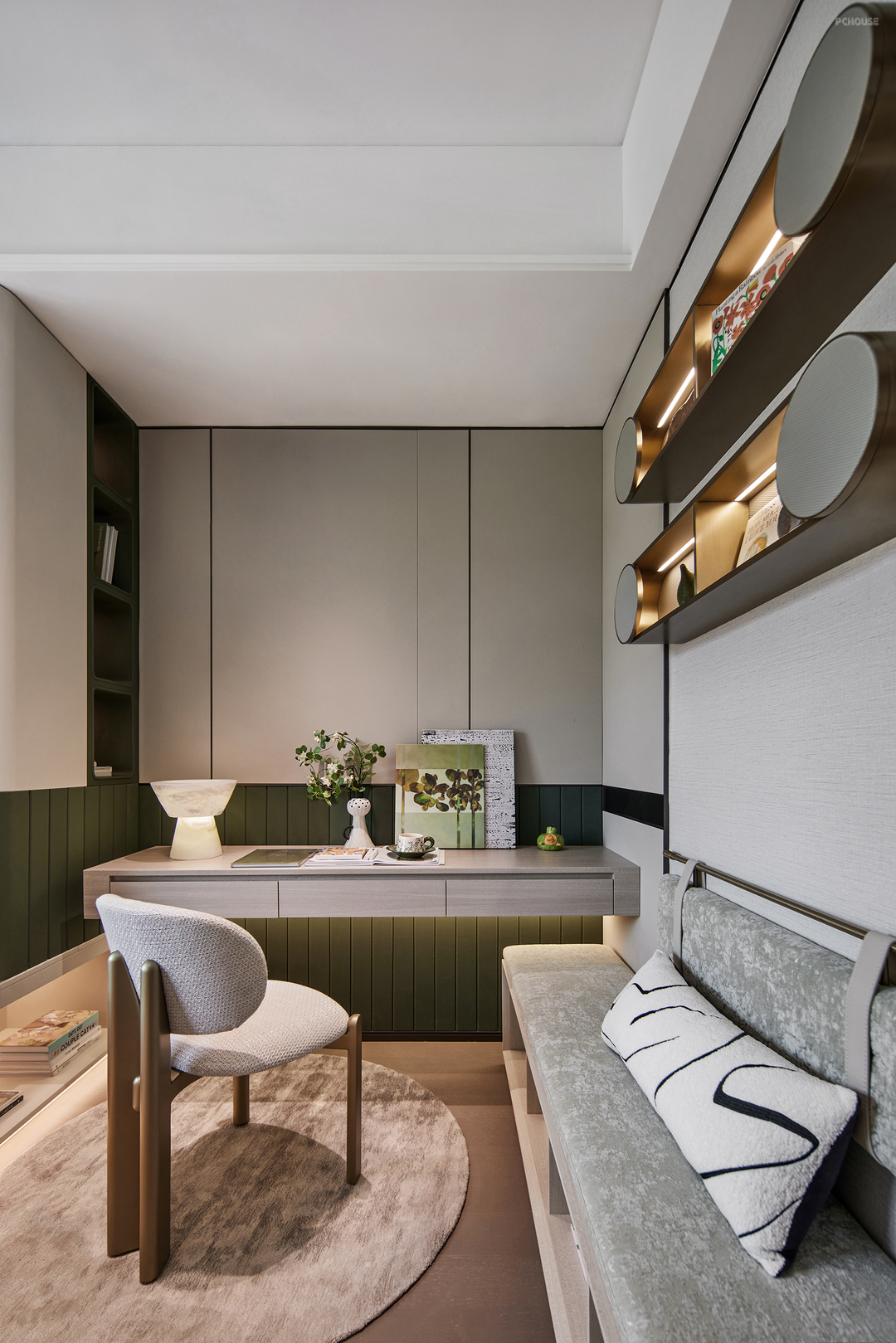 休闲娱乐区与客厅、餐厅自然衔接,米色座凳依窗而设,在这里,女主人能伴着晨光舒展身姿,沉浸于瑜伽的宁静;一家人可围坐闲谈,沐浴在阳光与欢笑中;亦可独处画画,阅读,在诗意与窗外景致交融的氛围里,享受惬意的休闲时光 。