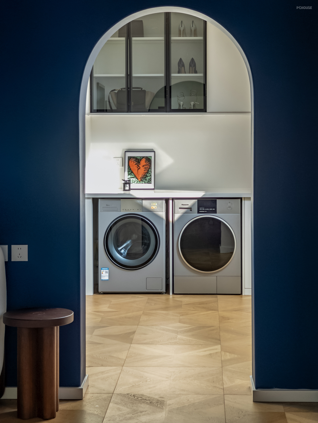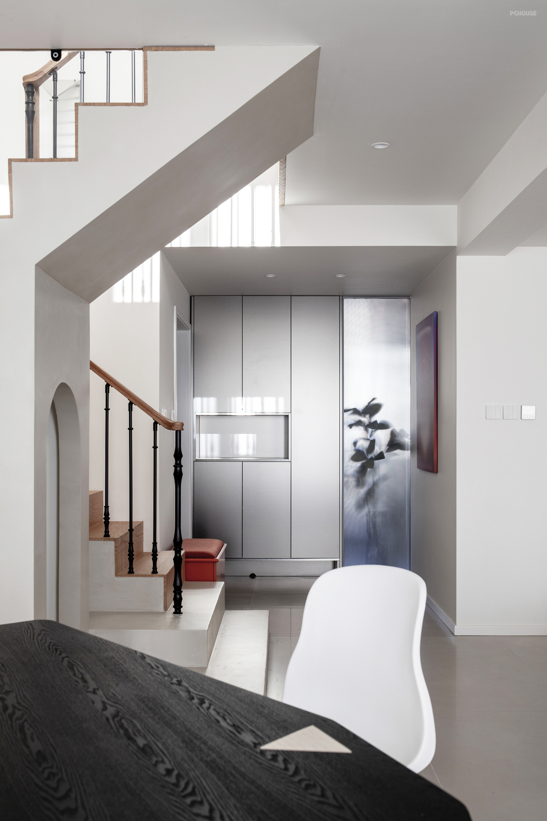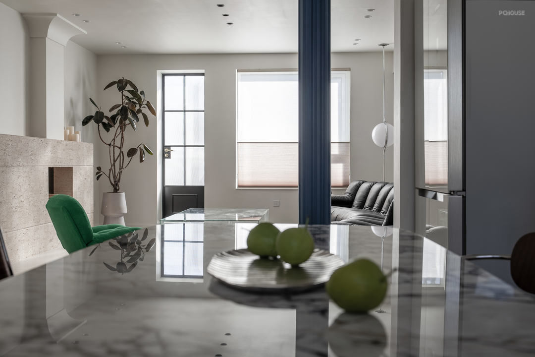 磨砂玻璃门透出光亮,将生活的温热透进归家人的心堂。整体鞋帽柜收纳琐碎,也隔断油烟和另一空间的独立声响。调整动线、通透采光,入户舒适、明亮。此外,大片冷色调中的经典极光红鞋凳(出自造作美术馆),瞬间以浓郁的色彩点亮了这方空间。
