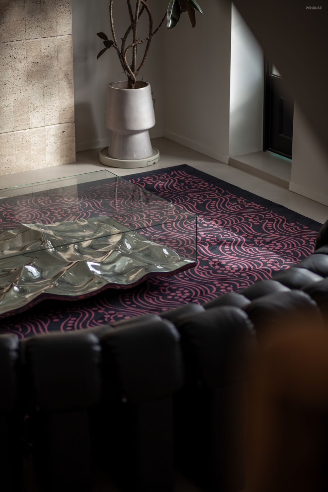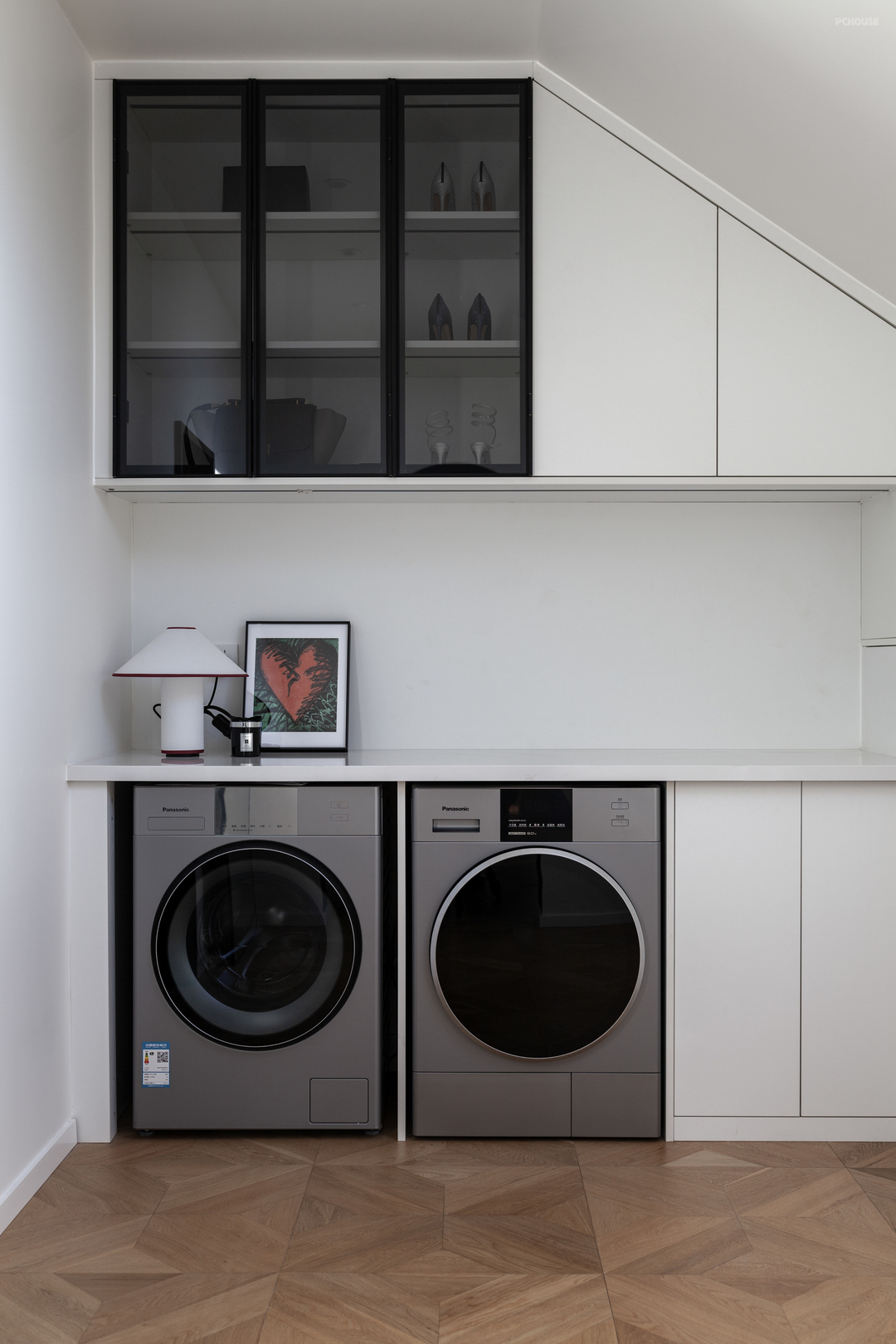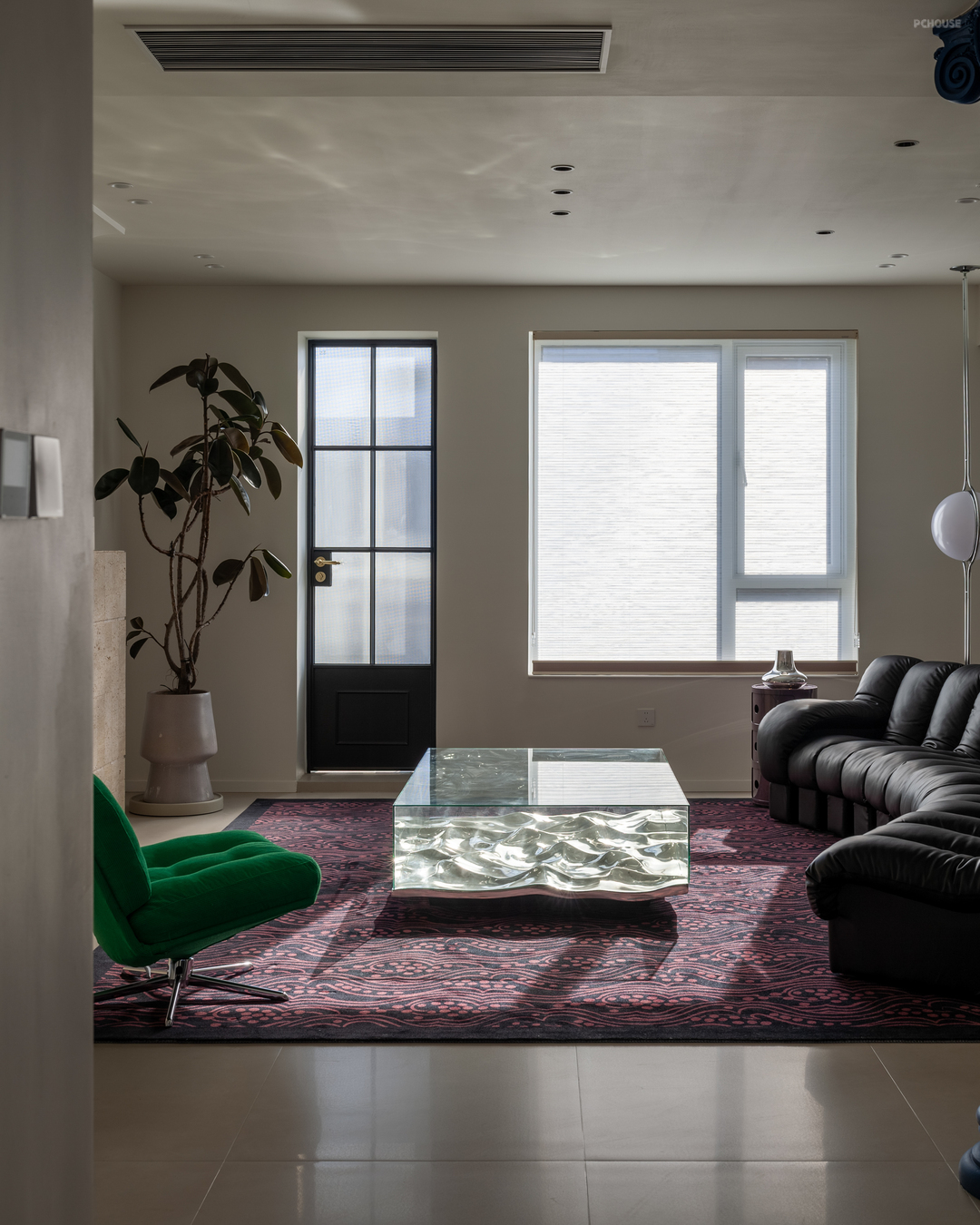 磨砂玻璃门透出光亮,将生活的温热透进归家人的心堂。整体鞋帽柜收纳琐碎,也隔断油烟和另一空间的独立声响。调整动线、通透采光,入户舒适、明亮。此外,大片冷色调中的经典极光红鞋凳(出自造作美术馆),瞬间以浓郁的色彩点亮了这方空间。