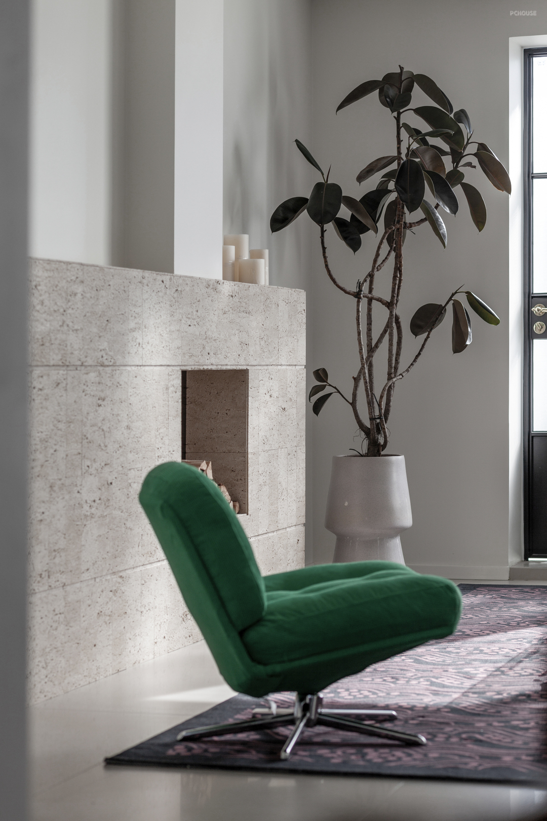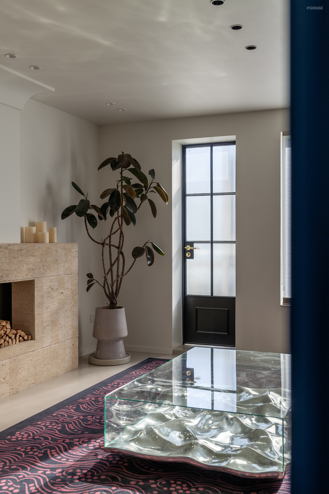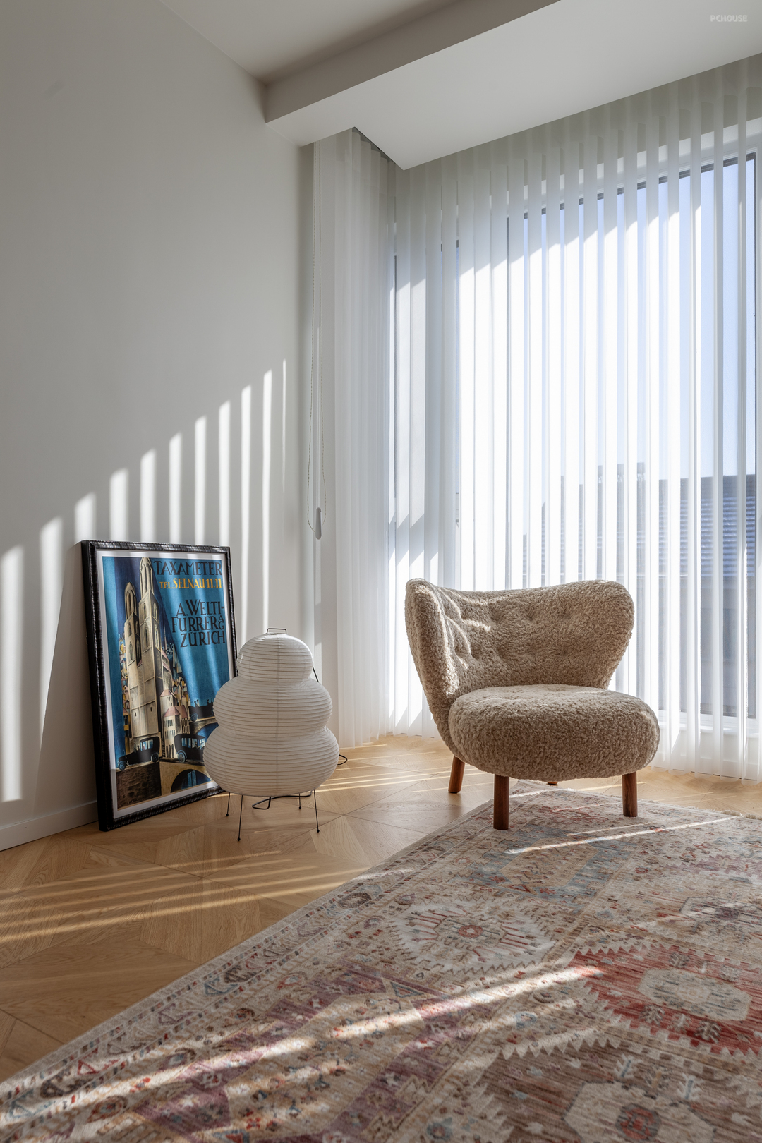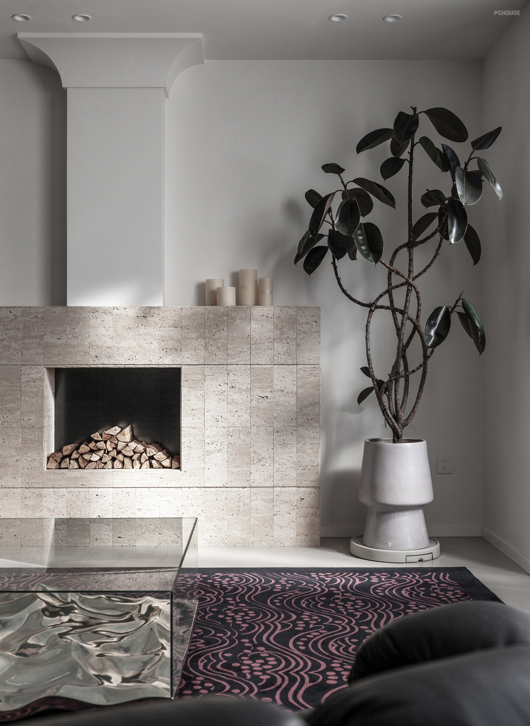 作为主要休闲区之一,客厅是打造折中氛围感的重要空间。黄洞石壁炉居中坐定,古典的氛围也随之蔓延开来,搭配经典荚果纹地毯(出自UNDER LAND的繁花)和MILA(出自IKEA)转椅,让素雅的空间被热烈点缀,简约的线条被色彩装饰。