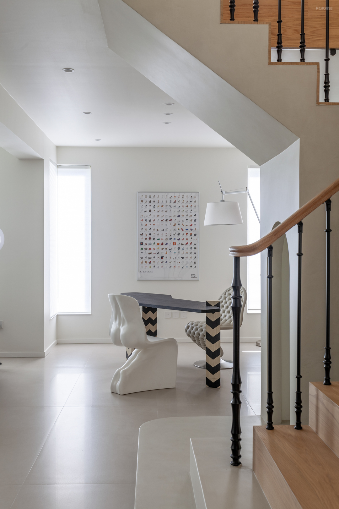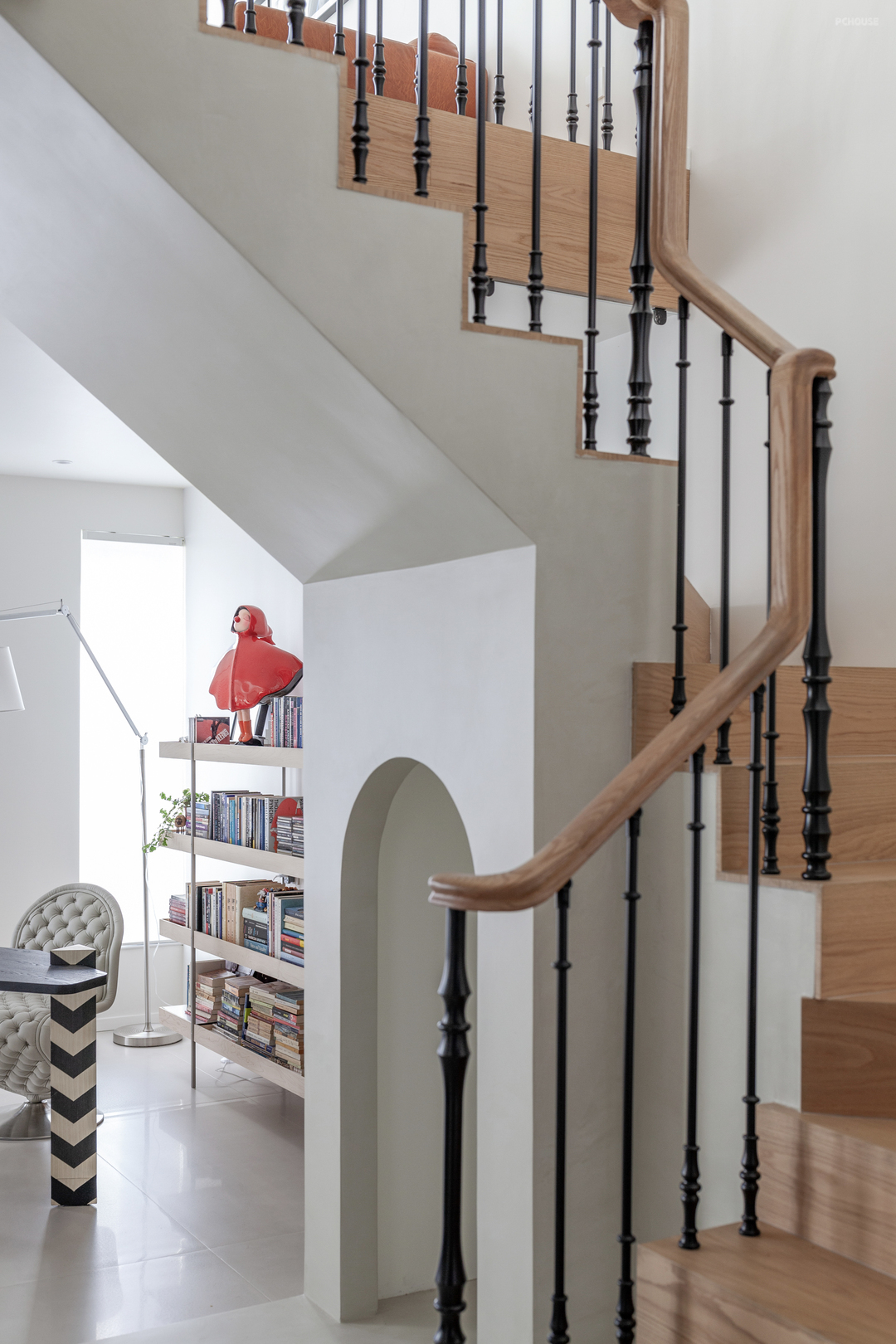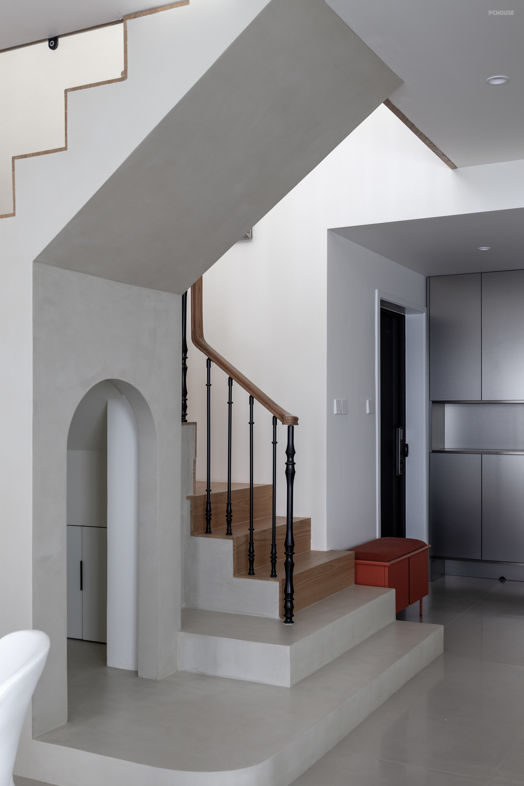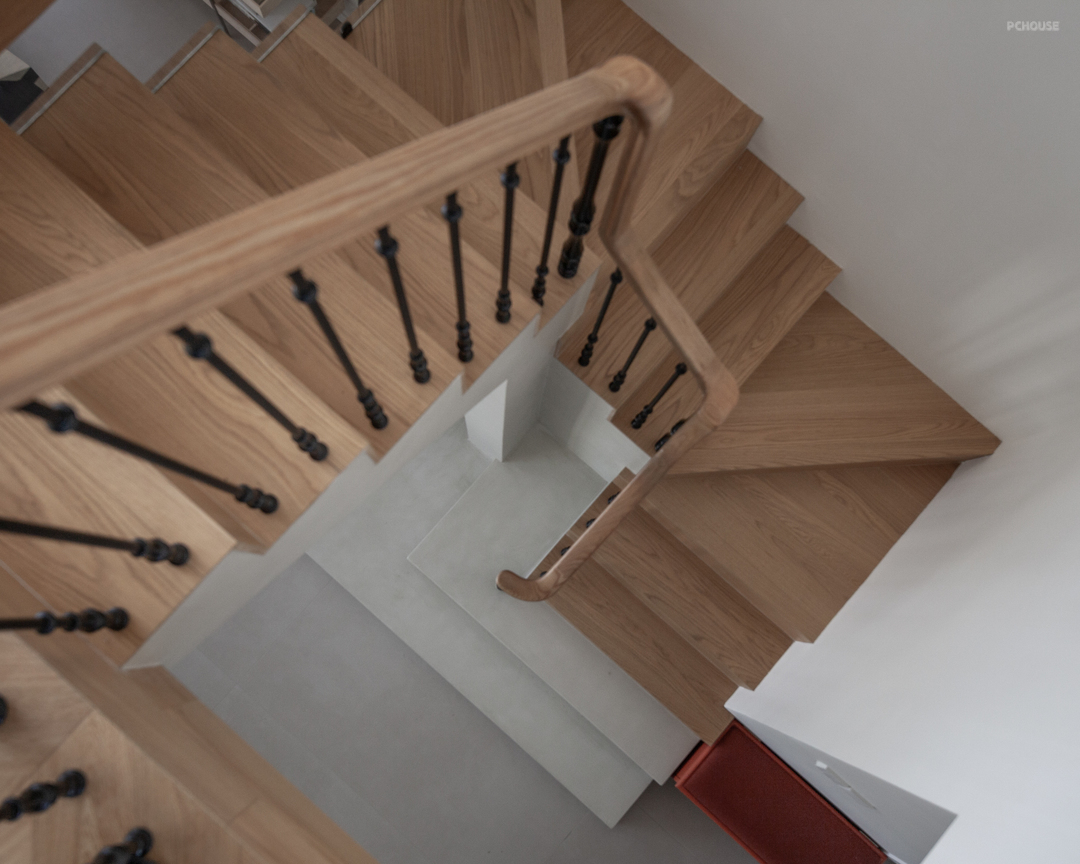 楼梯踏步的橡木材质与二楼地板浑然衔接,底部微水泥材料的应用,更是给设计带来了其他可能,延长拓展出的拱形猫洞,便是为两只猫猫量身定做的安憩之处。