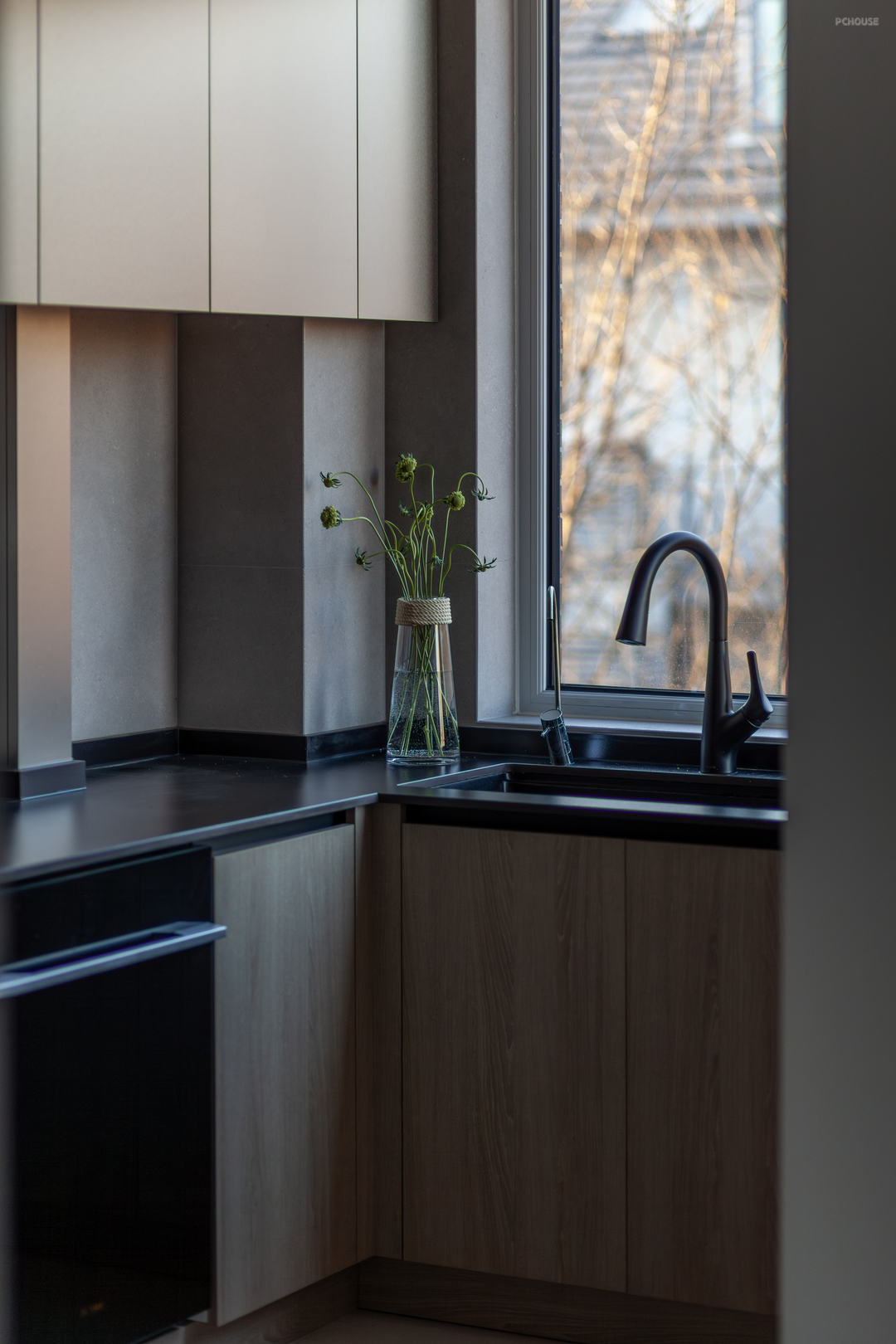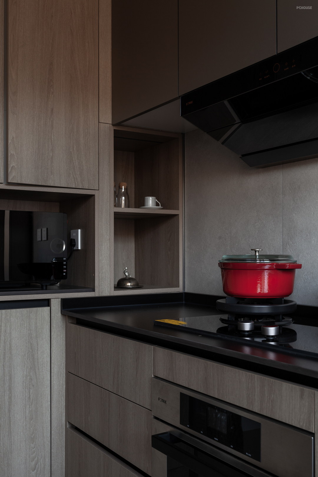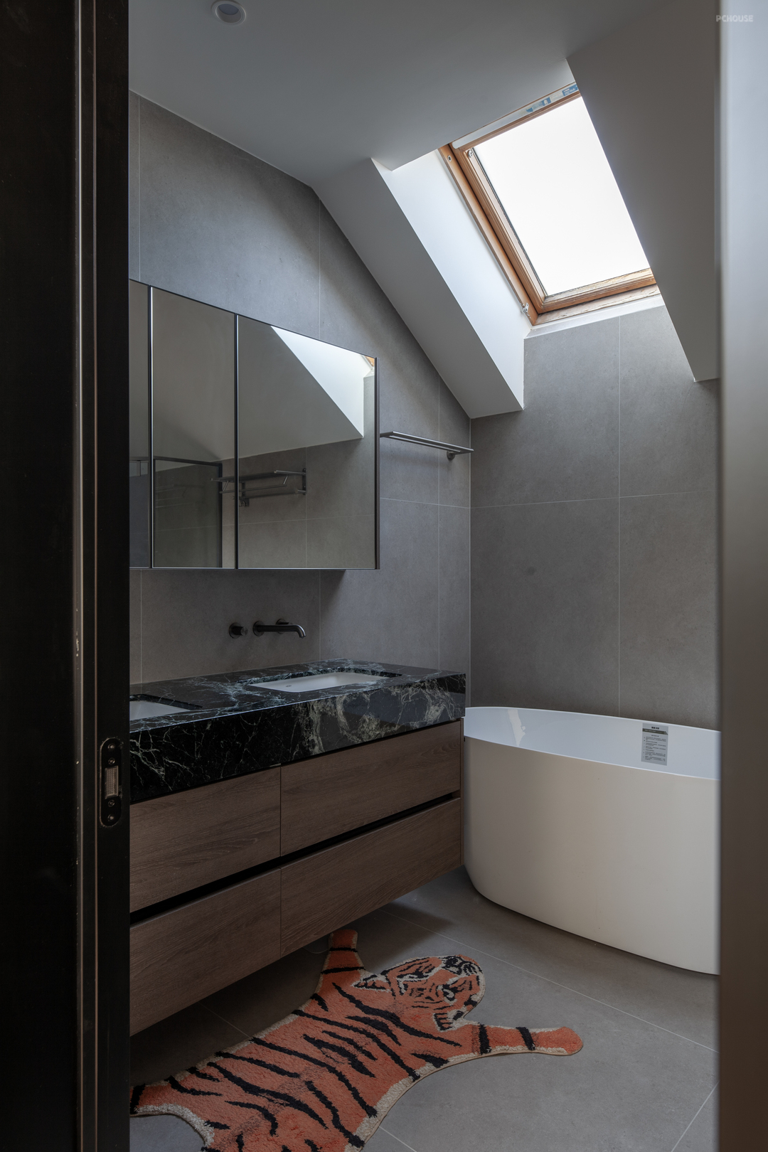 楼梯踏步的橡木材质与二楼地板浑然衔接,底部微水泥材料的应用,更是给设计带来了其他可能,延长拓展出的拱形猫洞,便是为两只猫猫量身定做的安憩之处。