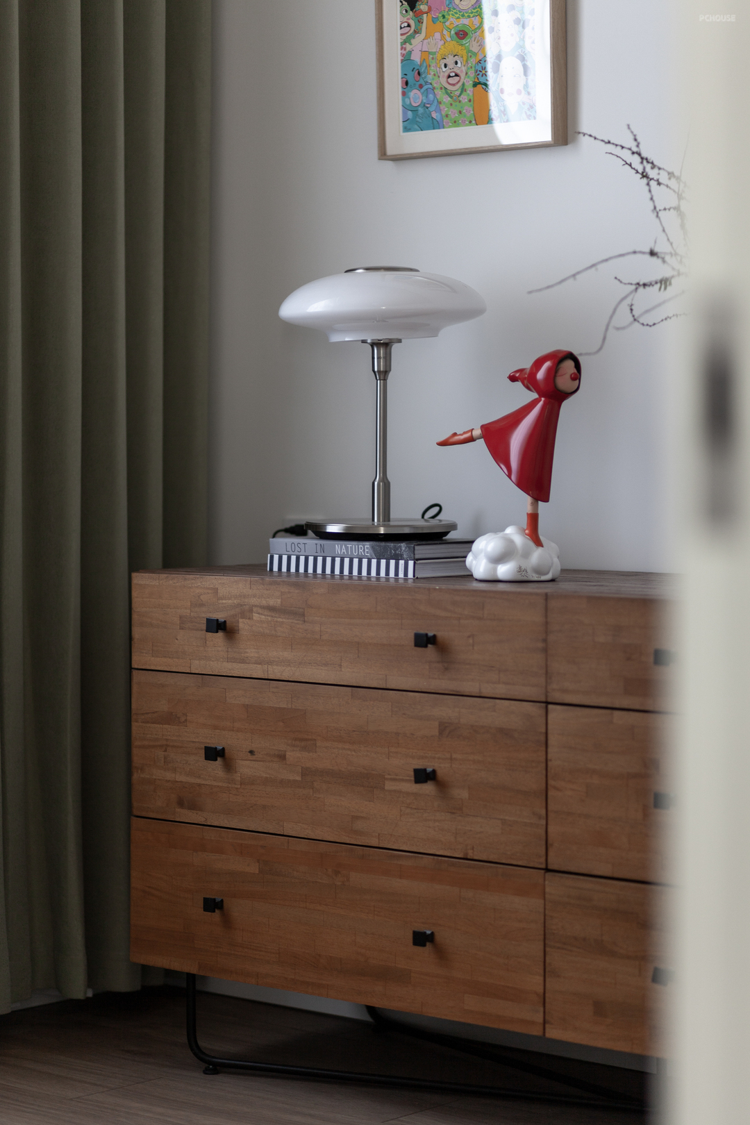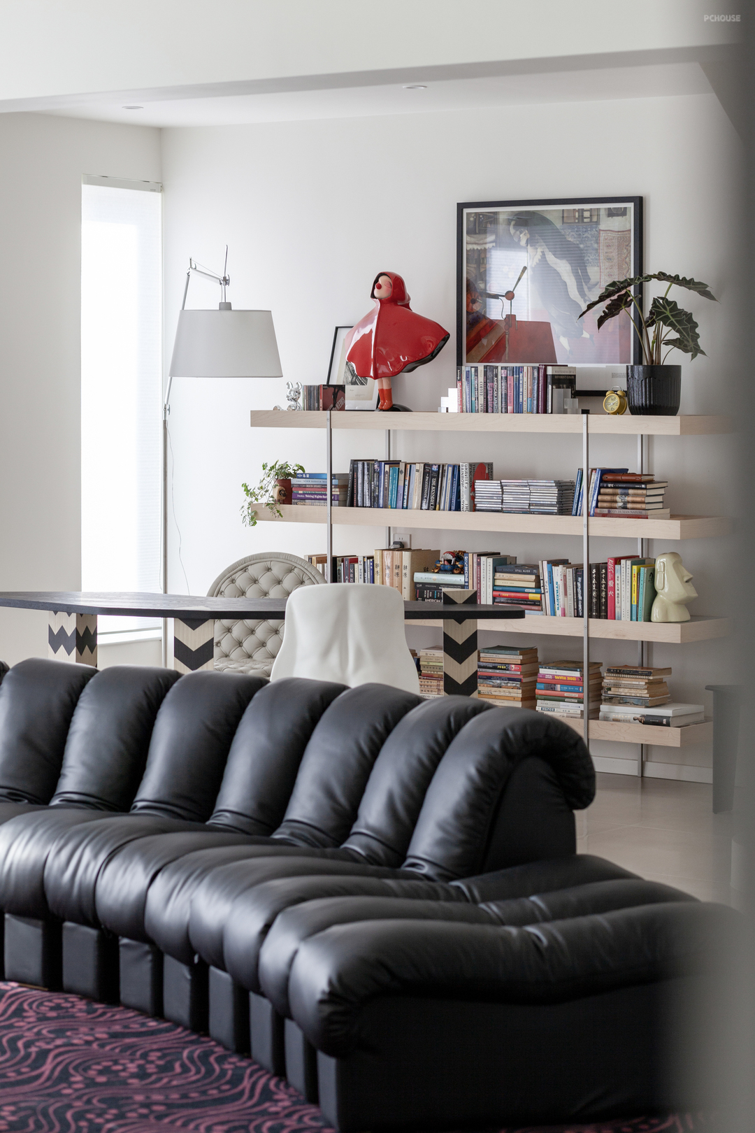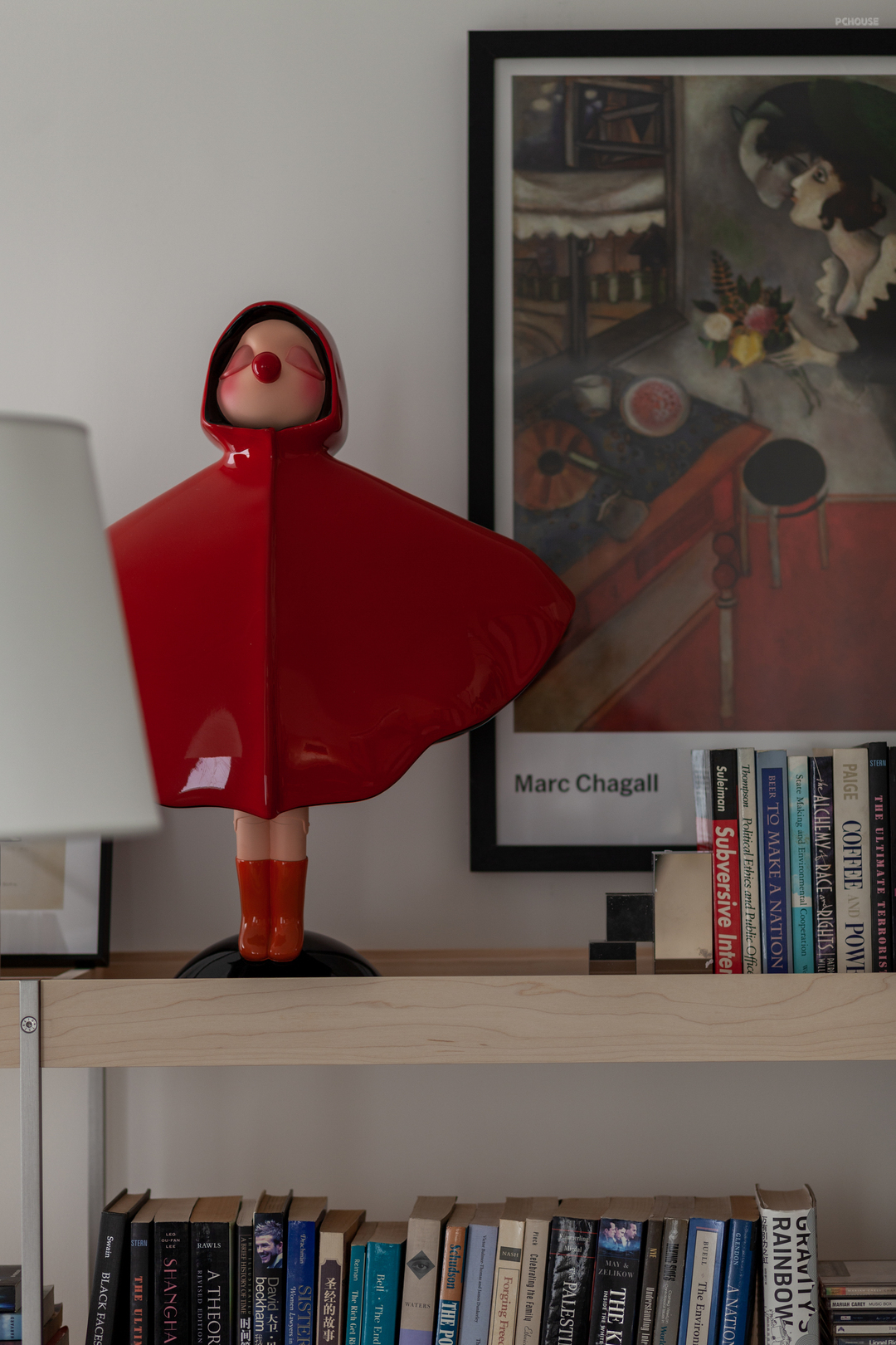 亮眼的惠唯艺术家签名雕塑《自由》与Marc Chagall马克夏加尔《生日》超现实油画的对话,红色装饰与浅色木质书架相称相应,惠唯艺术家的签名款摆件,是旅行途中的时刻惦念。细碎的幸福收纳再辅以简约的线条与纹饰沉淀了复古底蕴,与色彩鲜活实现亦庄亦谐的微妙之感。