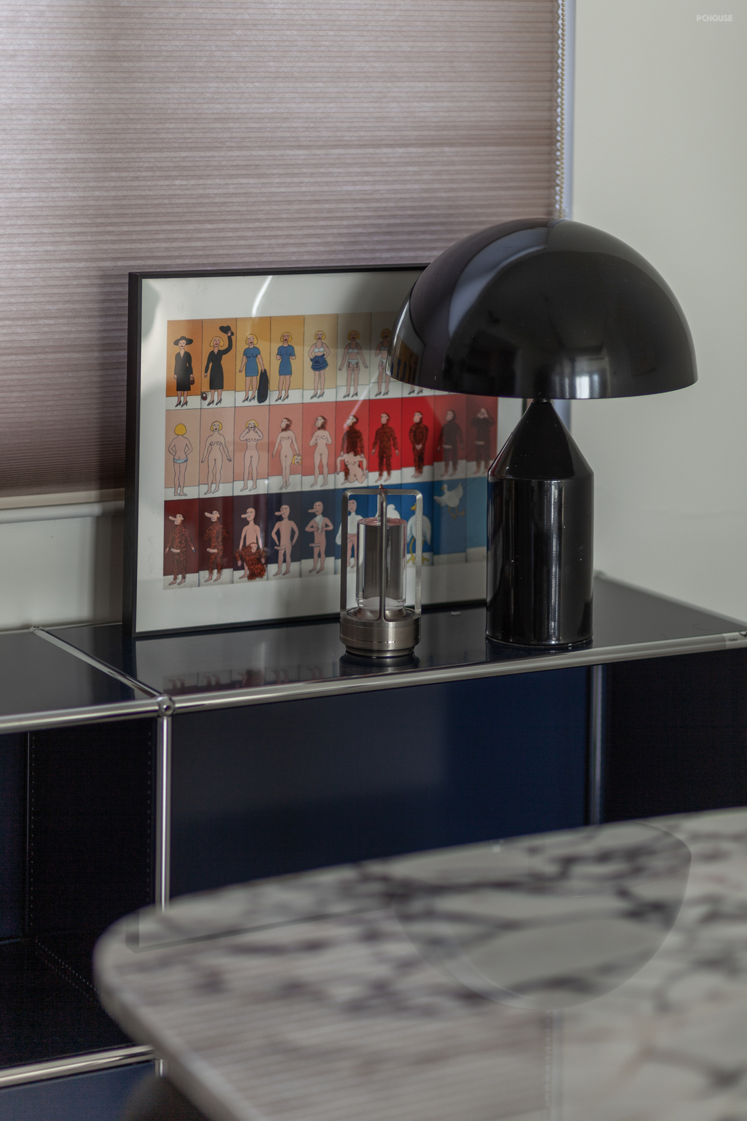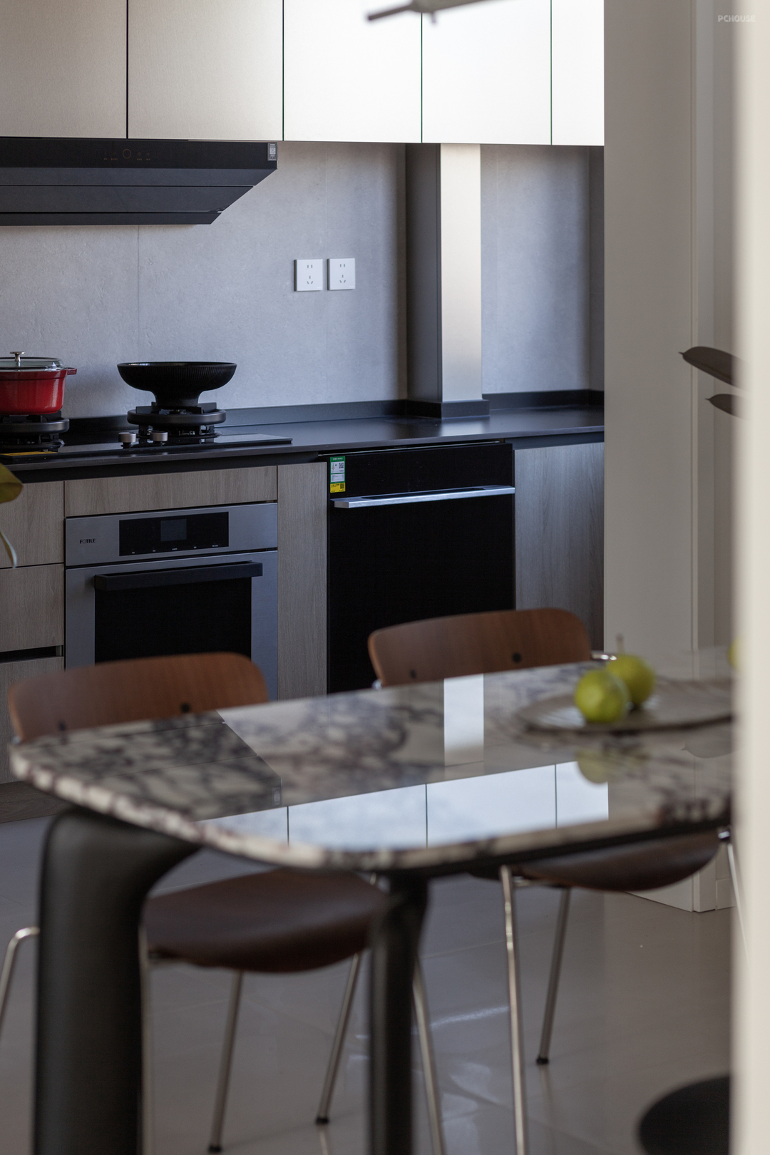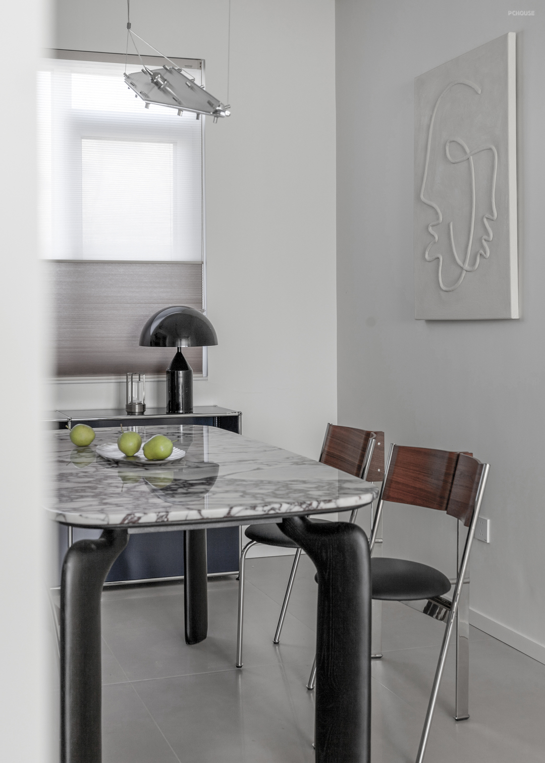 餐厨之间的相通延长视界深度,吻和空需的同时,观感上也流畅、舒适。橱柜沿用门厅处的金属感门板,与黑色台面的和谐相映。餐边那一抹浓郁的蓝色,与宝格丽石材桌面相互辉映,加以毕加索名作的装饰,无不体现屋主的审美底蕴。