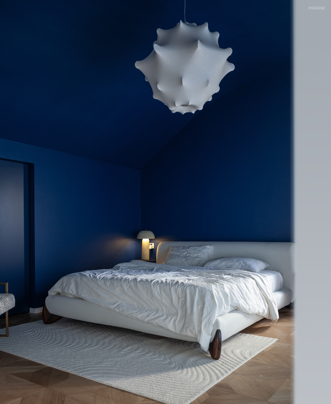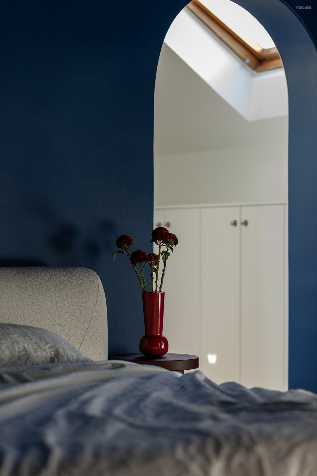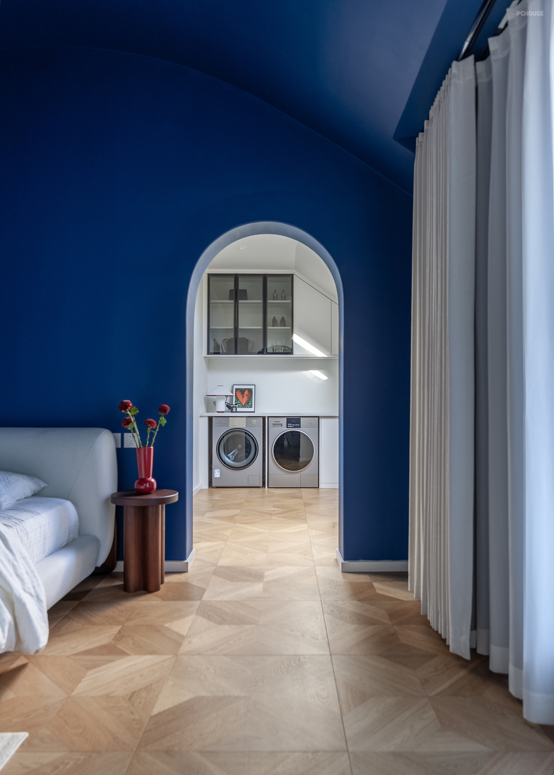 主卧以浓郁的米克诺斯蓝通刷墙面,呼应一楼点缀色的同时,也契合了屋主的喜好,充满混搭复古氛围。顶面依原建筑结构做圆顶设计,辅以独特的灯饰与经典柔和的木质家装,使浪漫和松弛并存。
