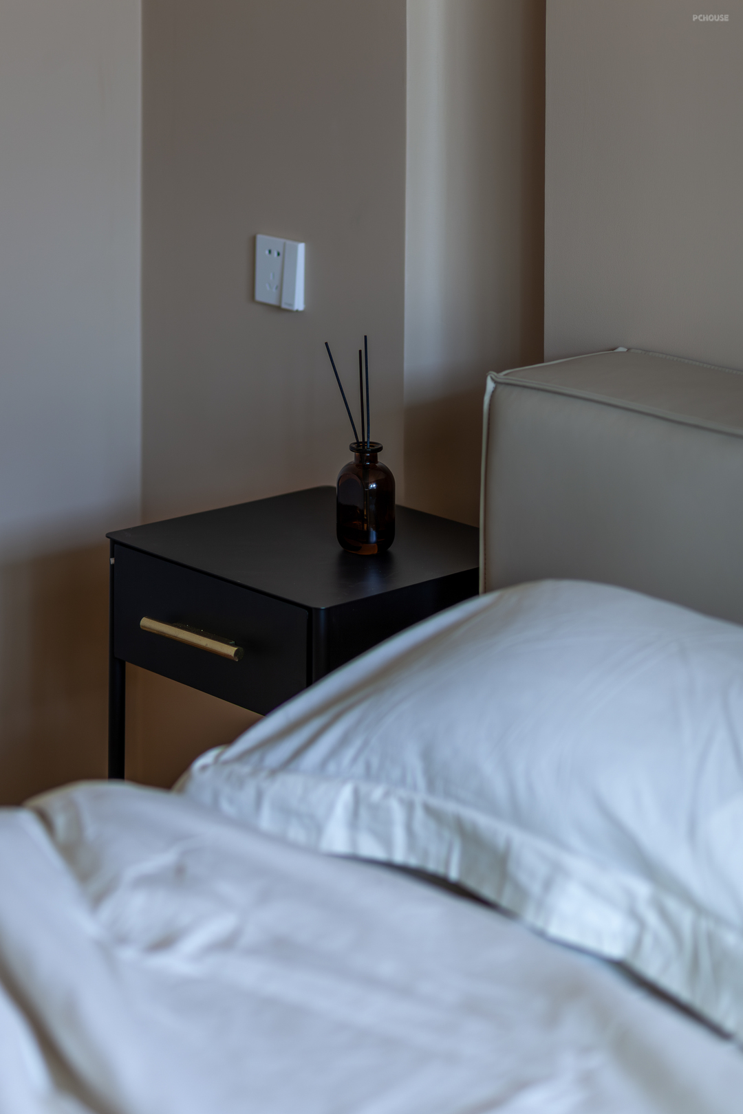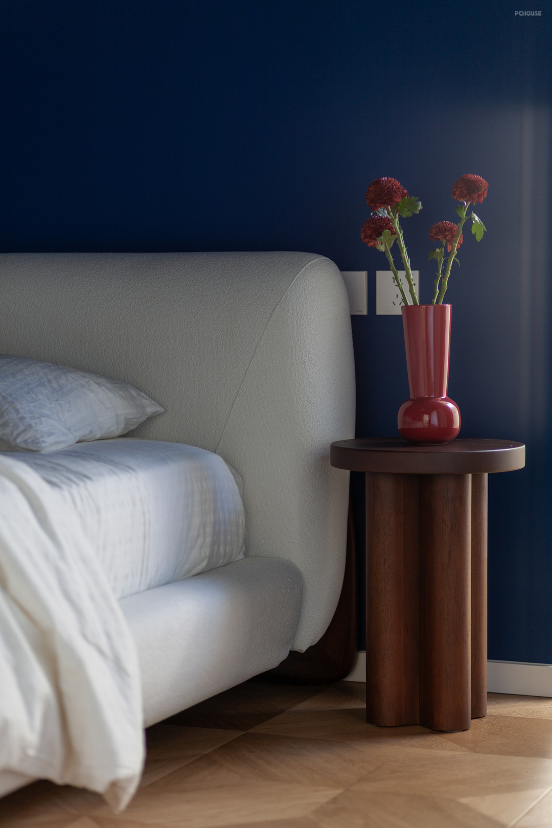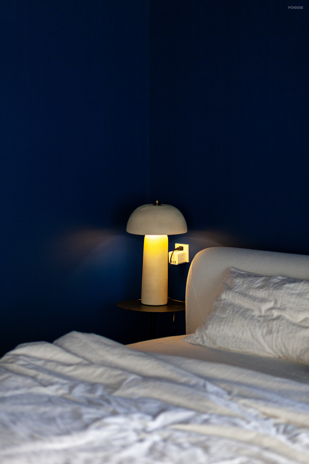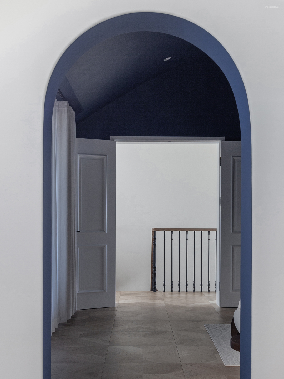 主卧以浓郁的米克诺斯蓝通刷墙面,呼应一楼点缀色的同时,也契合了屋主的喜好,充满混搭复古氛围。顶面依原建筑结构做圆顶设计,辅以独特的灯饰与经典柔和的木质家装,使浪漫和松弛并存。