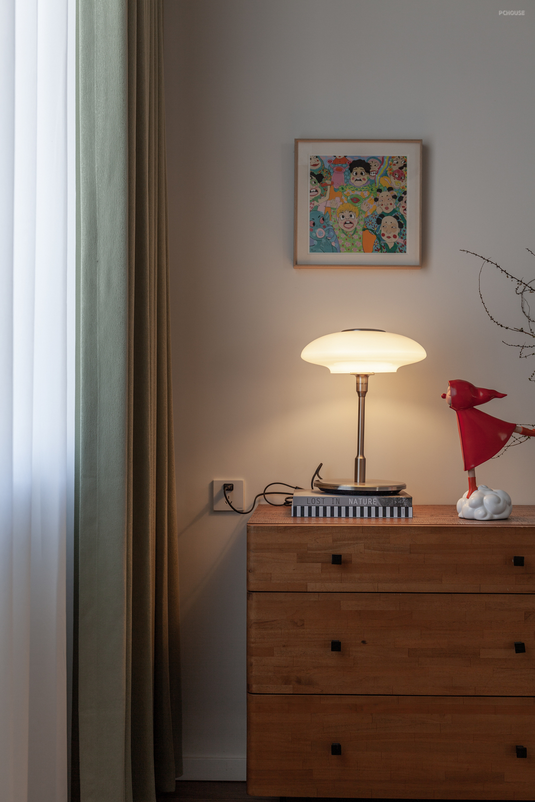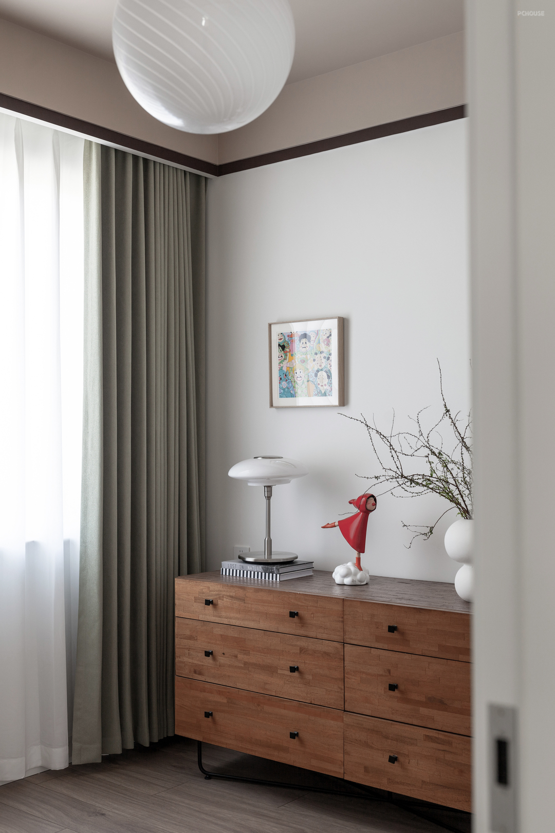 柔和明亮的色调复古而不沉闷、简约伸展的线条整洁而不单一,满是趣味的墙面与屋顶,Vintage奶白棒棒糖玻璃吊灯……一处处设计的背后,都是屋主对孩童爱意和期待。